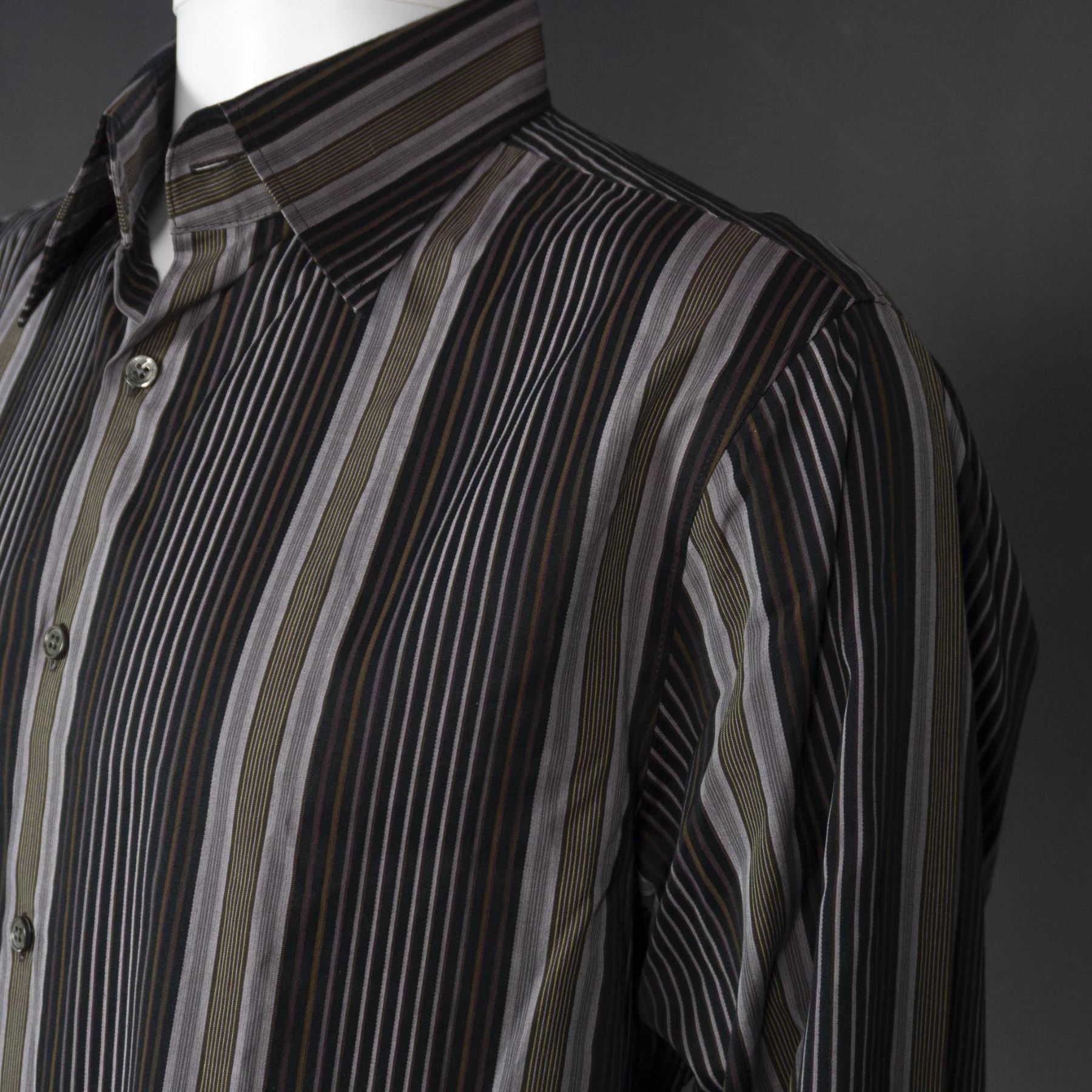 This duo of men's designer shirts includes a stylish Bugatchi shirt featuring a grey striped pattern with circle accents and detailed cuffs. It is marked as shaped fit and measures 31.5"L in length and 24.5"W across the chest. The second is a sleek Theory shirt designed with vertical stripes in rich plum tones, accented with brown, white, and black. It is marked size L and measures 30"L in length and 22"W across the chest. Perfect additions to any wardrobe. Dimensions: See Description
