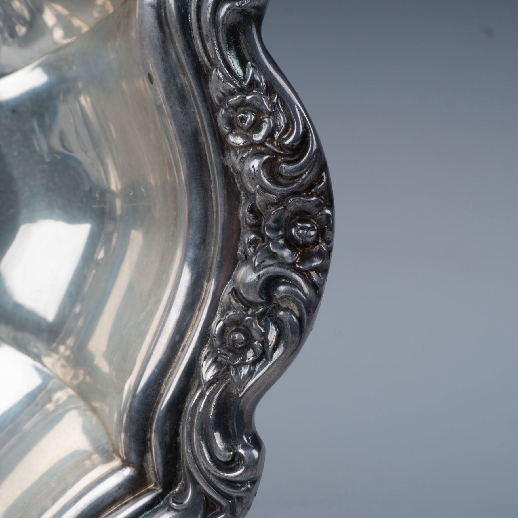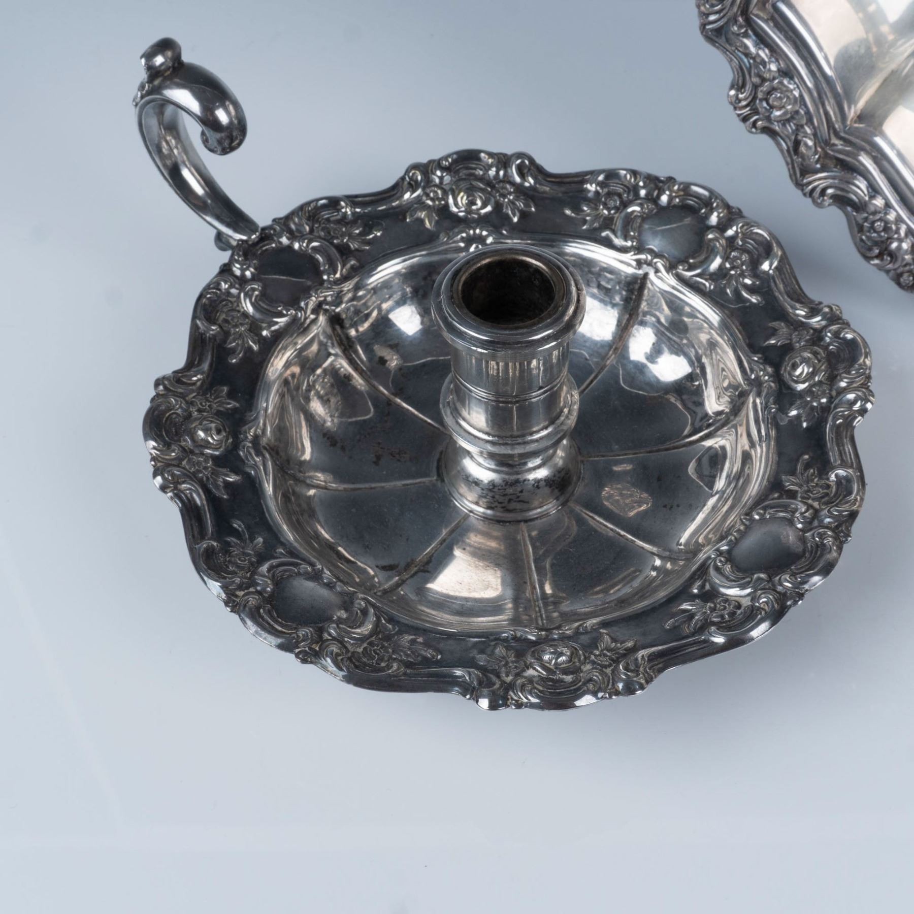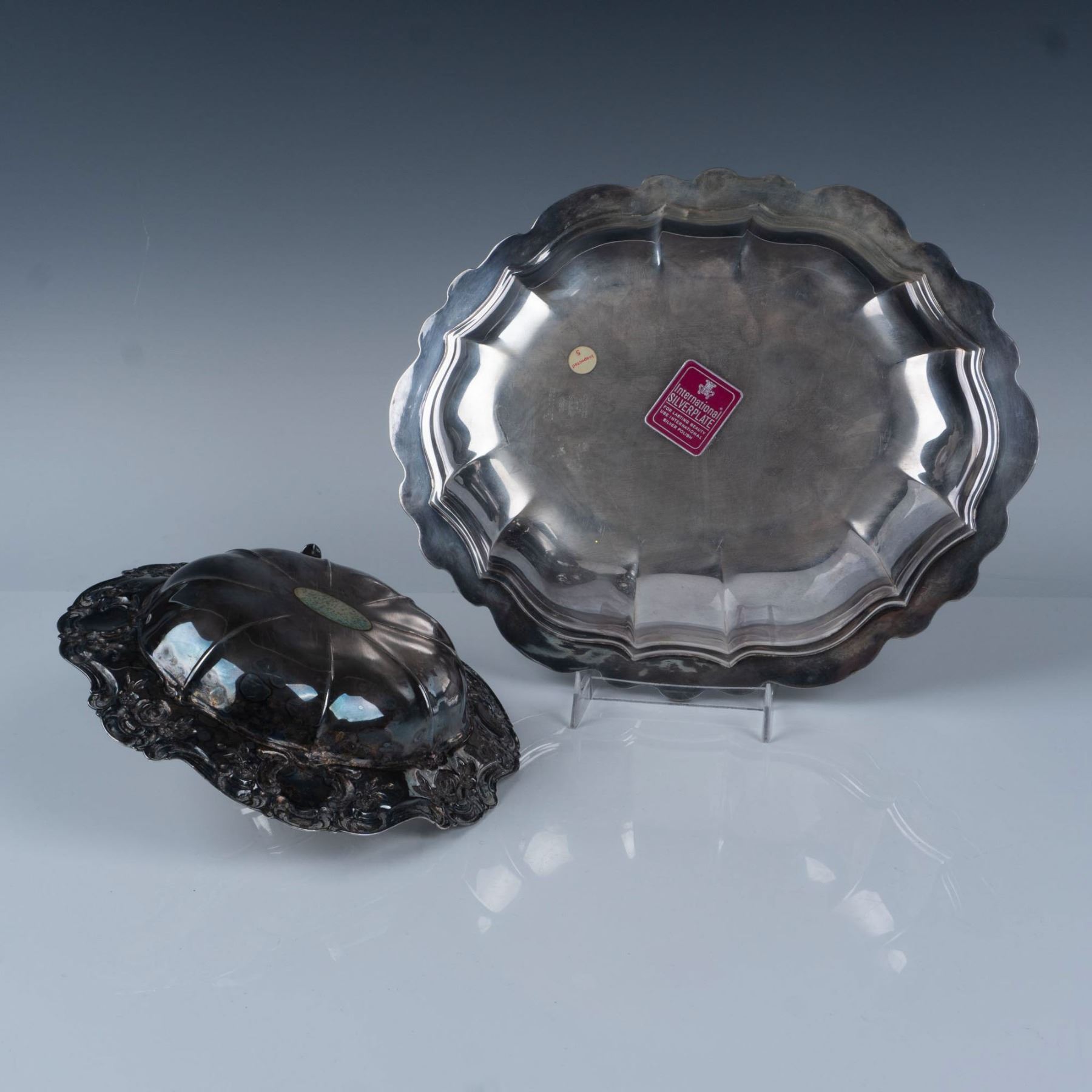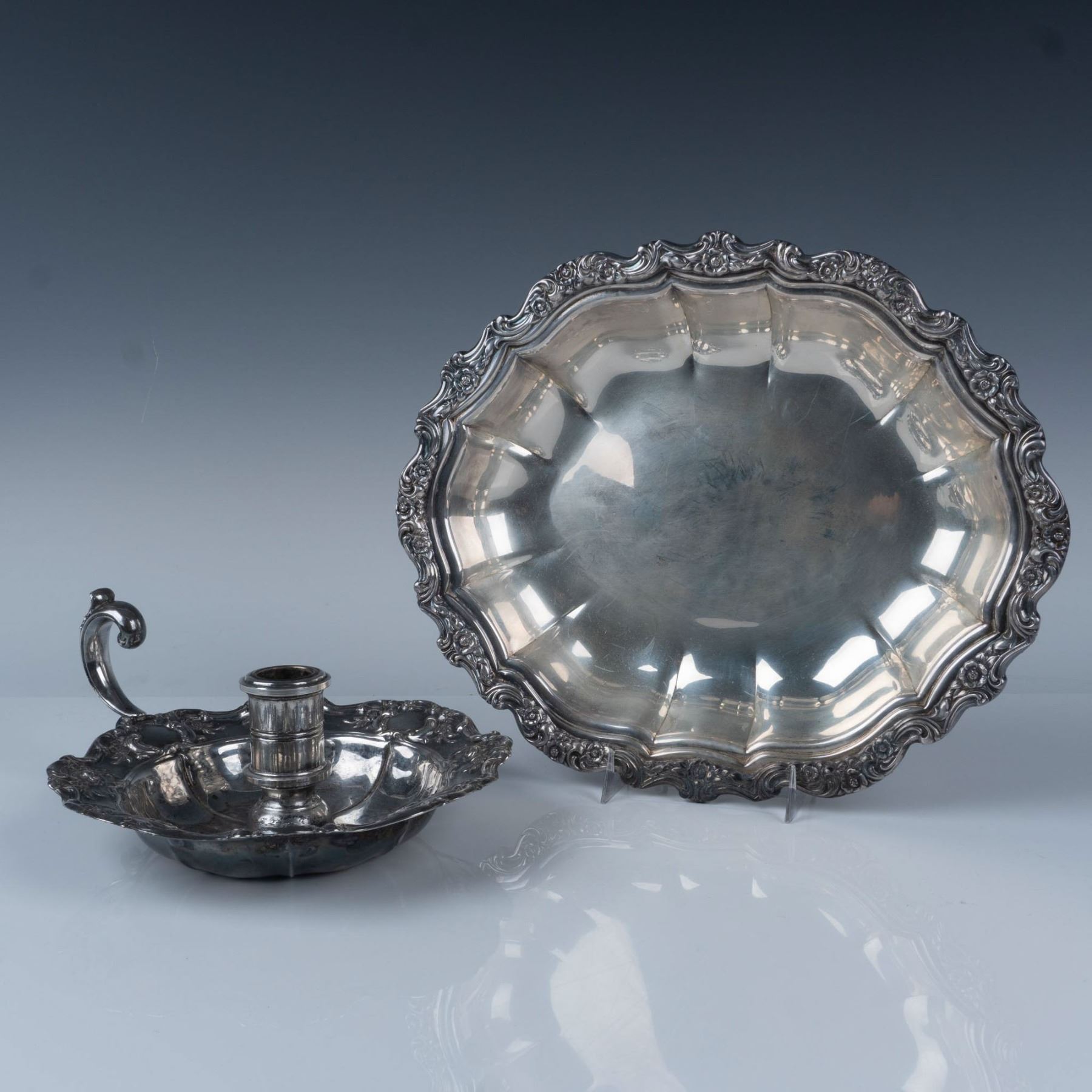 This elegant set includes a Towle Silver silverplated candle holder in the Old Master pattern, adorned with embossed roses and scrolls, and a Countess Silverplate serving tray by International Silver. Together, these pieces offer timeless beauty and refined charm for any occasion. Candle holder measures 8.75"L x 7.5"W x 3.75"H. The tray measures 11.75"L x 10"W x 2"H.