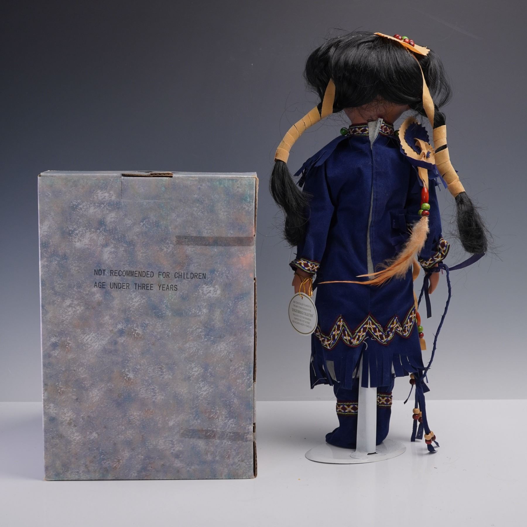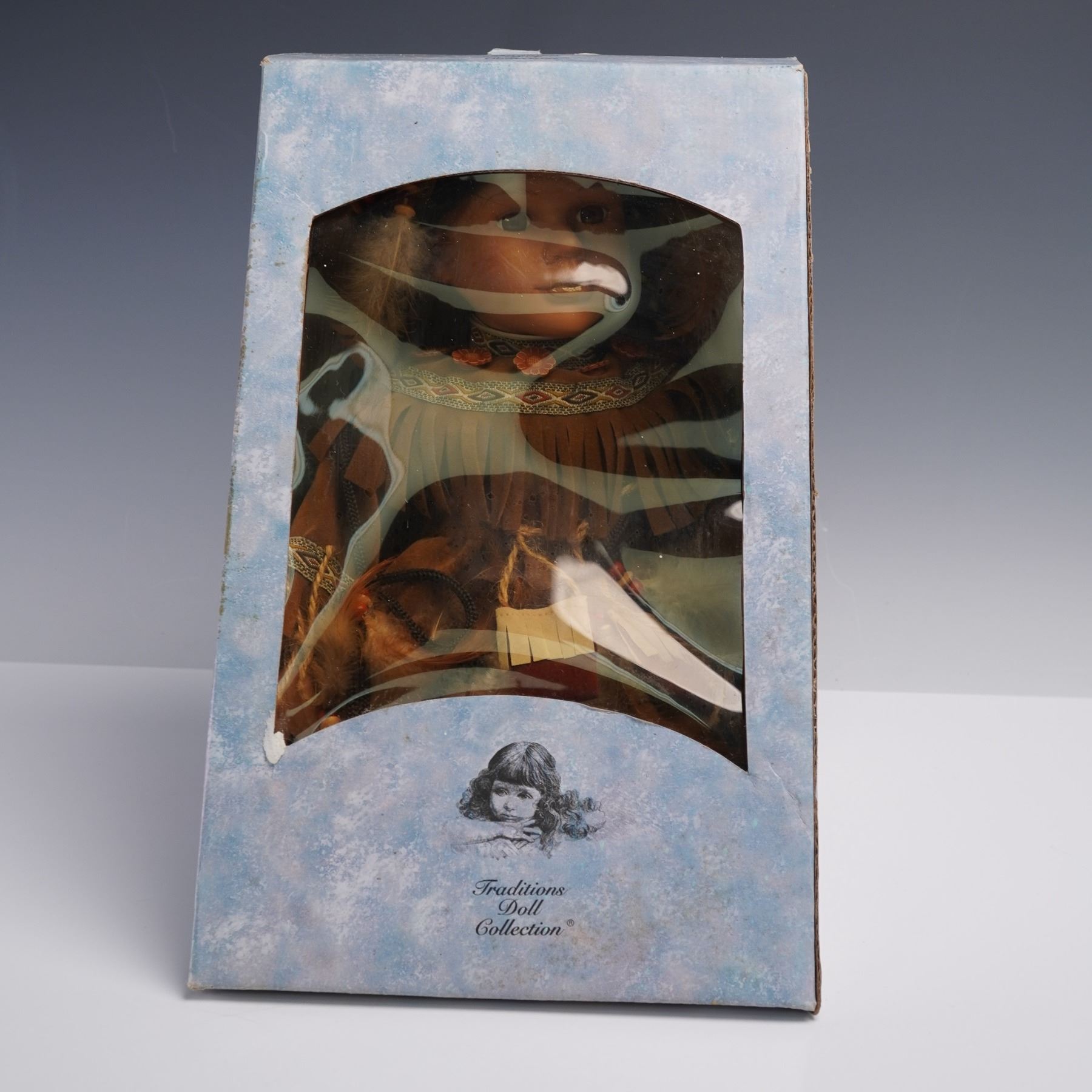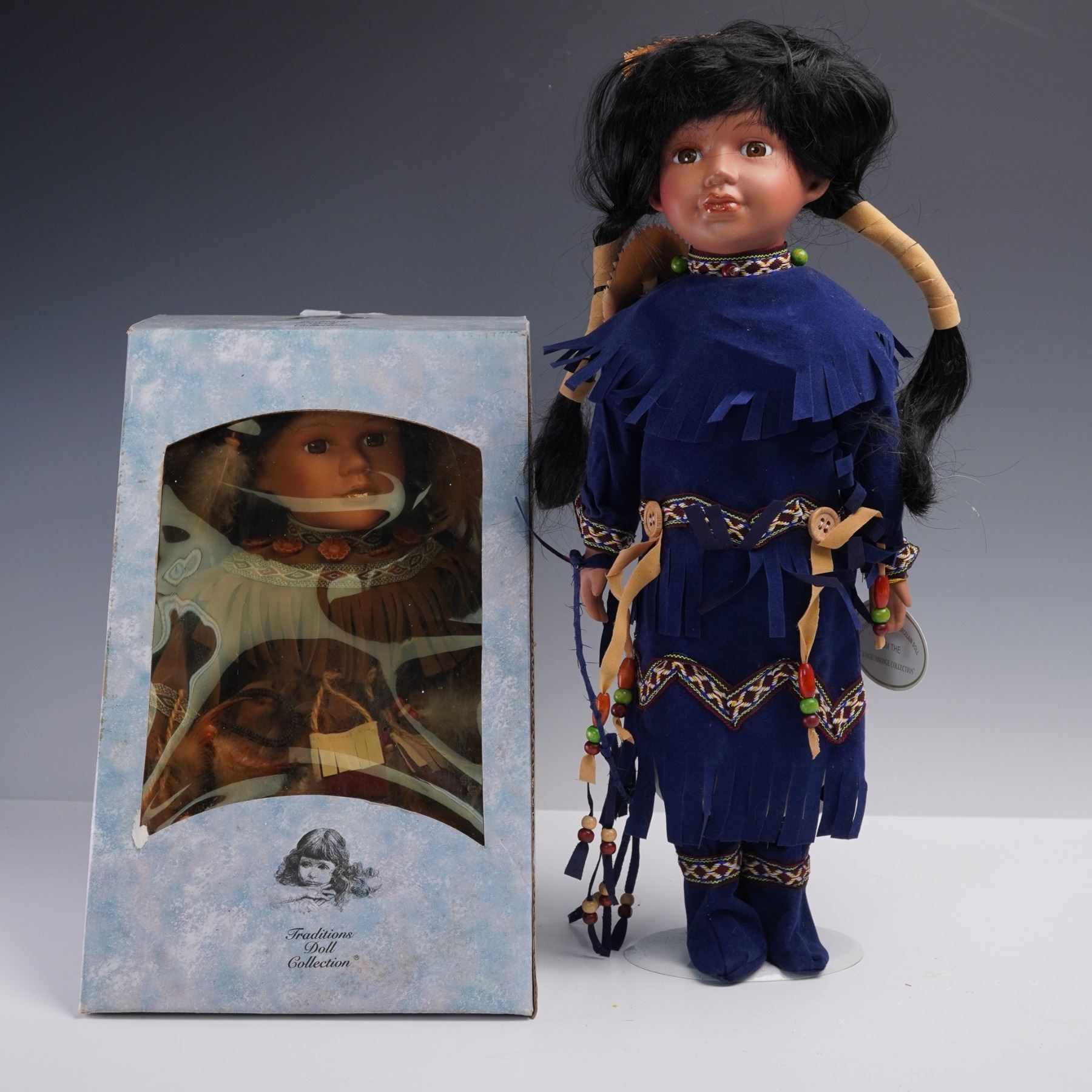 Set of two collectible porcelain dolls in original boxes. Includes Swan from the Traditions Doll Collection, dressed in a faux suede Native American inspired outfit with fur trim and beaded details, and a fine bisque porcelain doll from the Knightsbridge Collection, wearing a deep blue fringed dress with colorful accents. Each doll is perfectly housed in their original packing with display windows and printed details. This item has its original box.