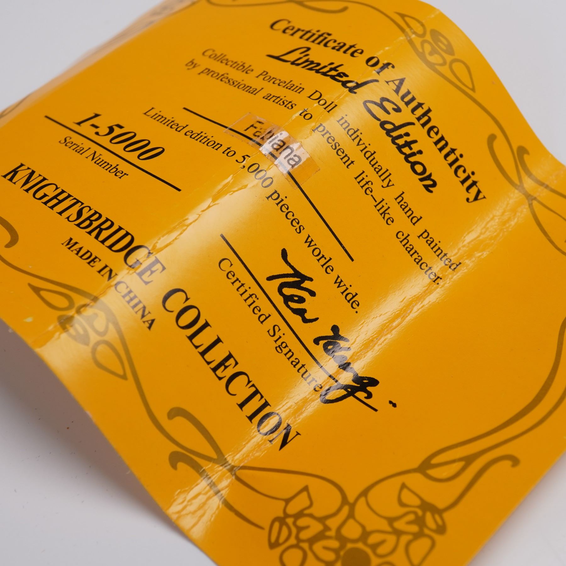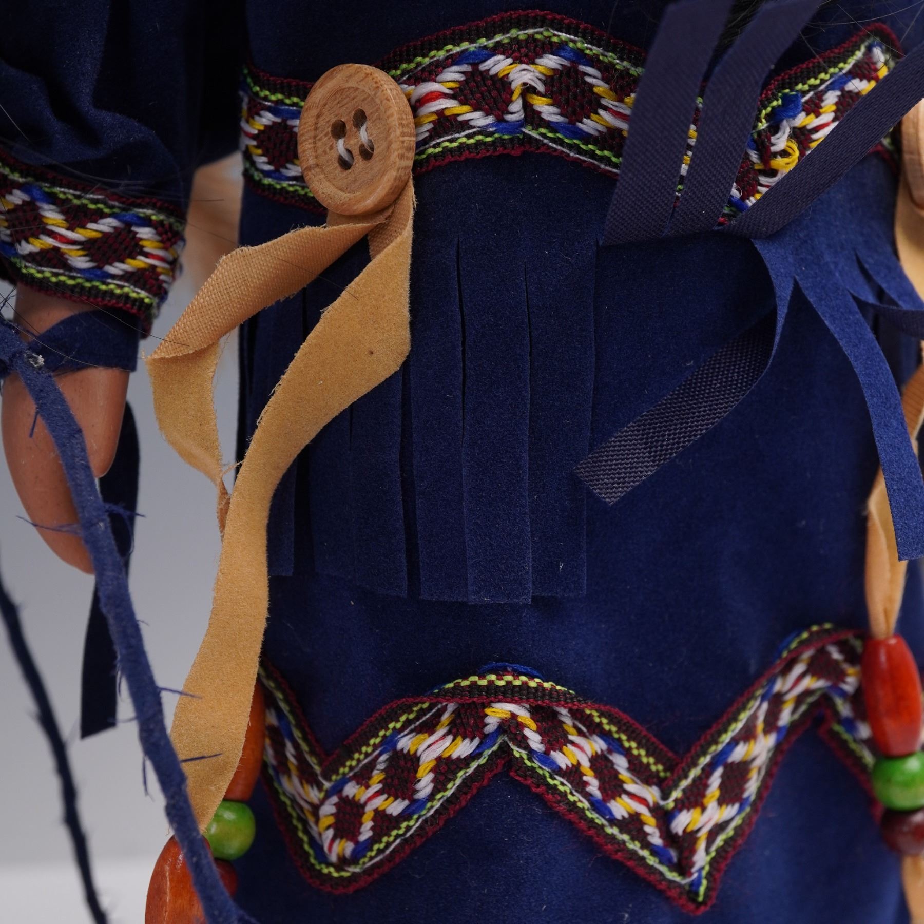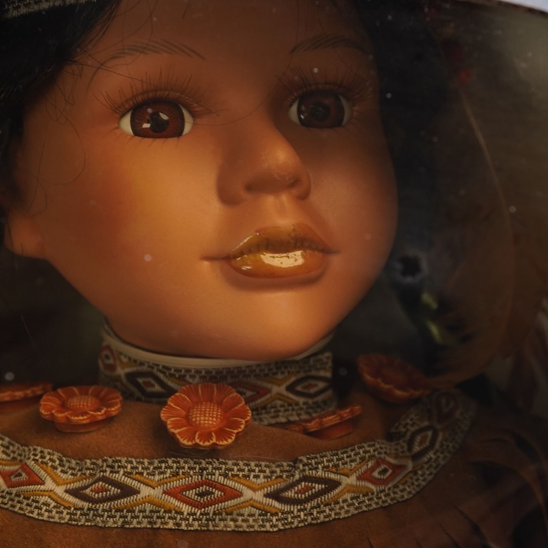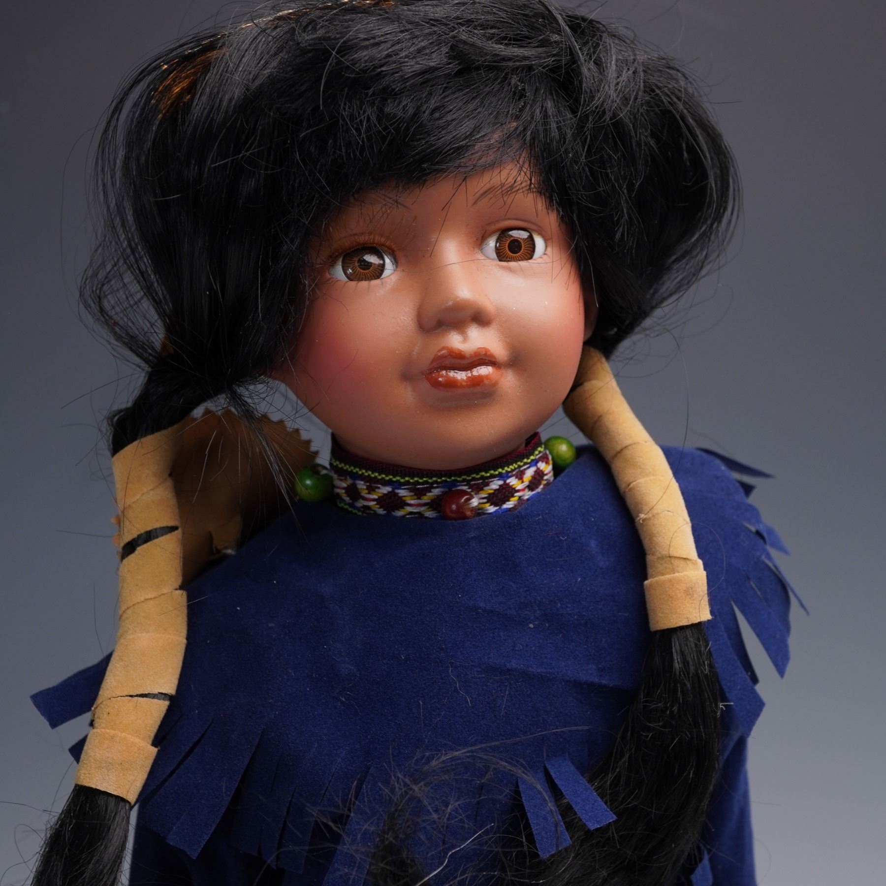 Set of two collectible porcelain dolls in original boxes. Includes Swan from the Traditions Doll Collection, dressed in a faux suede Native American inspired outfit with fur trim and beaded details, and a fine bisque porcelain doll from the Knightsbridge Collection, wearing a deep blue fringed dress with colorful accents. Each doll is perfectly housed in their original packing with display windows and printed details. This item has its original box.