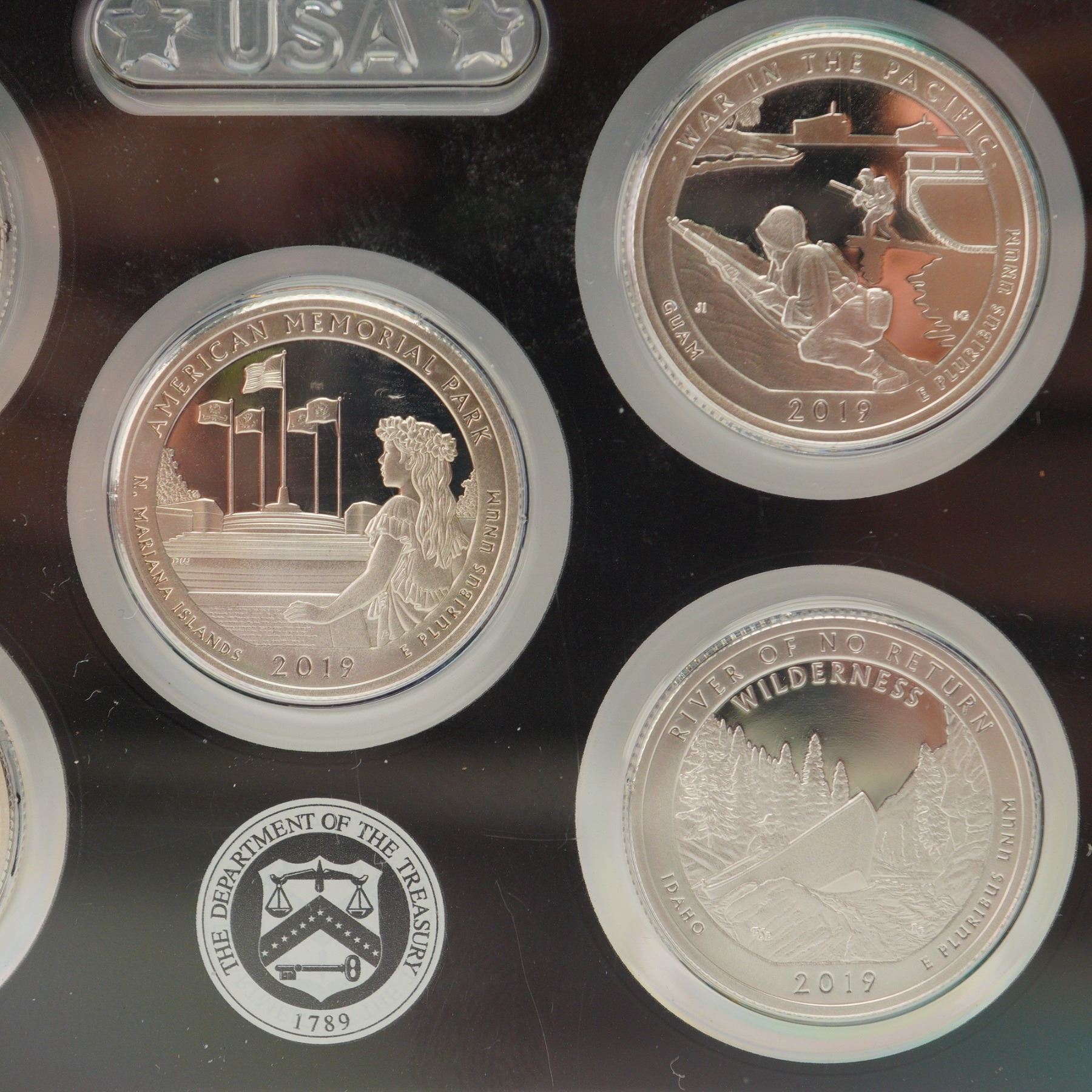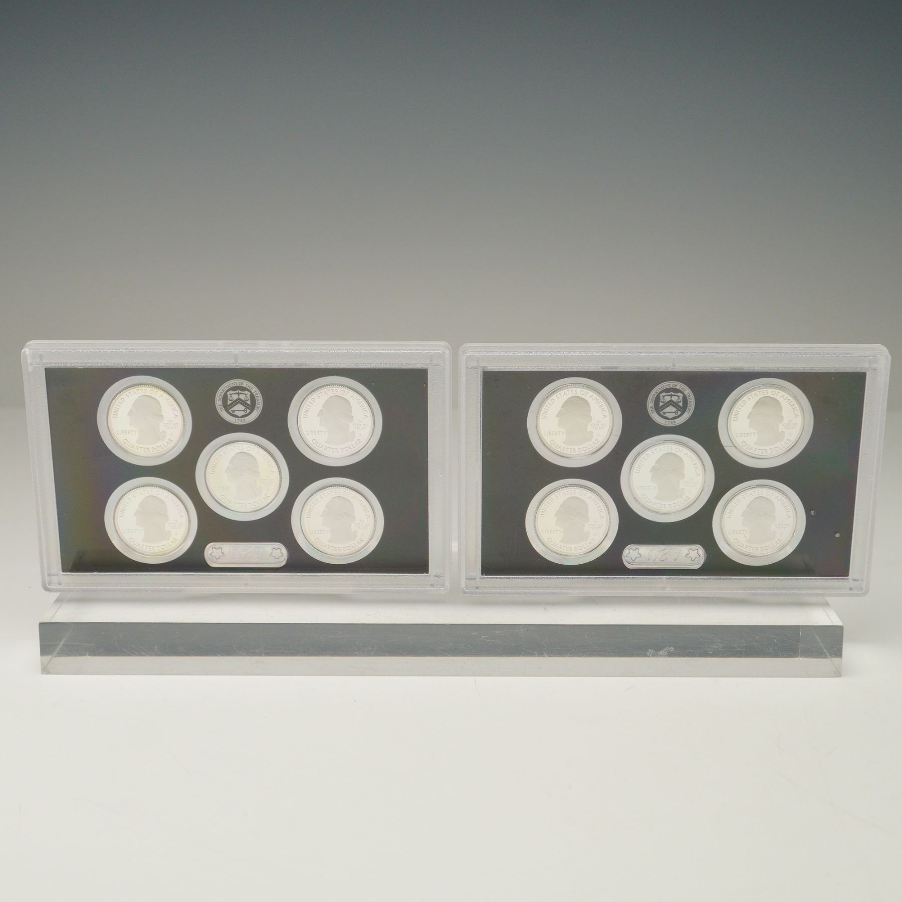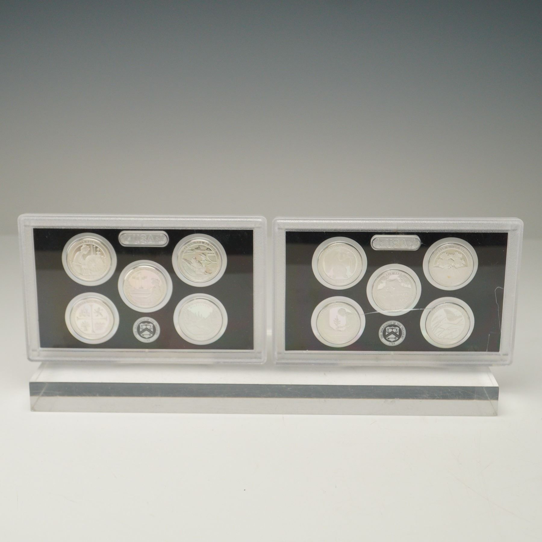 Two U.S. Mint silver proof quarter sets from 2019 and 2020. Each slab contains five S-mintmarked America the Beautiful quarters in brilliant mirror-proof finish. Coins feature historical and national park designs. Standard U.S. quarter size, each measuring approx. 24.3mm dia. Plastic slabs each measure approx. 5.5"W x 3.5"H.