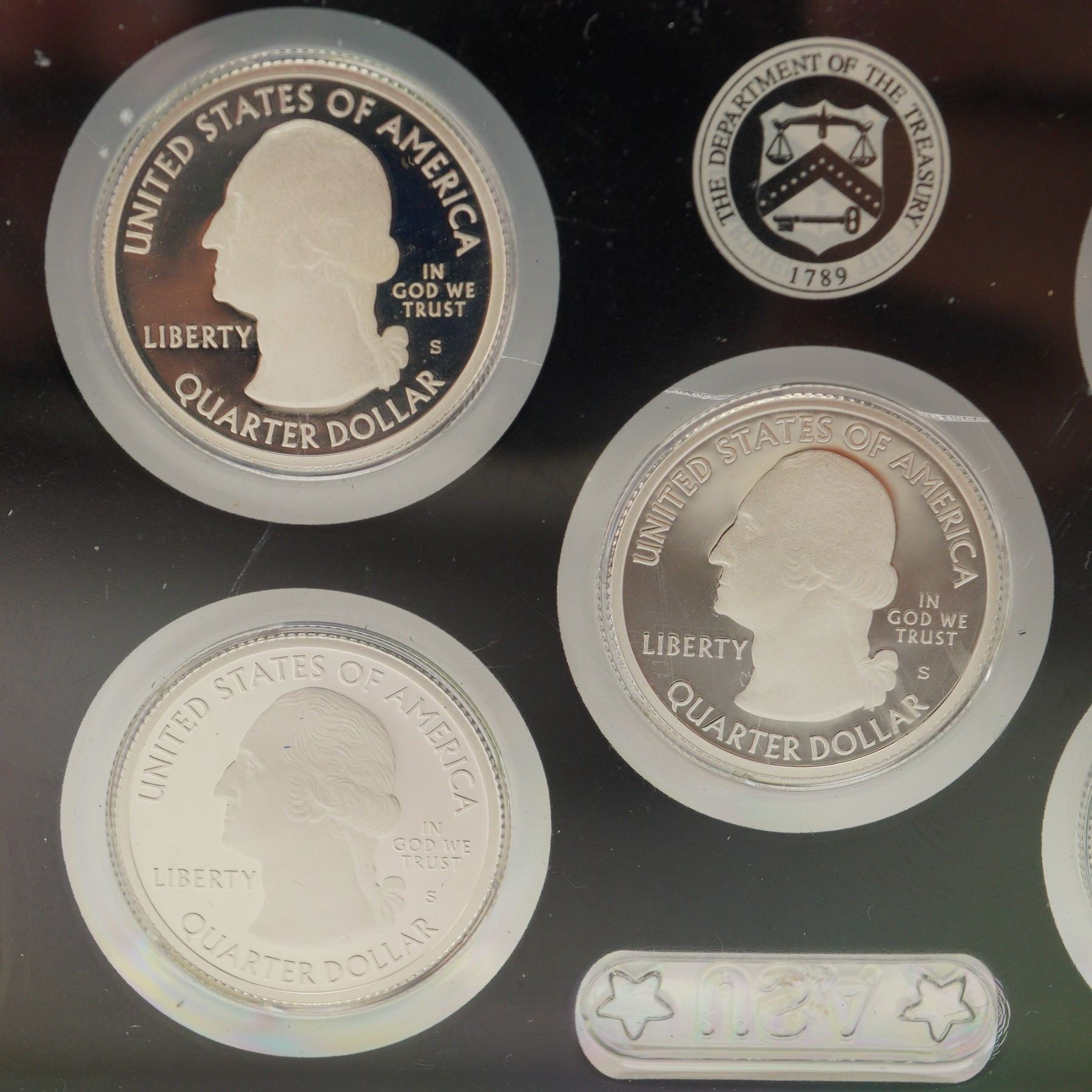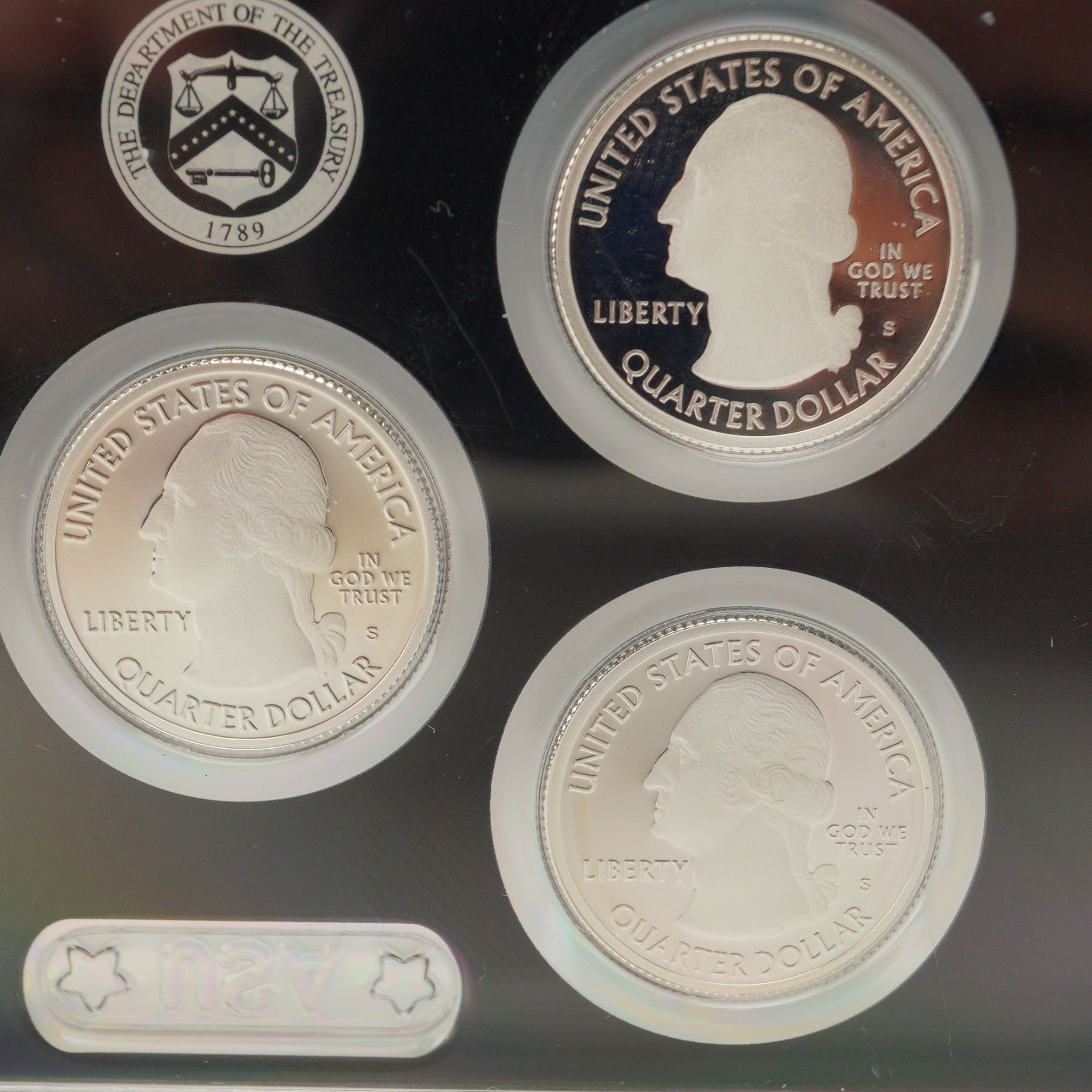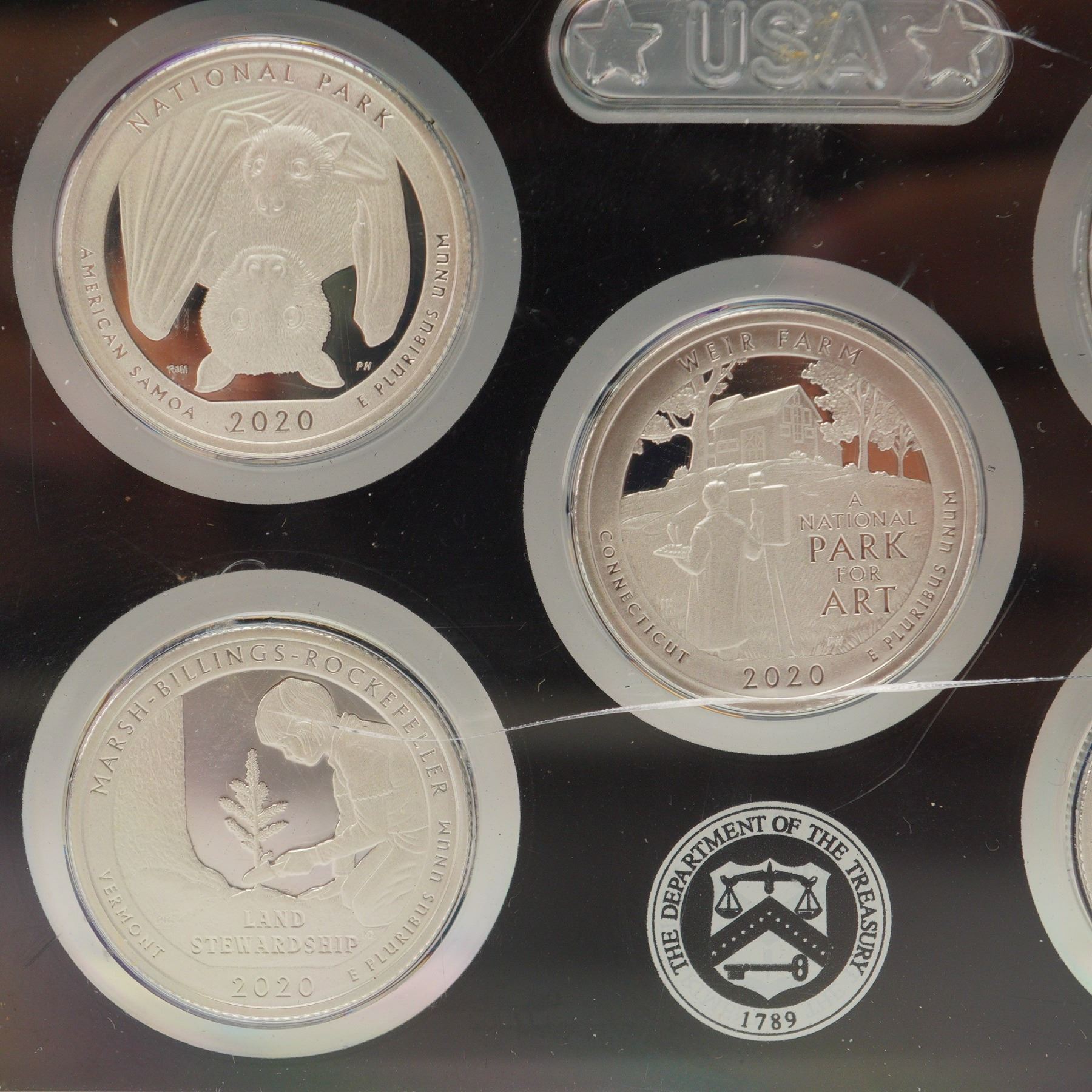 Two U.S. Mint silver proof quarter sets from 2019 and 2020. Each slab contains five S-mintmarked America the Beautiful quarters in brilliant mirror-proof finish. Coins feature historical and national park designs. Standard U.S. quarter size, each measuring approx. 24.3mm dia. Plastic slabs each measure approx. 5.5"W x 3.5"H.