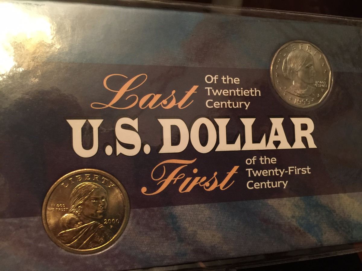 Last dollar coin of the 20th century and first dollar coin of the 21st century in plastic display case