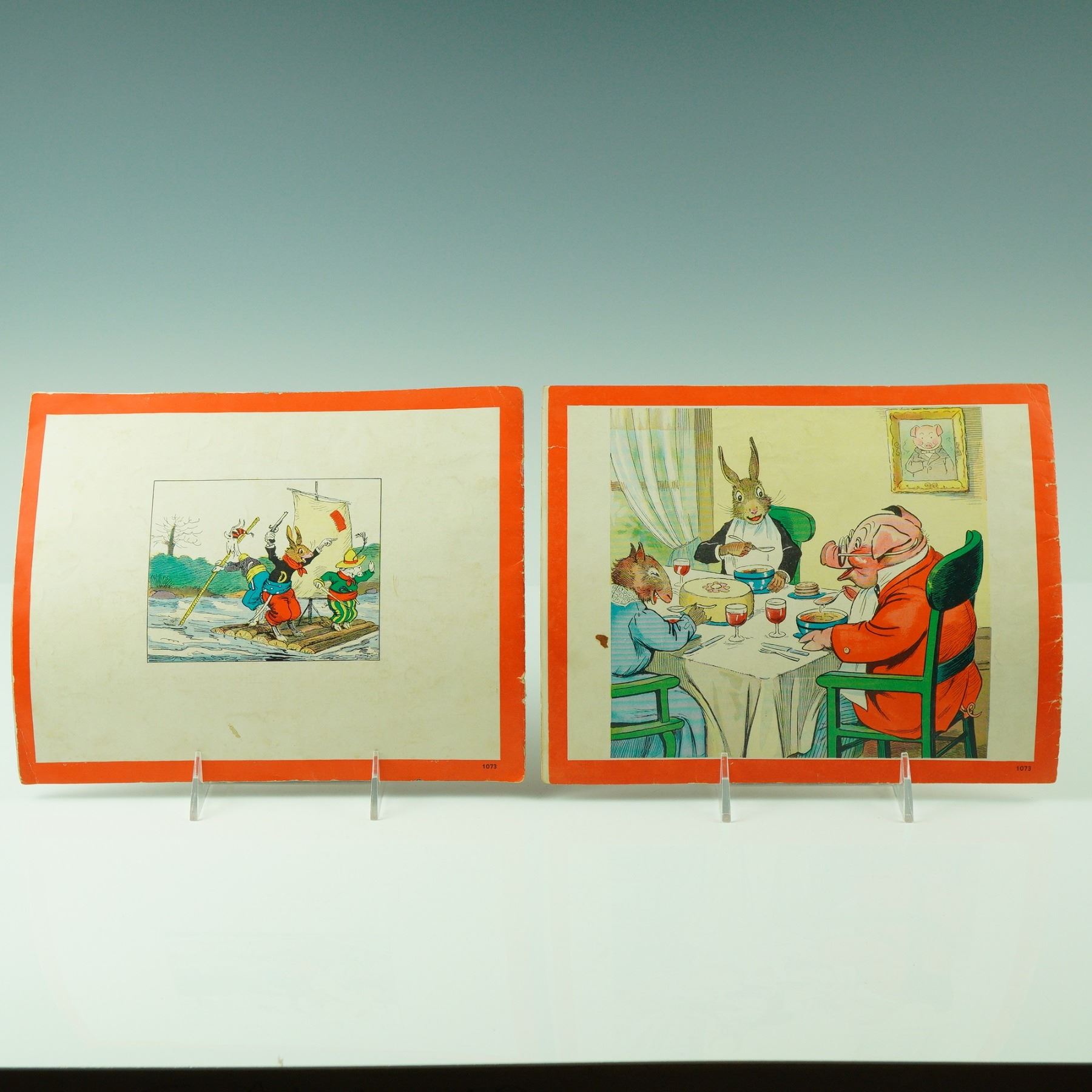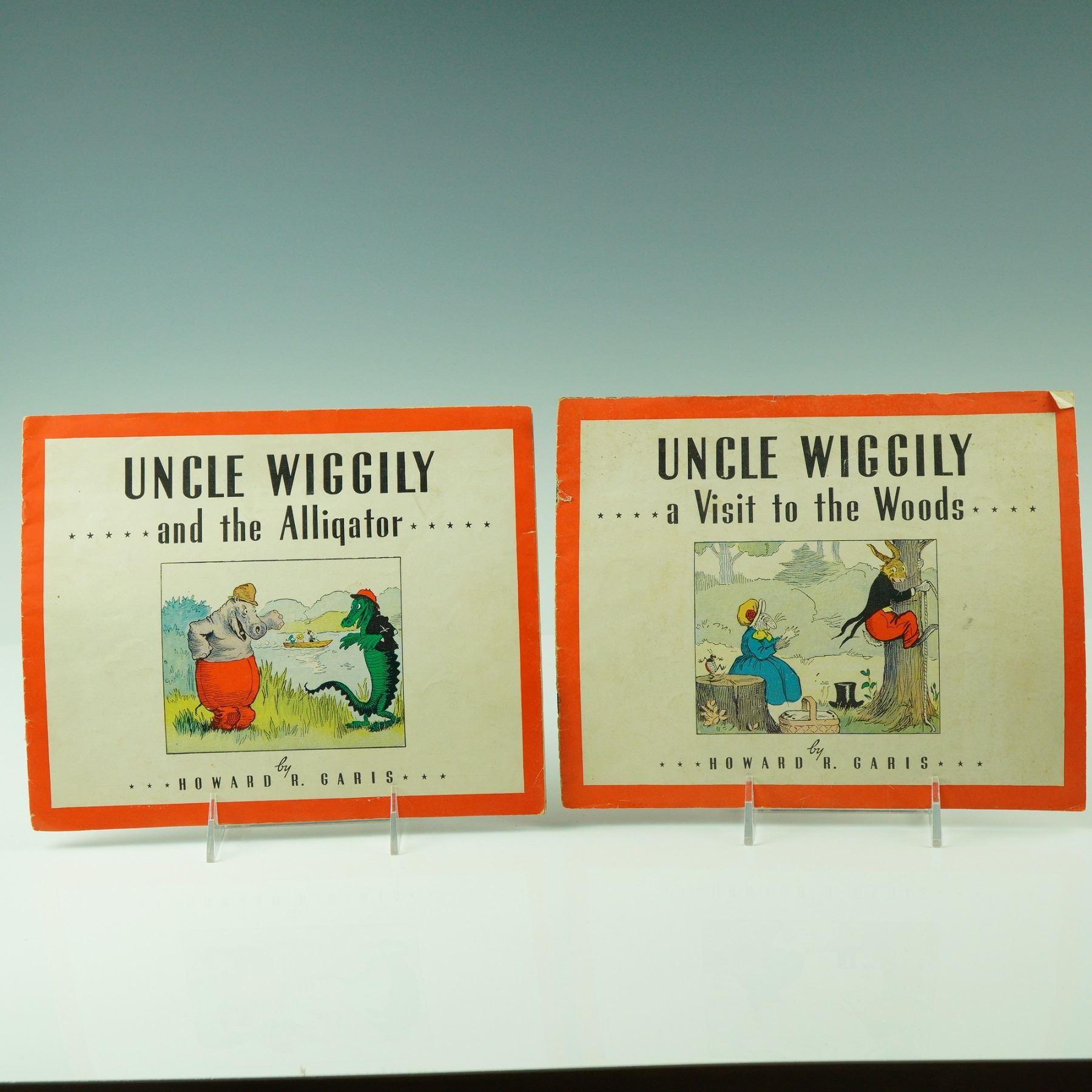 Pair of early Uncle Wiggily children's booklets written by Howard R Garis, including Uncle Wiggily and the Alligator and Uncle Wiggily a Visit to the Woods. Each features colorful cover illustrations framed in bright orange borders, with whimsical depictions of the beloved rabbit gentleman and his adventures. The stories of Uncle Wiggily were a cornerstone of American children's literature in the early 20th century, cherished for their lively characters and engaging moral lessons. These editions capture the nostalgic charm of Garis' imaginative world, making them highly collectible for lovers of vintage children's books and Americana.