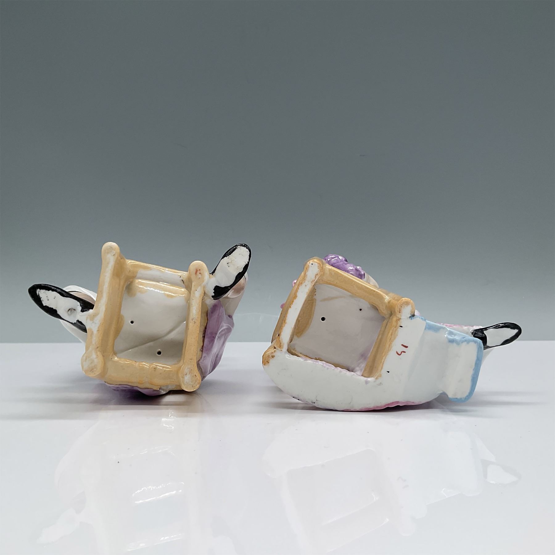This lot includes two vintage hand-painted figurines by Unger Schneider, depicting a man and woman seated on chairs. These charming pieces feature vibrant pastel tones, intricate detailing, and period attire with accents such as bows and bonnets. The largest piece measures 6.25"H.