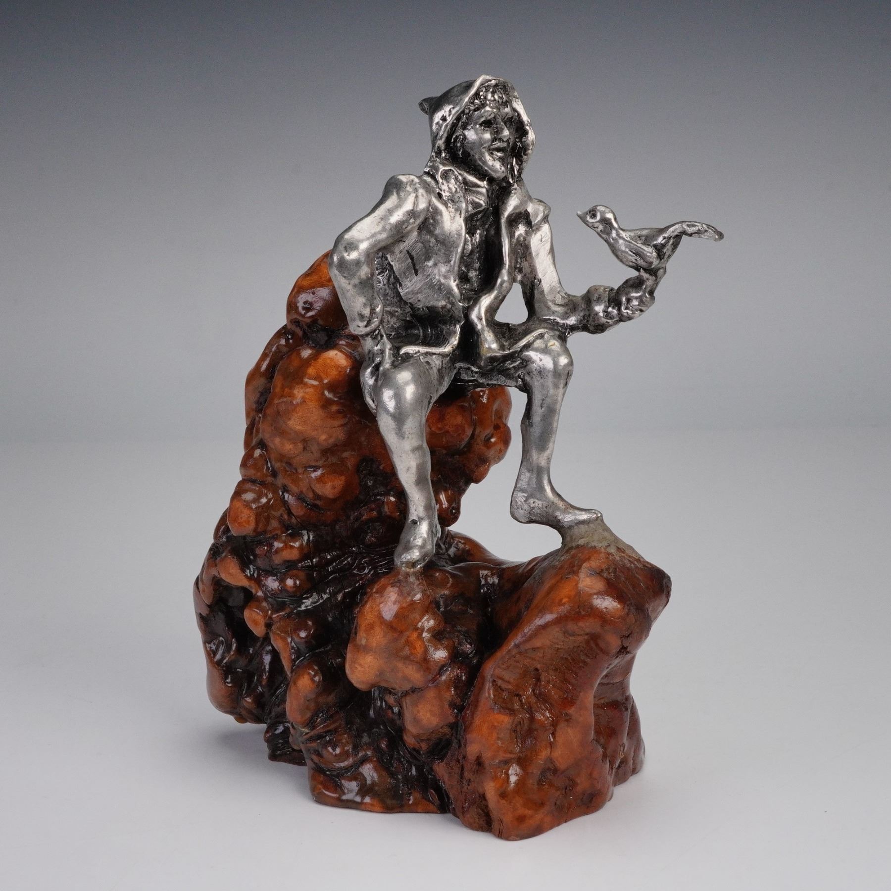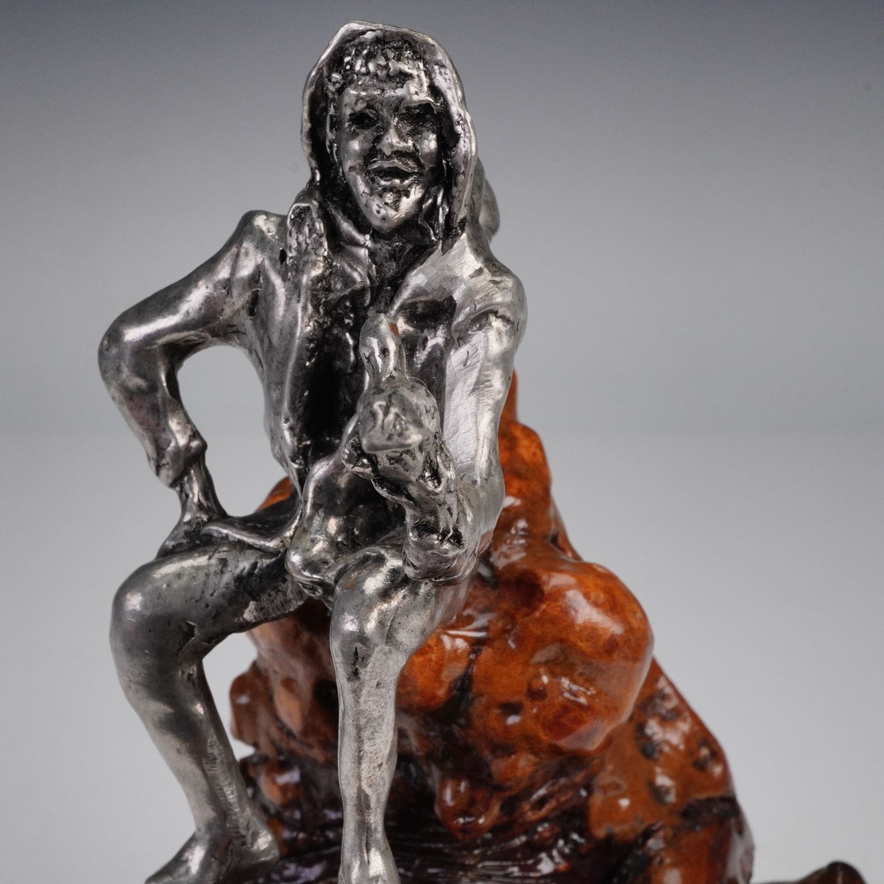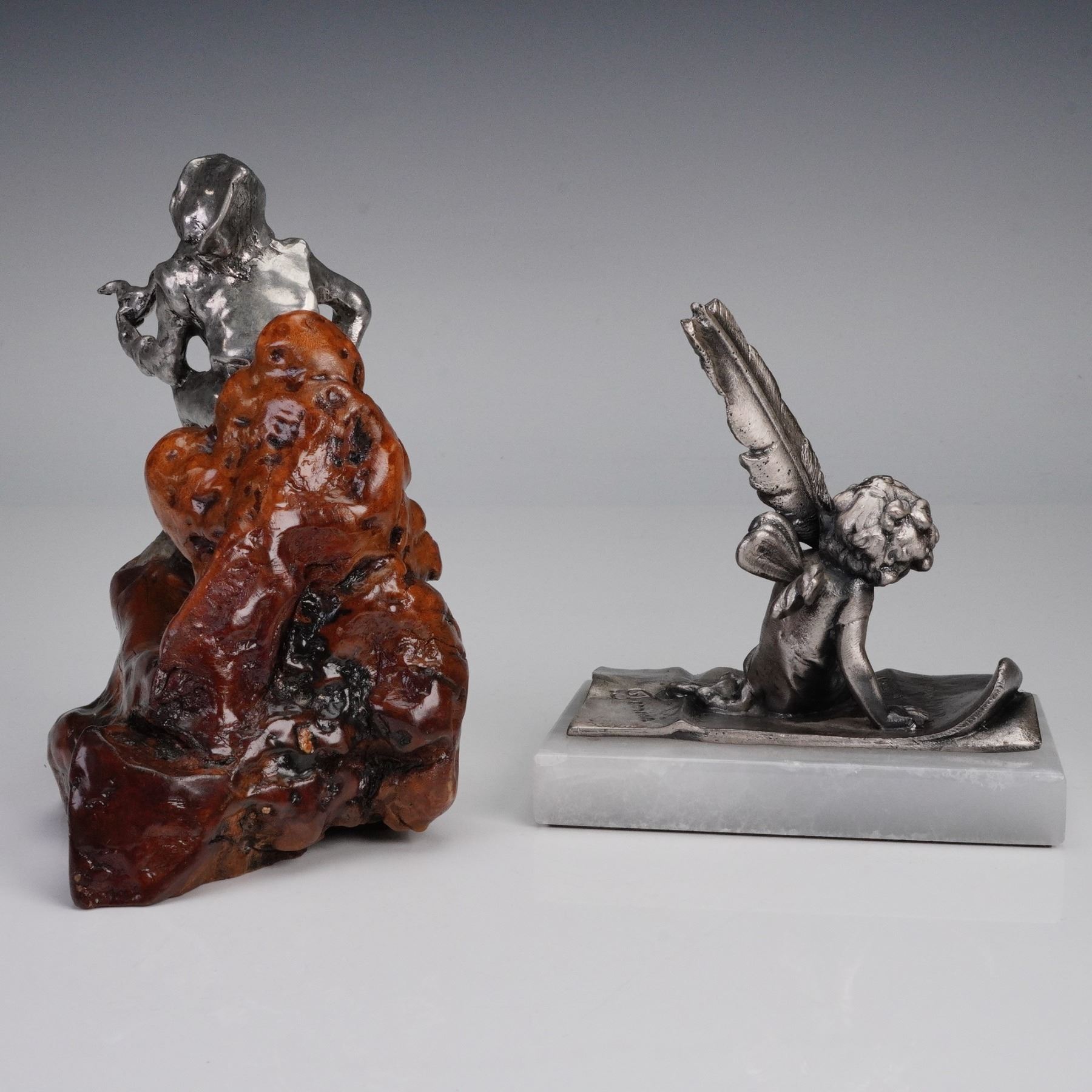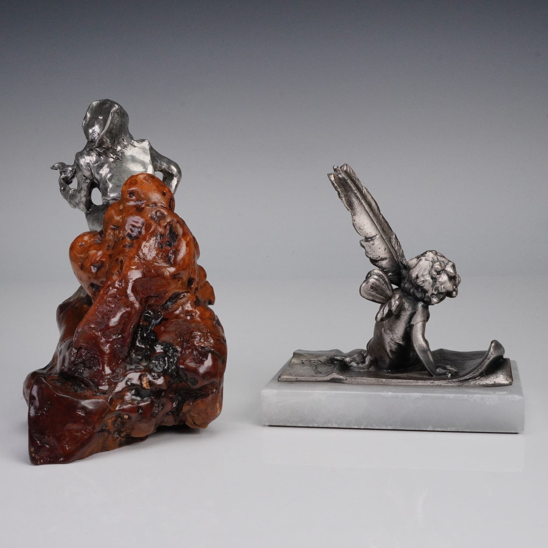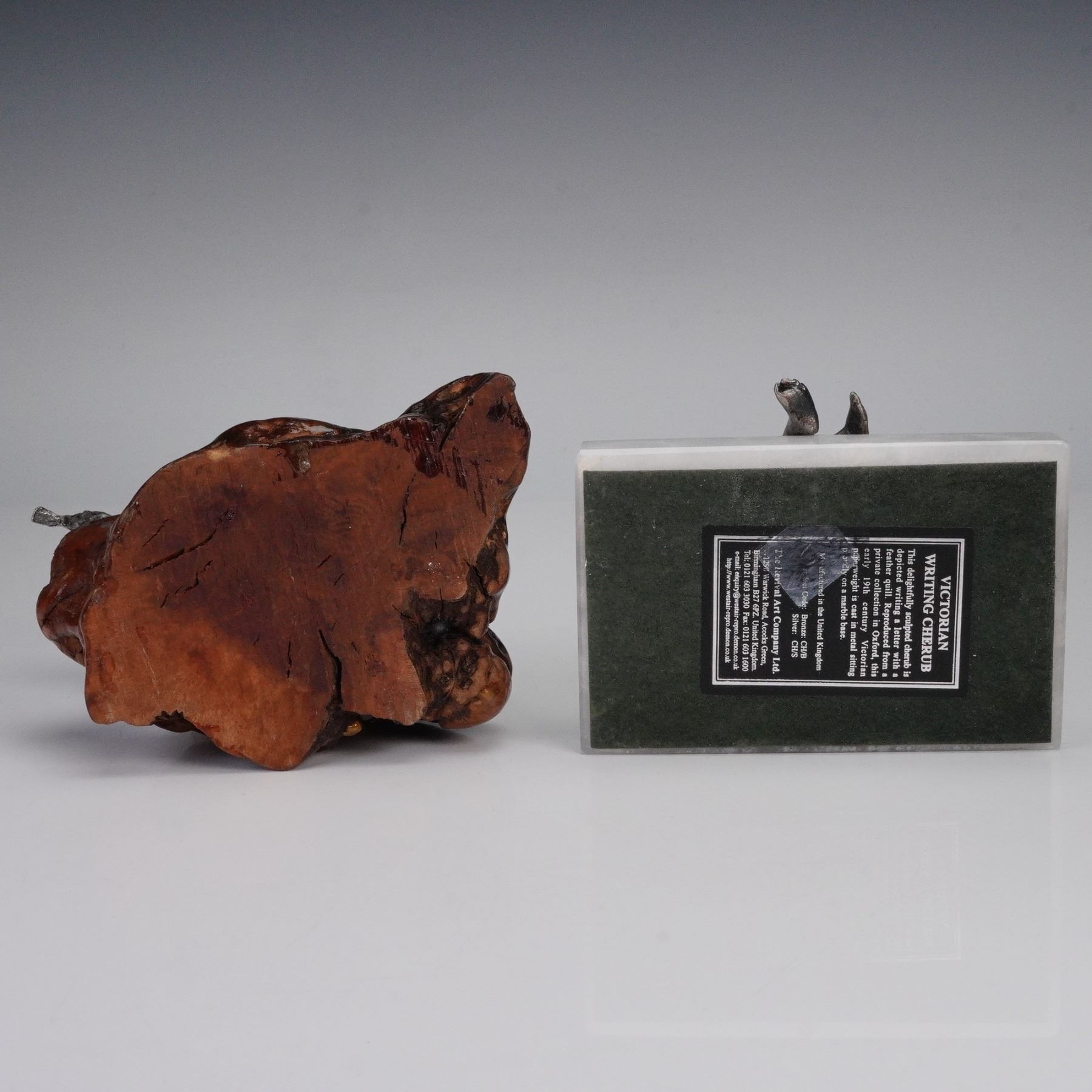 A pair of decorative metal figures including a Victorian Writing Cherub and a seated figure on wood. The Victorian Writing Cherub, reproduced by Westair Reproductions (United Kingdom), is modeled after an early 19th century Victorian paperweight and depicts a cherub writing with a feather quill. It is cast in silver-tone metal and mounted on a solid marble base, with original descriptive label beneath. The companion piece features a seated figure in silver-tone metal affixed to a highly polished natural burl wood base, creating a striking contrast between organic form and sculptural detail. Together, these pieces represent both classic revivalist design and naturalistic artistry.