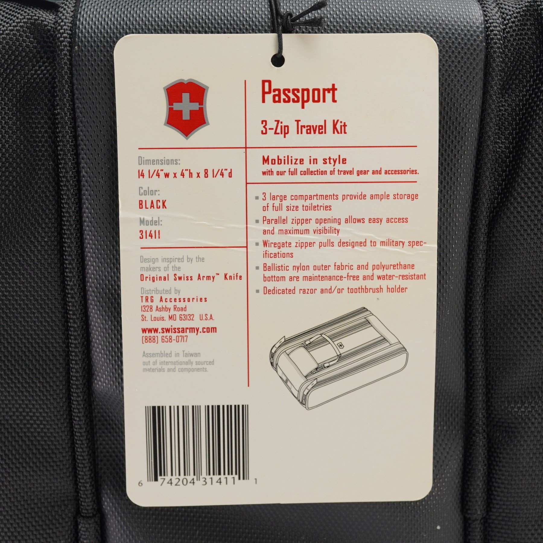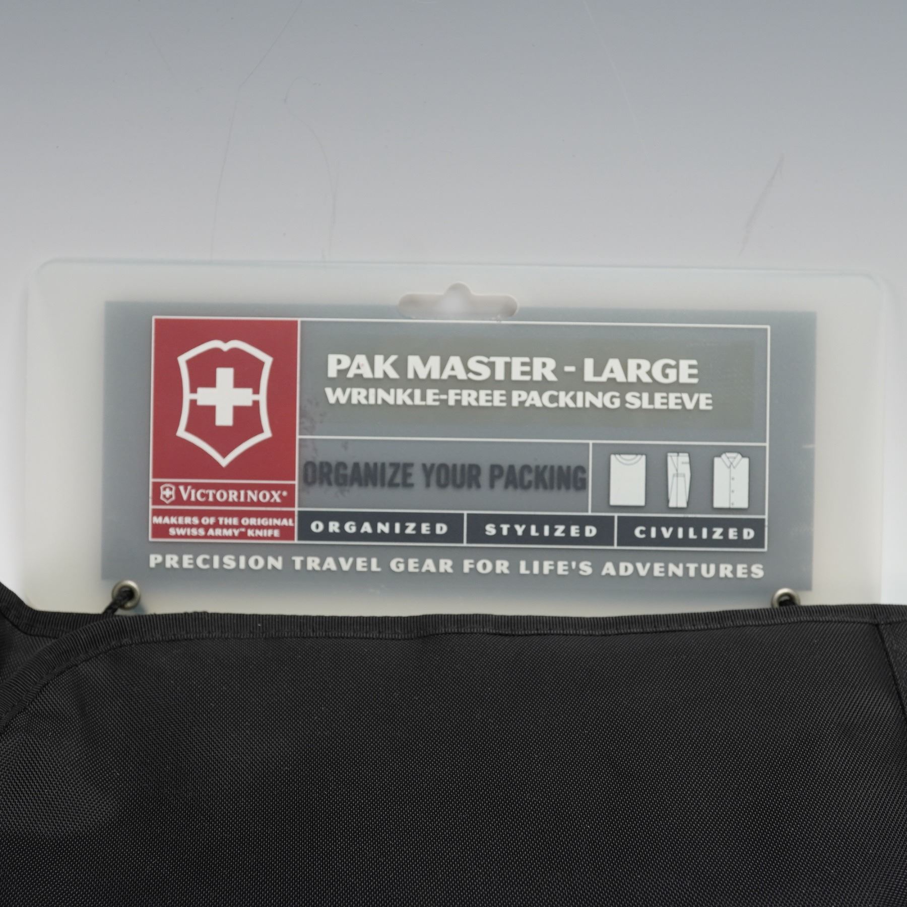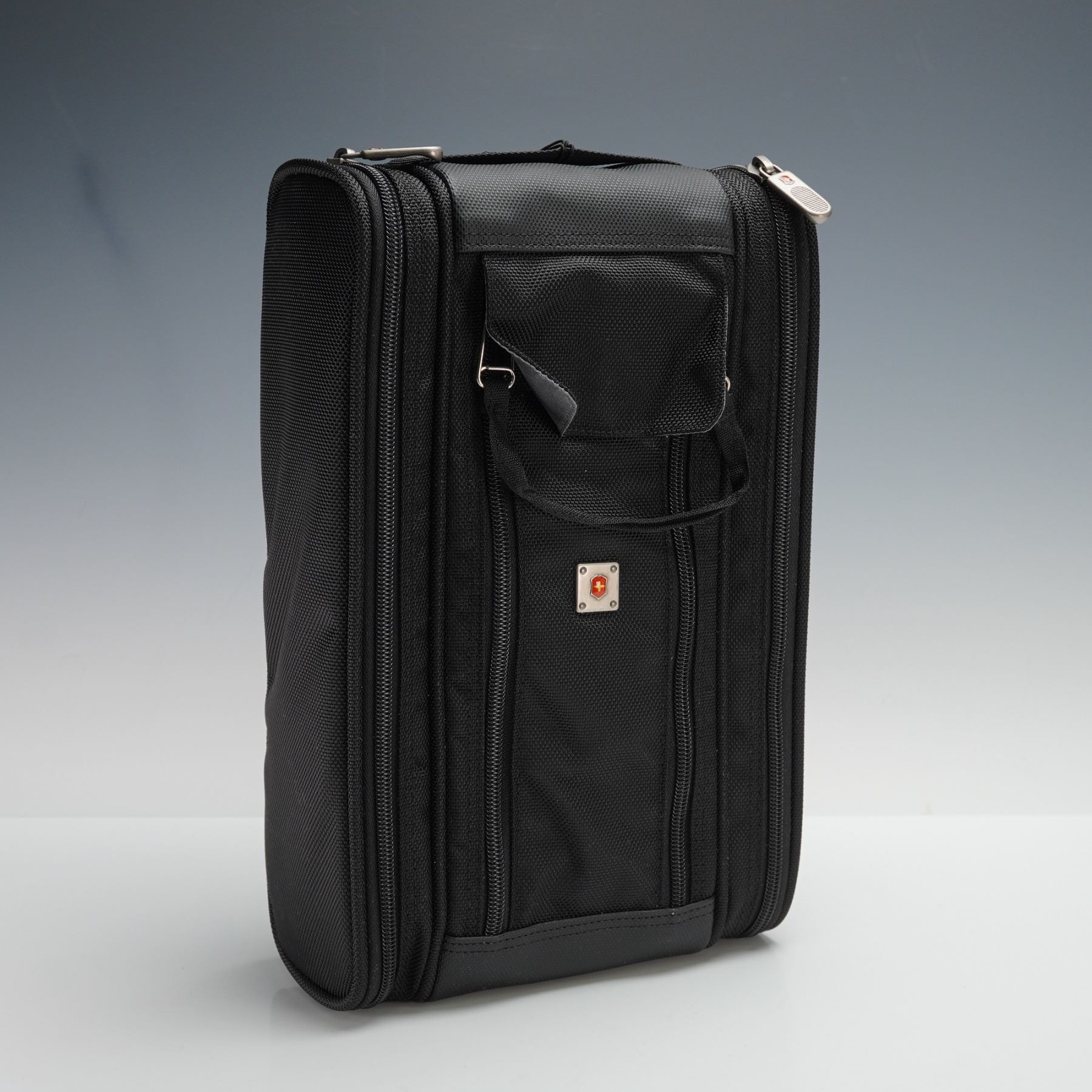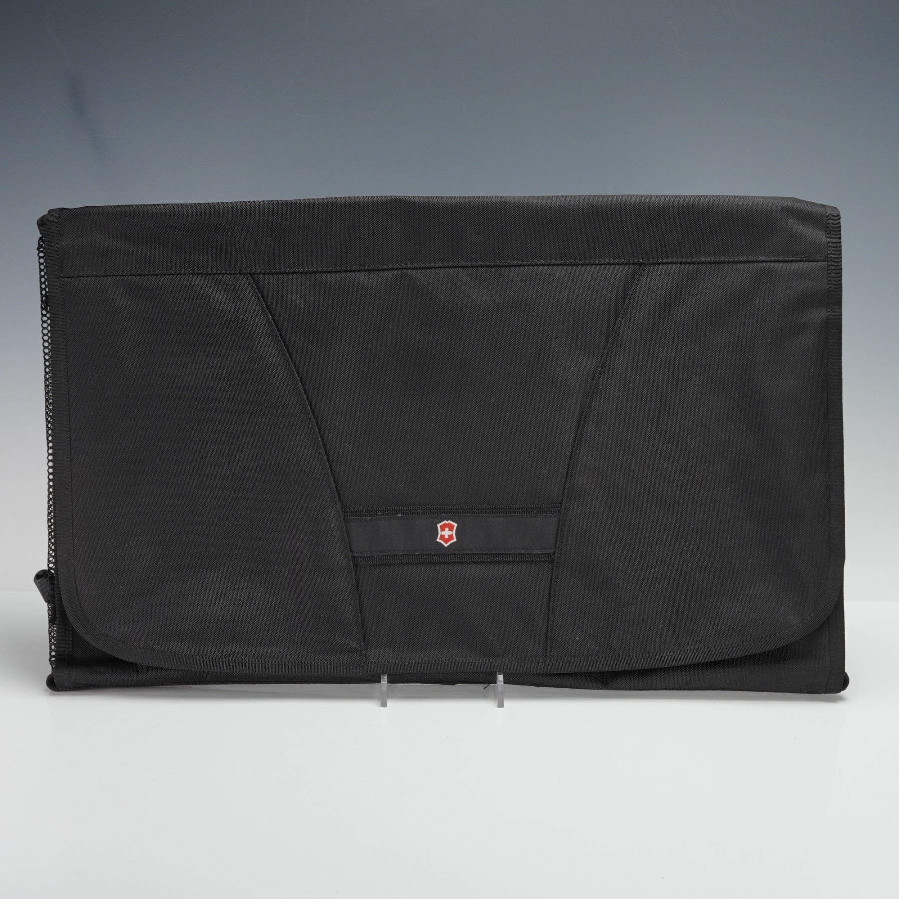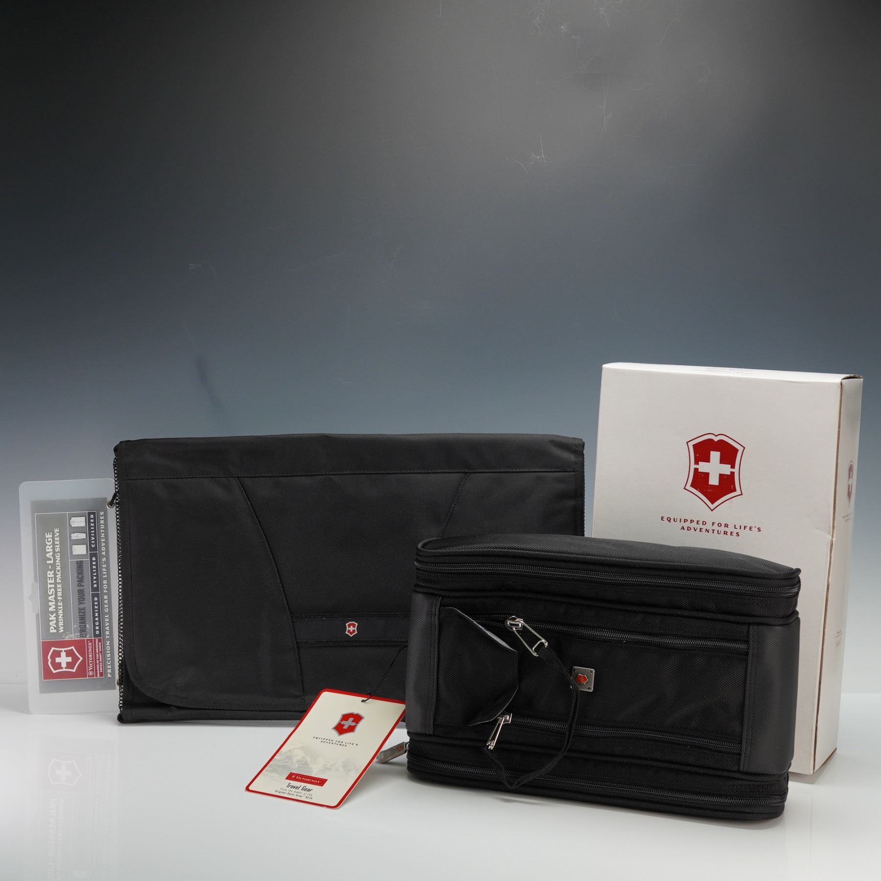 Set of two Victorinox Swiss Army travel accessories, including a Pak Master Large wrinkle-free packing sleeve and a Passport 3-Zip Travel Kit. The Pak Master features structured panels designed to keep garments neatly folded and organized, perfect for minimizing wrinkles during travel. The 3-Zip Travel Kit, Model 31411, includes three spacious compartments, durable ballistic nylon construction, and wire gate zipper pulls built to military specifications. Both items showcase Victorinox's commitment to precision and durability, ideal for frequent travelers. Includes original tags and packaging. This item has its original box.