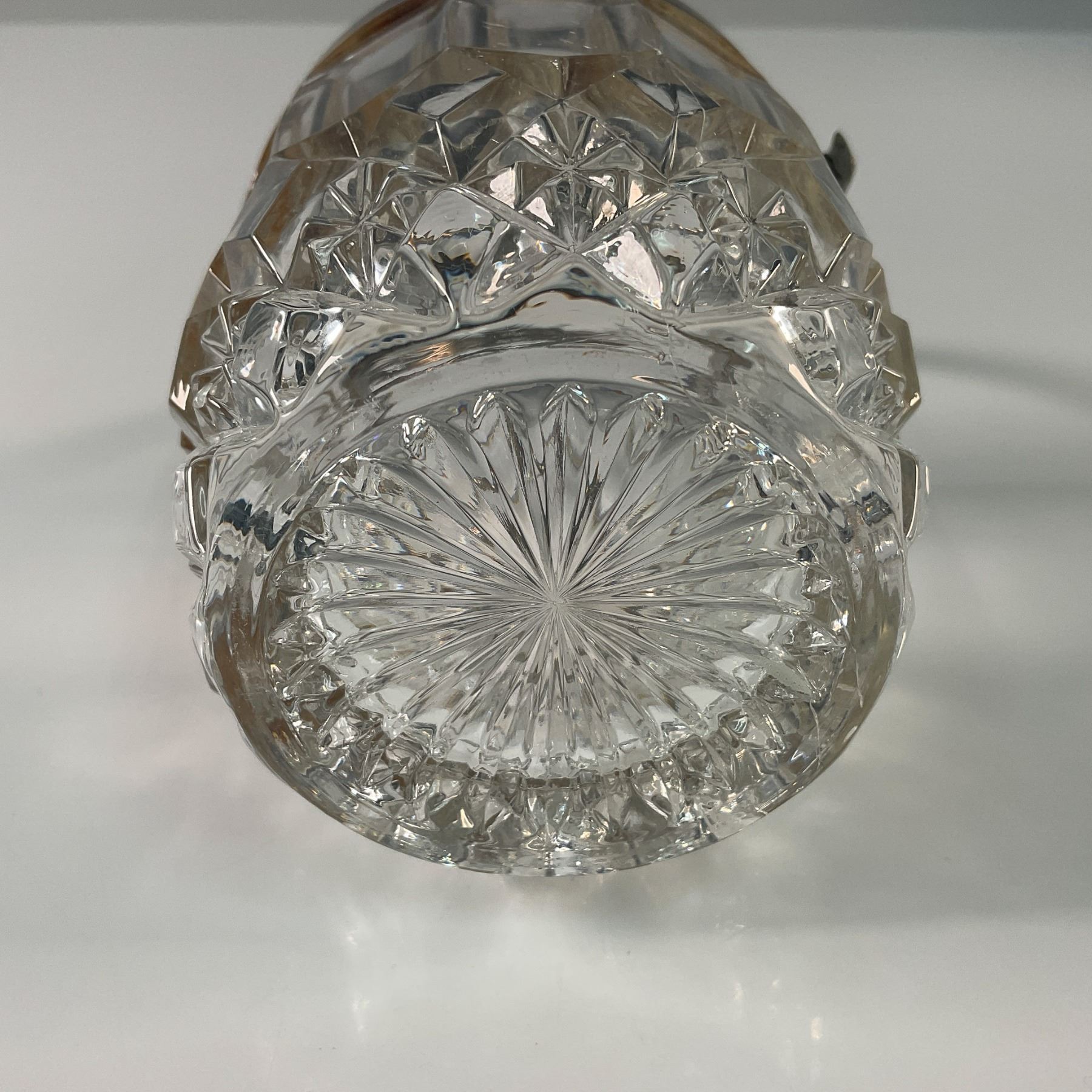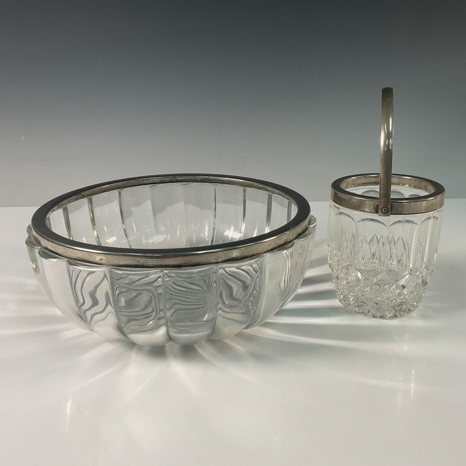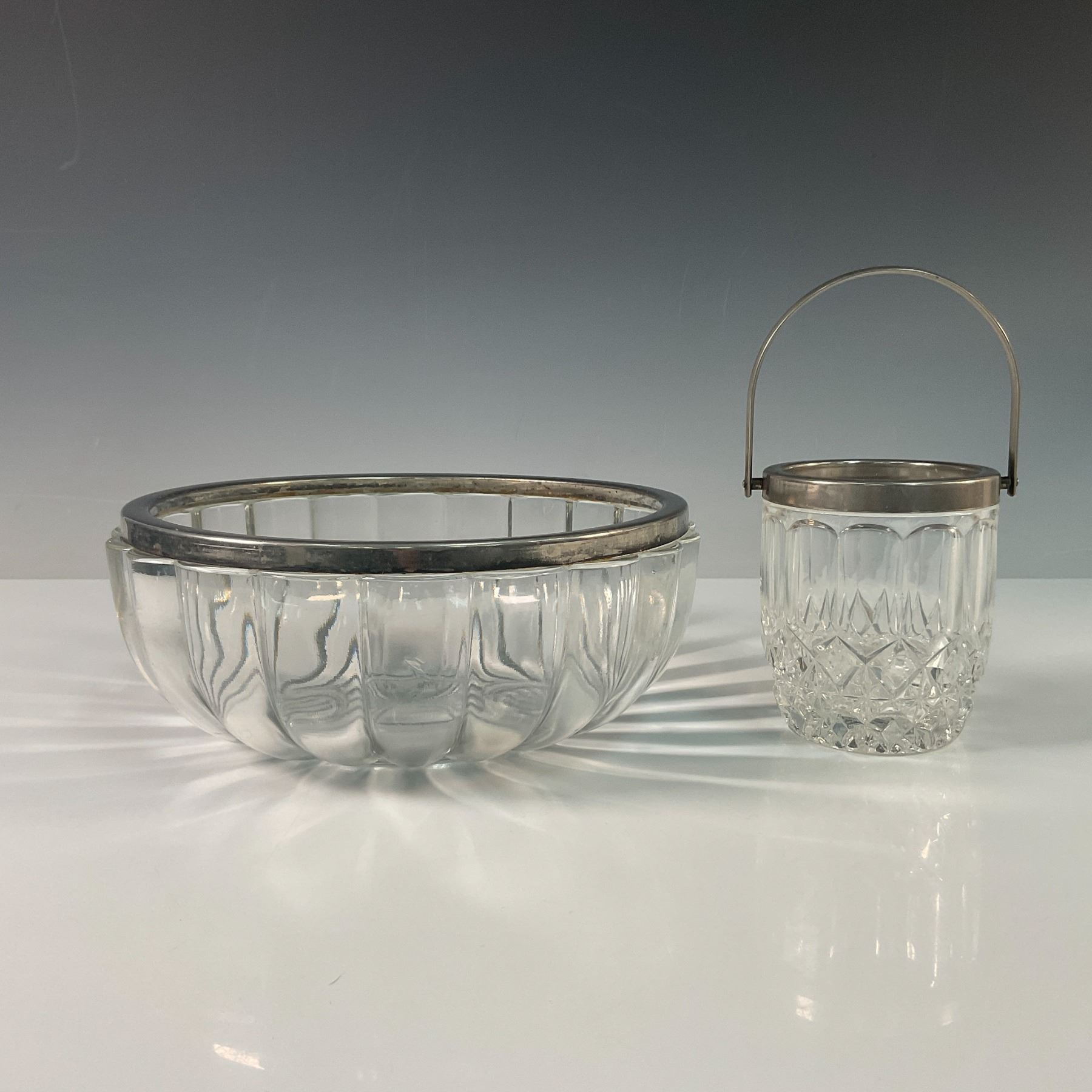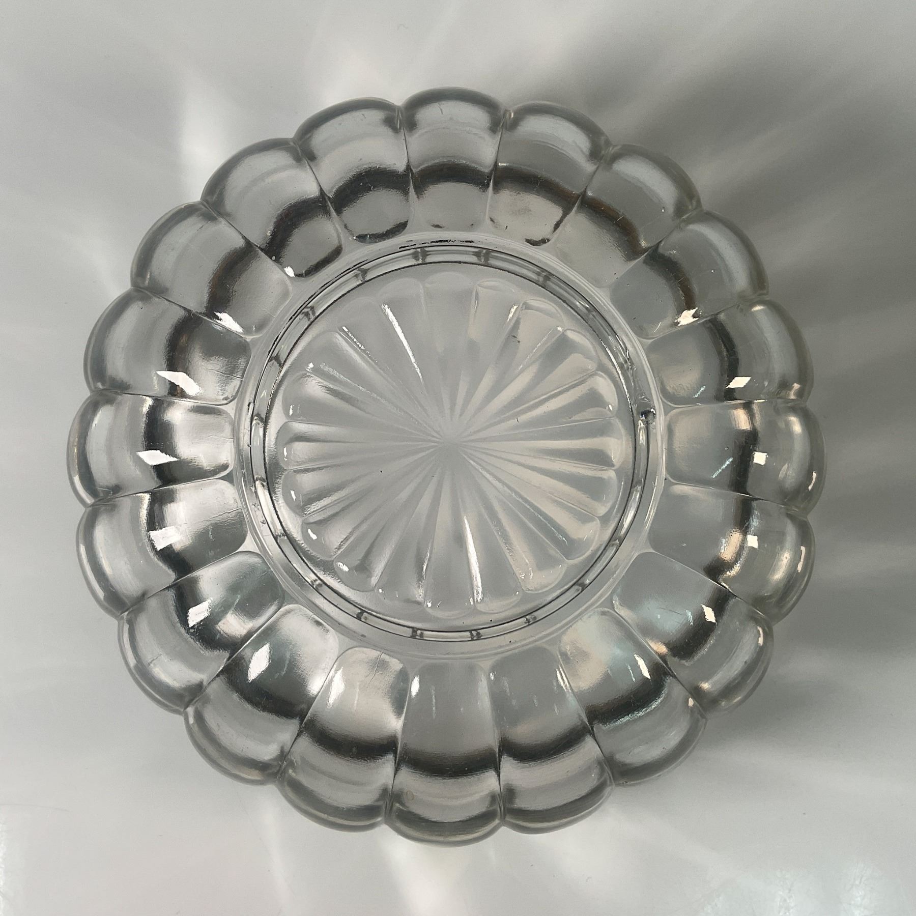 This lot features 2 clear glass bowls accented with chrome rims. The first is a centerpiece bowl, showcasing a fluted pattern with a radiant sunburst design at the base. The second piece is a versatile ice bucket or sugar dish, complete with a chrome handle and a cut-glass design. Both pieces combine functionality with elegant craftsmanship, making them perfect for entertaining or display. Bowl 1: 3.5"H. Bowl 2, with handle up: 7"H.