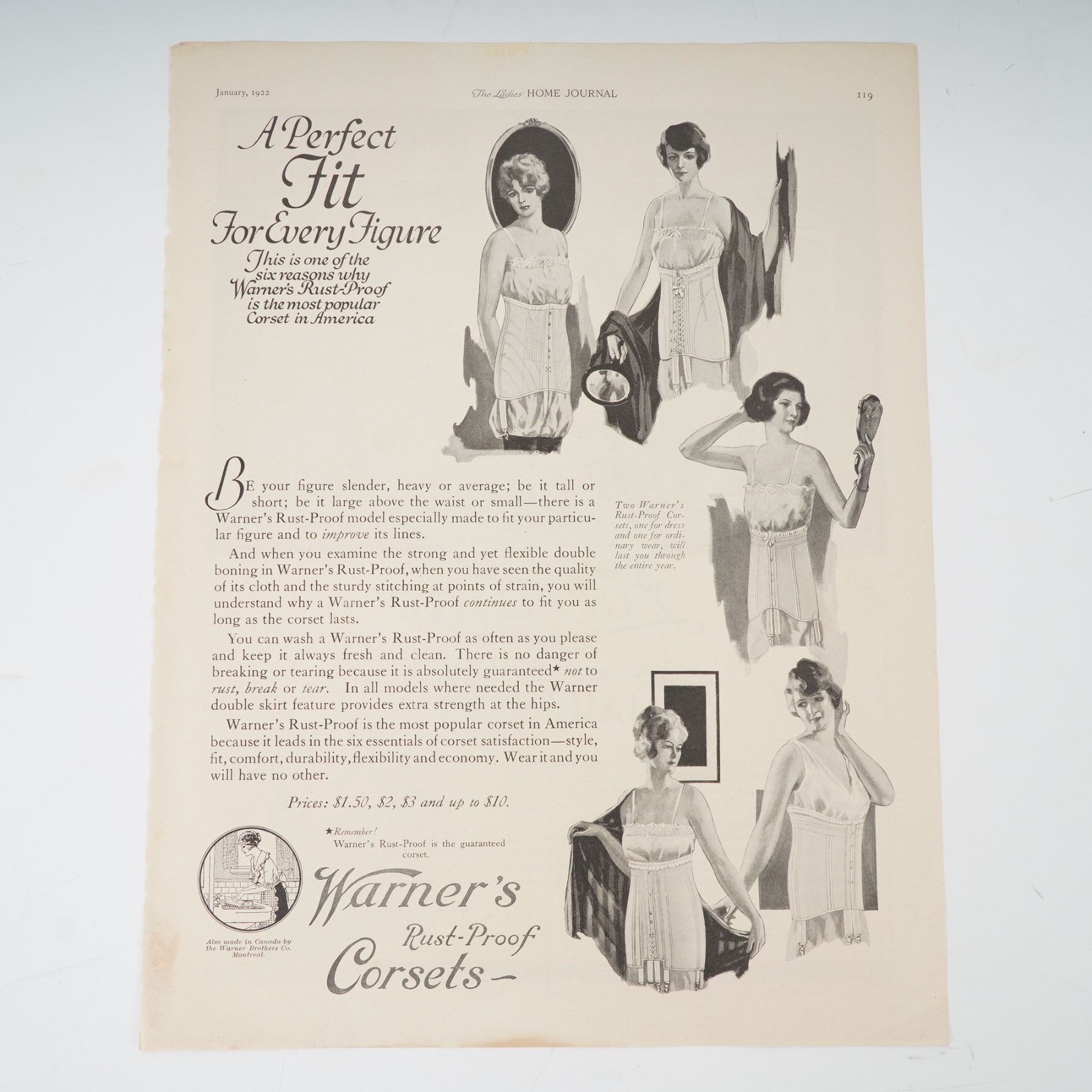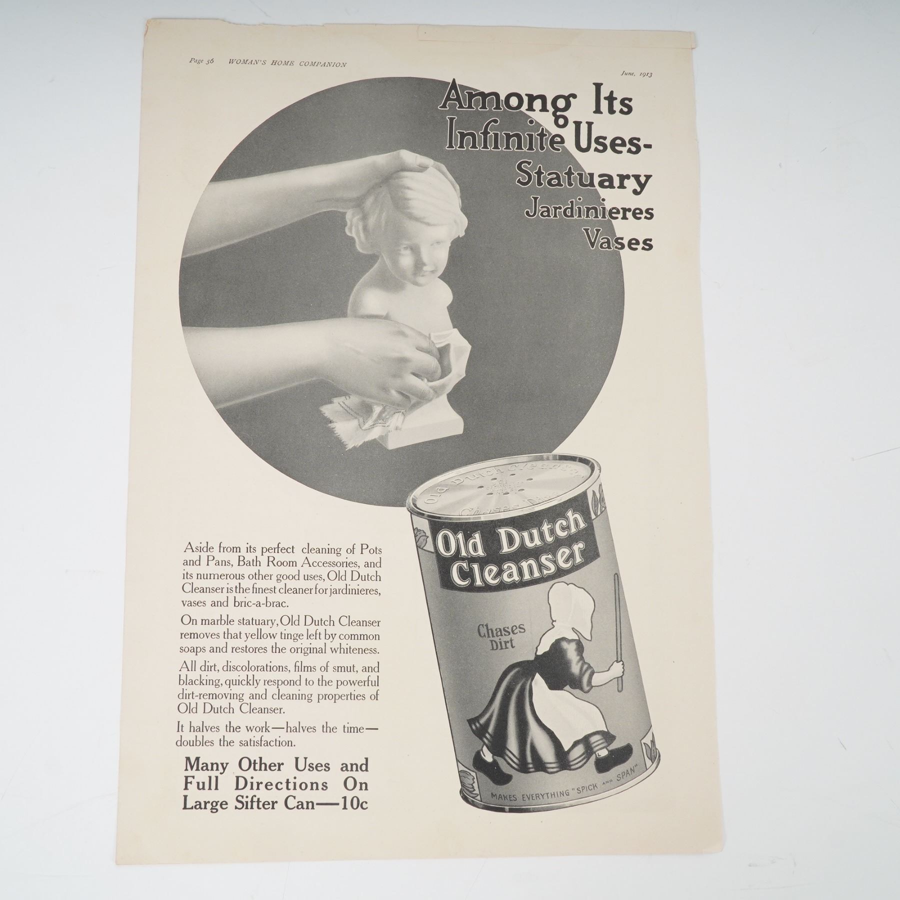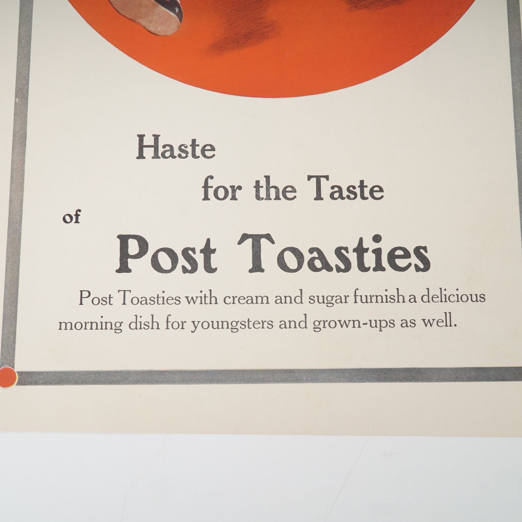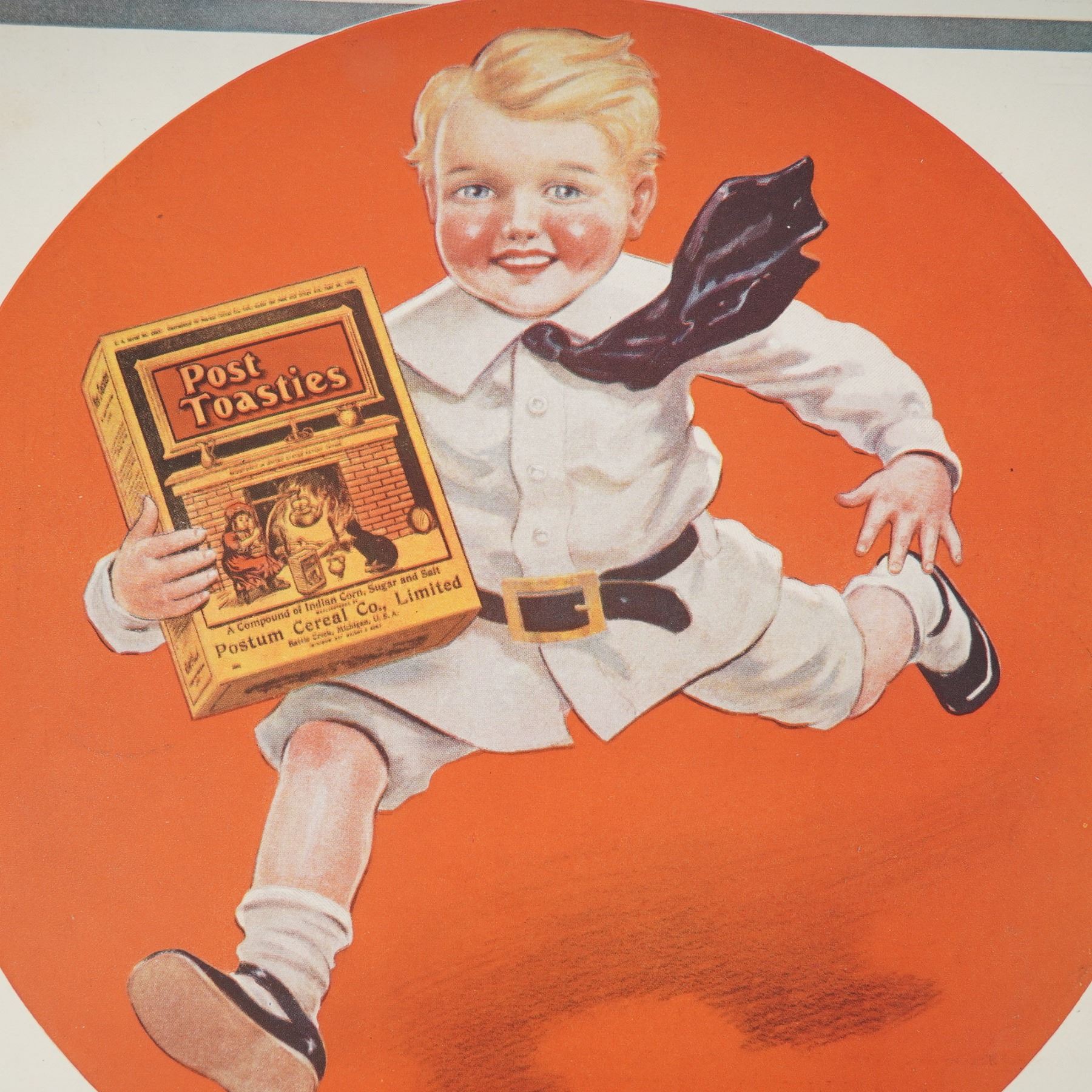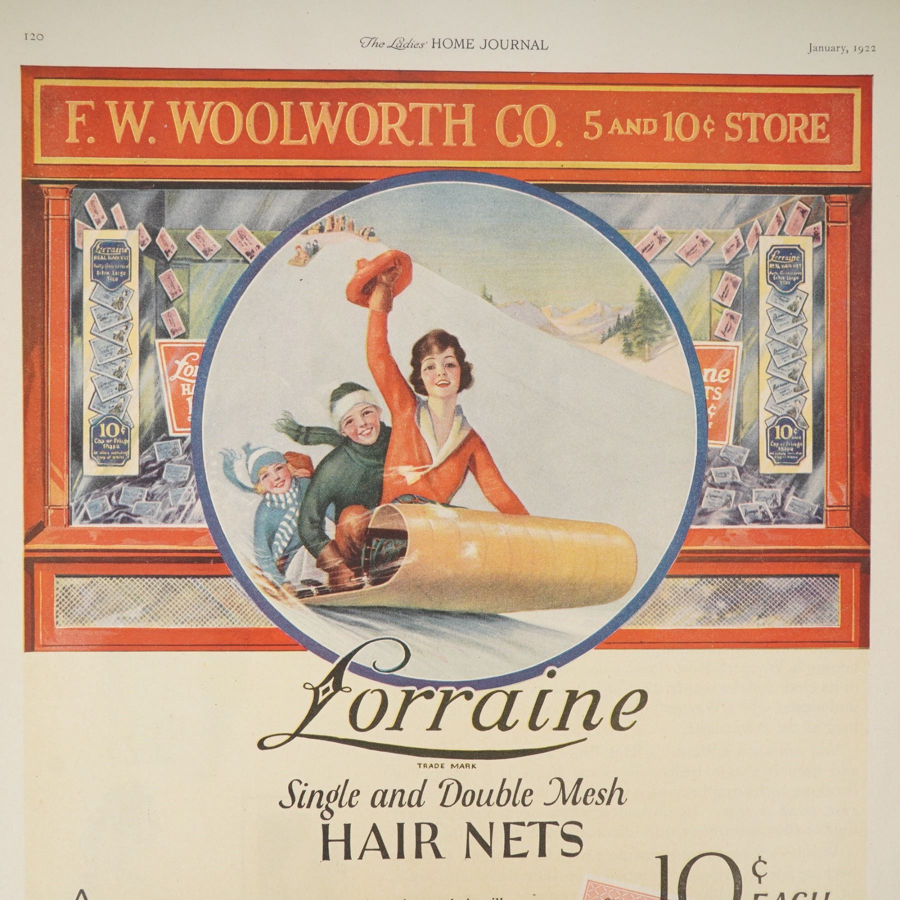 Pair of original vintage magazine advertisements from the early 20th century. The first is a colorful ad for Lorraine Hair Nets, published in the Ladies' Home Journal, January 1922 edition, featuring an Art Deco storefront design and a whimsical illustration of a woman and child with a giant hair net package. The second is a bright and charming ad for Post Toasties cereal from the June 1913 edition of Woman's Home Companion, with a young boy joyfully running with a cereal box. These ads are excellent examples of period advertising and are ideal for framing or ephemera collections. The larger ad measures 11"L x 16.25"H, the smaller measures 10.75"L x 14"H.