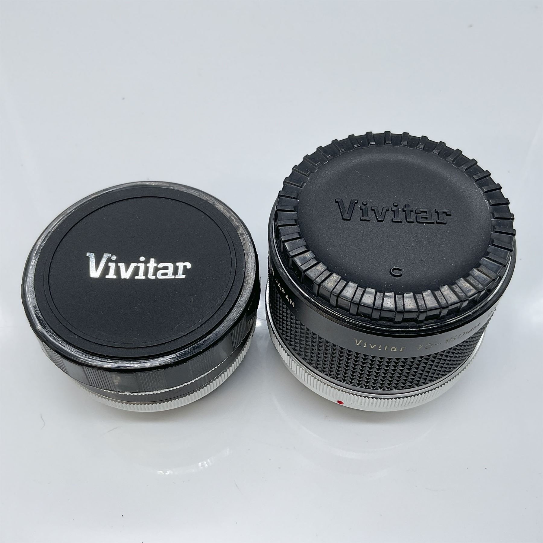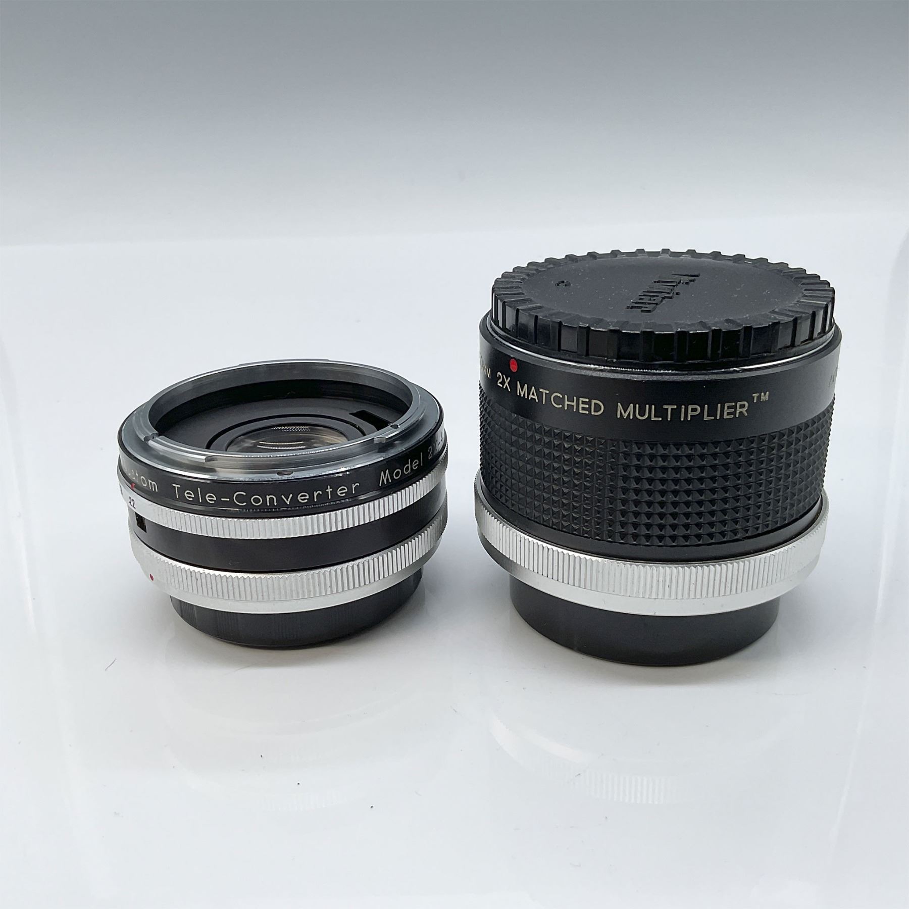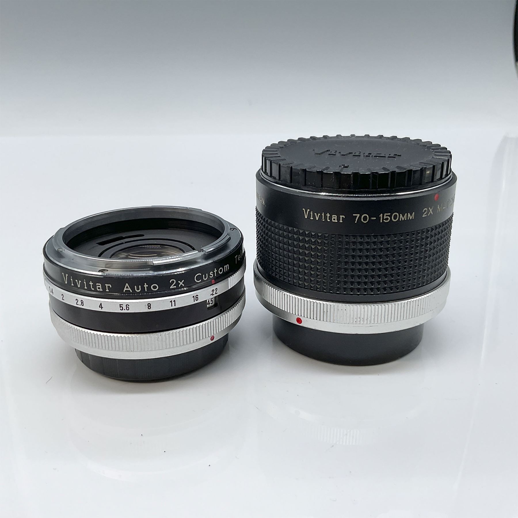 This lot includes two Vivitar camera lenses, both accompanied by their original caps. The larger lens is a Vivitar 70-150mm 2X Matched Multiplier with an approximate height of 2.5". The second lens is a Vivitar Auto 2X Custom Tele-Converter Model 2X-4 with aperture setting range. Both lenses are well-suited for photography enthusiasts or collectors looking for vintage Vivitar equipment.