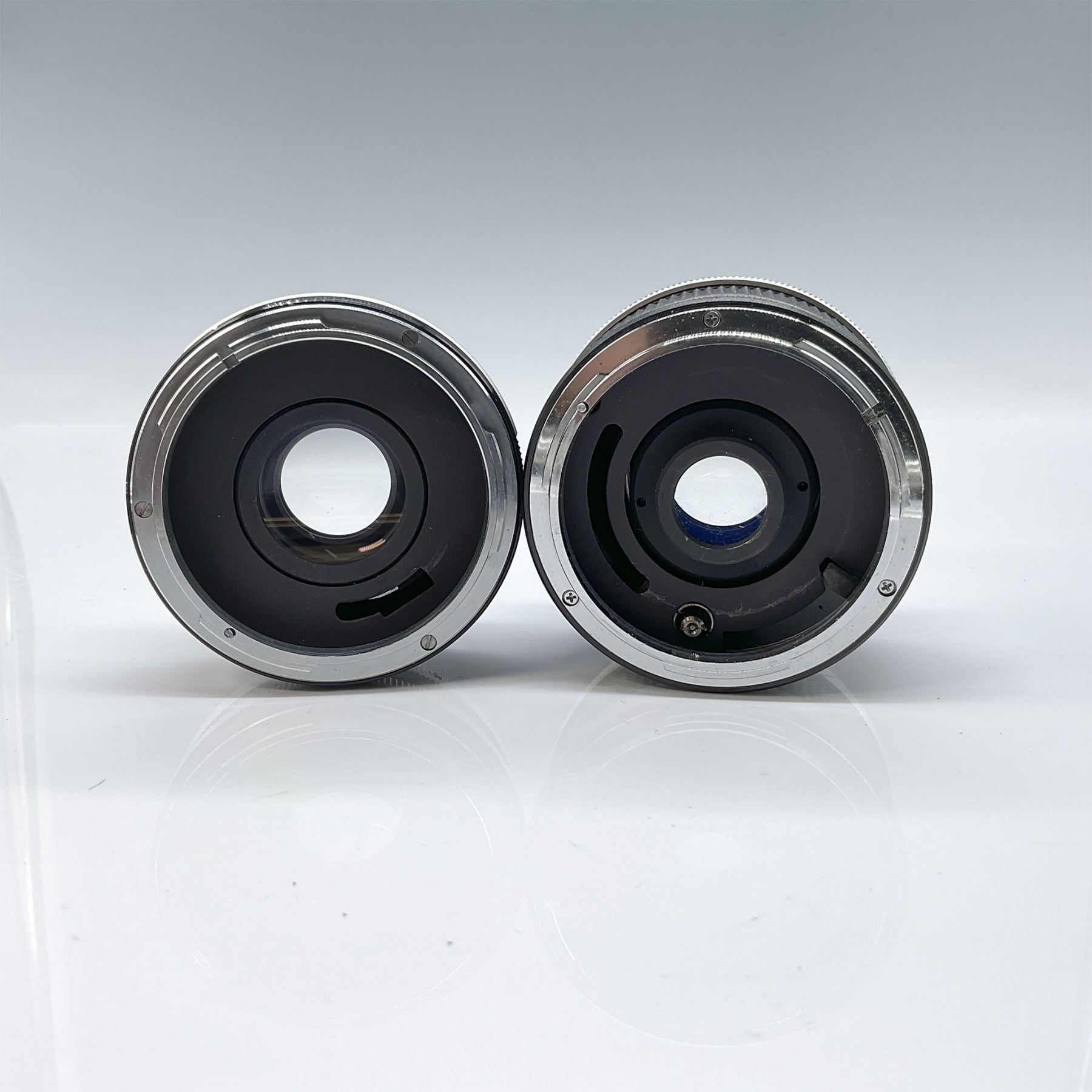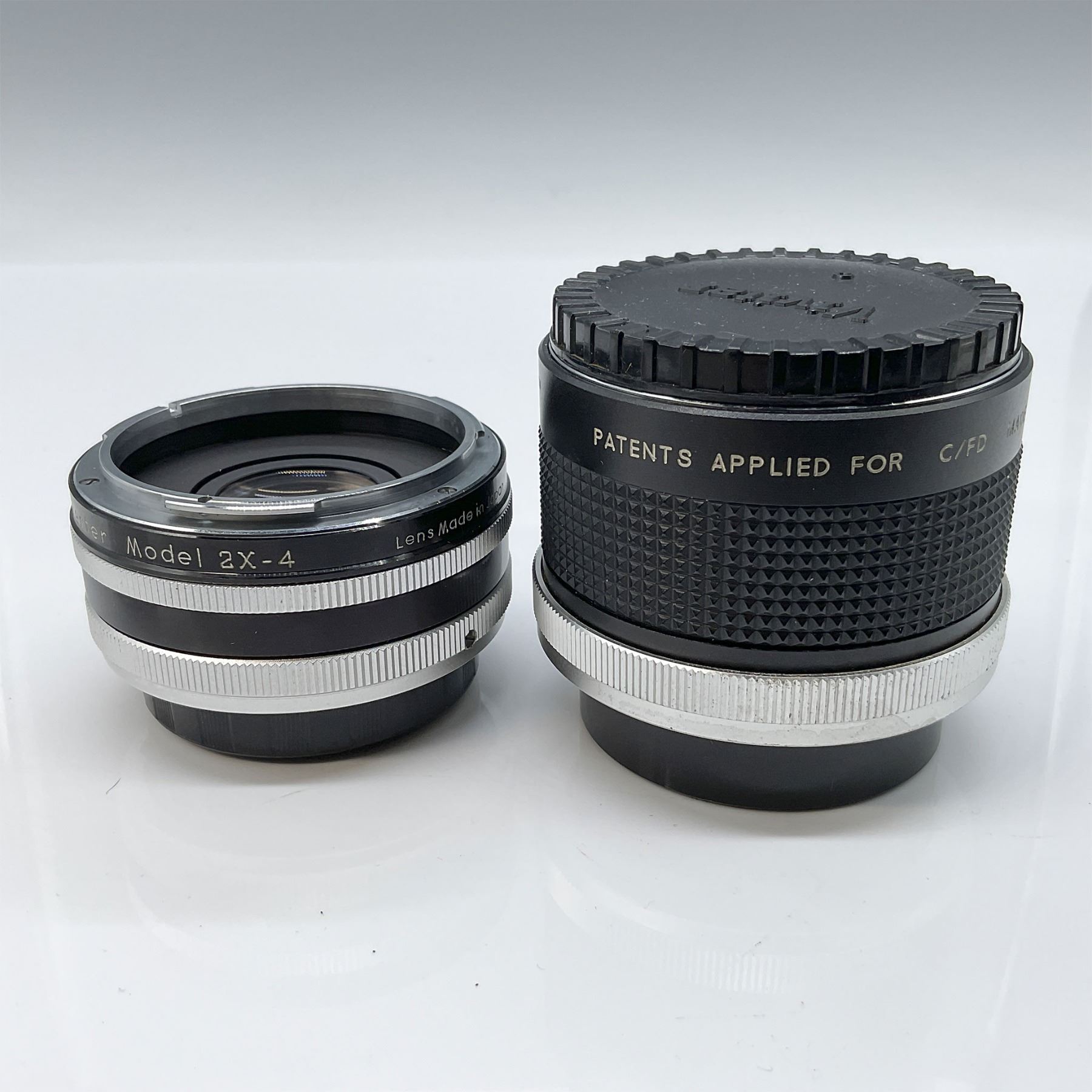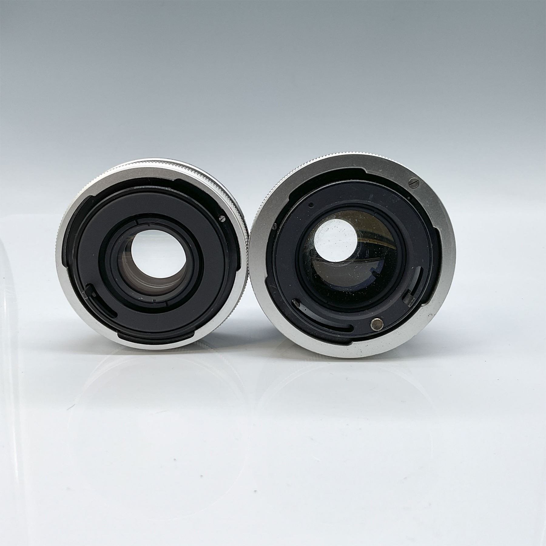 This lot includes two Vivitar camera lenses, both accompanied by their original caps. The larger lens is a Vivitar 70-150mm 2X Matched Multiplier with an approximate height of 2.5". The second lens is a Vivitar Auto 2X Custom Tele-Converter Model 2X-4 with aperture setting range. Both lenses are well-suited for photography enthusiasts or collectors looking for vintage Vivitar equipment.