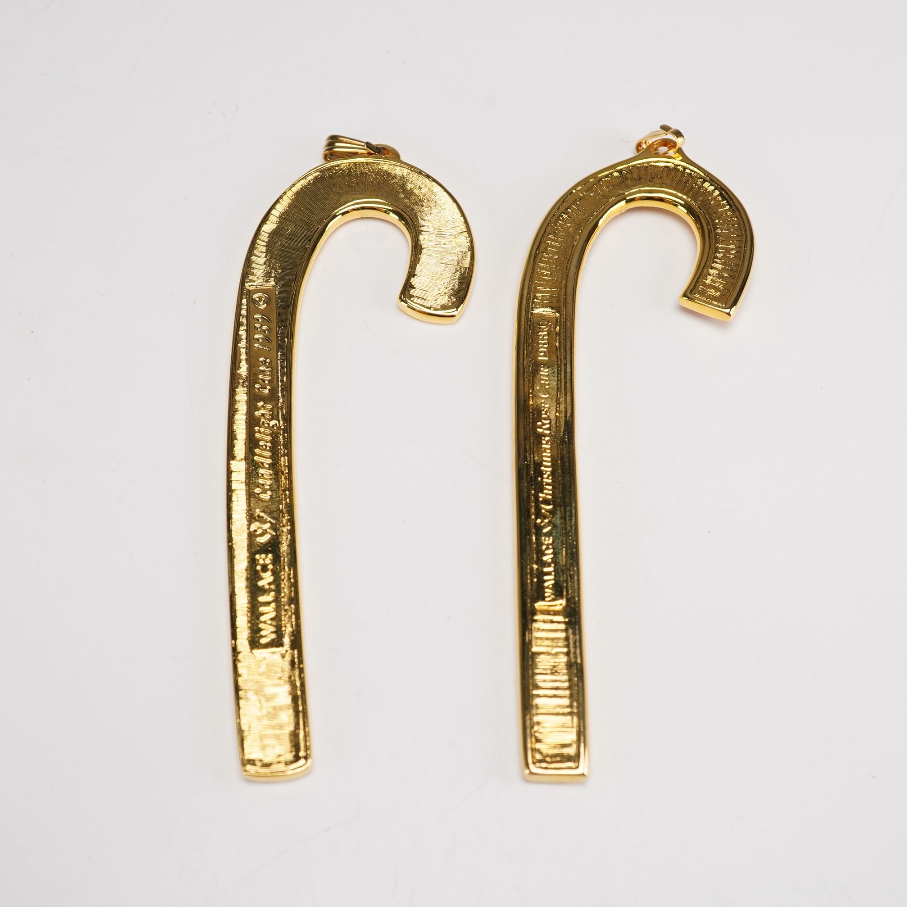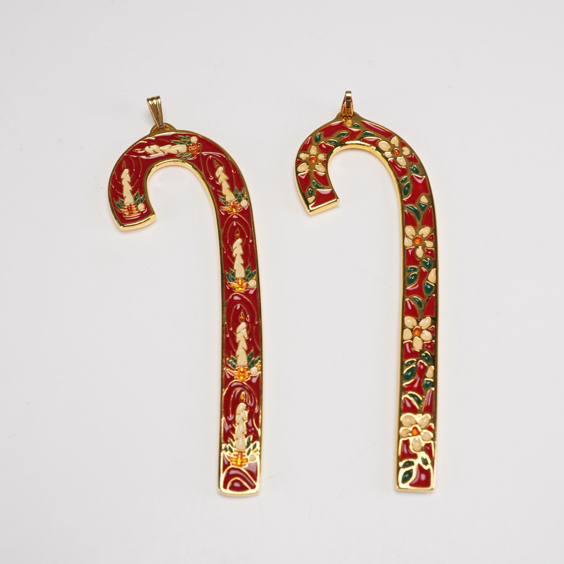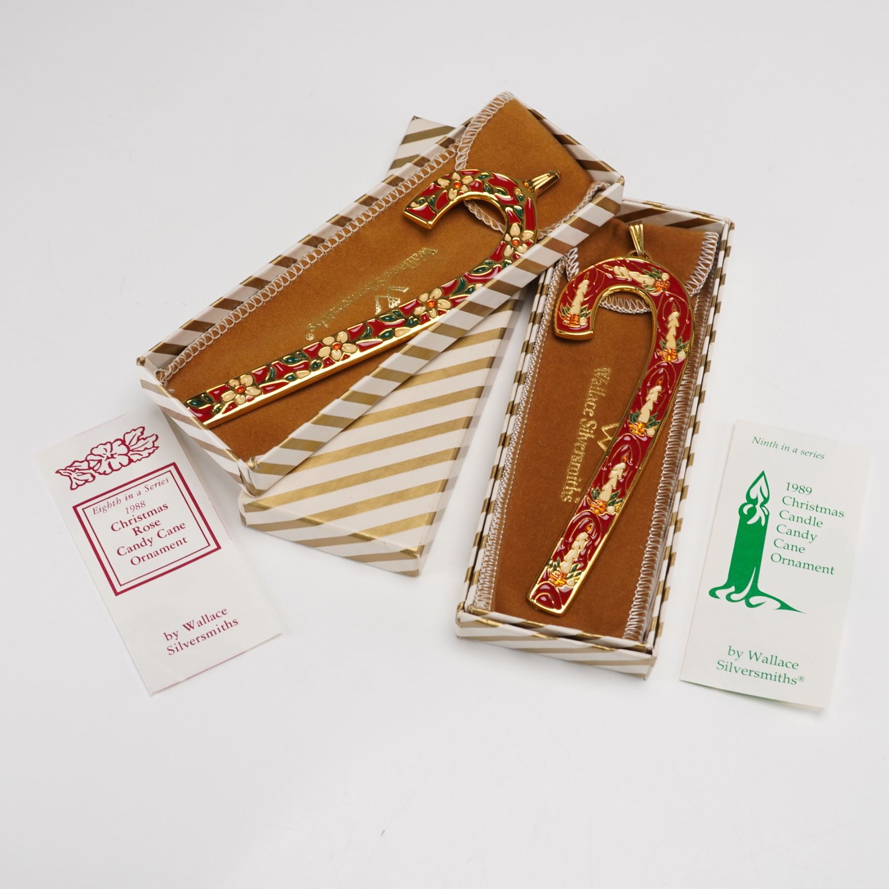 Offered here are two beautifully crafted Wallace Silversmiths Christmas candy cane ornaments from the brand's highly collectible annual holiday series. The 1988 edition, titled Christmas Rose Candy Cane, and the 1989 edition, titled Christmas Candle Candy Cane, are both elegantly designed with rich red and green enamel detailing and finished in gleaming gold plate. Each ornament showcases intricate holiday motifs, from delicate florals to candlelight figures, representing Wallace's signature craftsmanship and festive artistry. Both pieces include their original presentation boxes and inserts, which identify them as the eighth and ninth in the series.