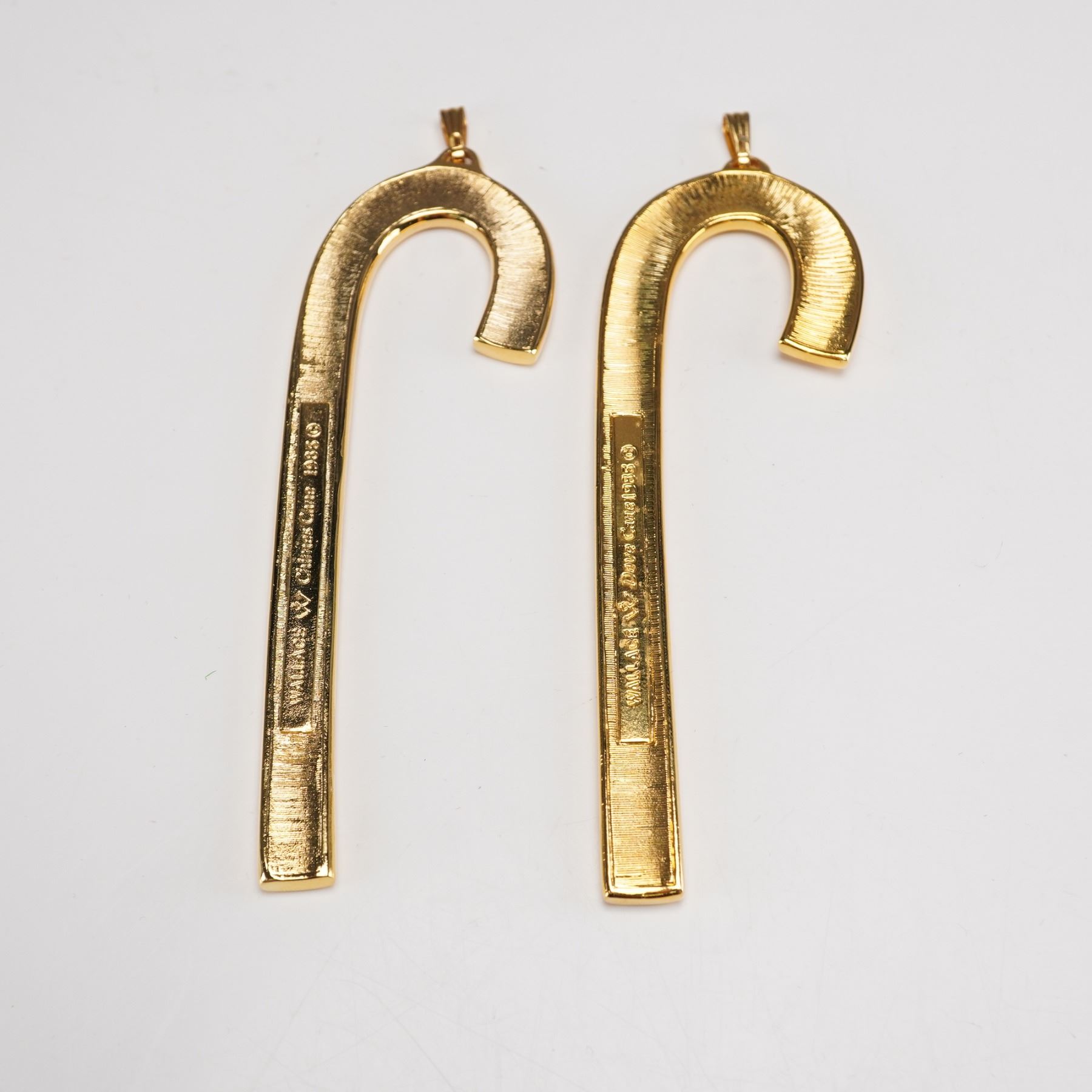 These collectible Wallace Silversmiths Christmas ornaments include the 1985 Dove Candy Cane and the 1986 Chime Candy Cane, each part of the company's beloved annual series. Crafted of solid pewter with rich gold plating and hand-enameled detailing in festive red, green, and ivory, both ornaments feature intricate seasonal motifs of bells, ribbons, holly, and doves. Each comes complete with its original presentation box and corresponding insert card, indicating its year and title in the series. The pair displays beautifully, showcasing Wallace's fine craftsmanship and timeless holiday charm.