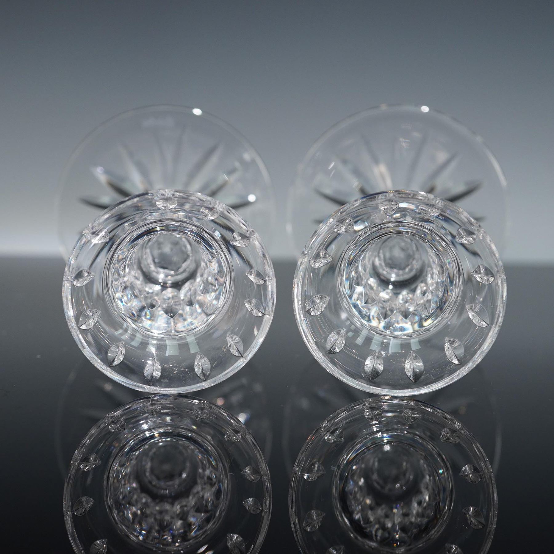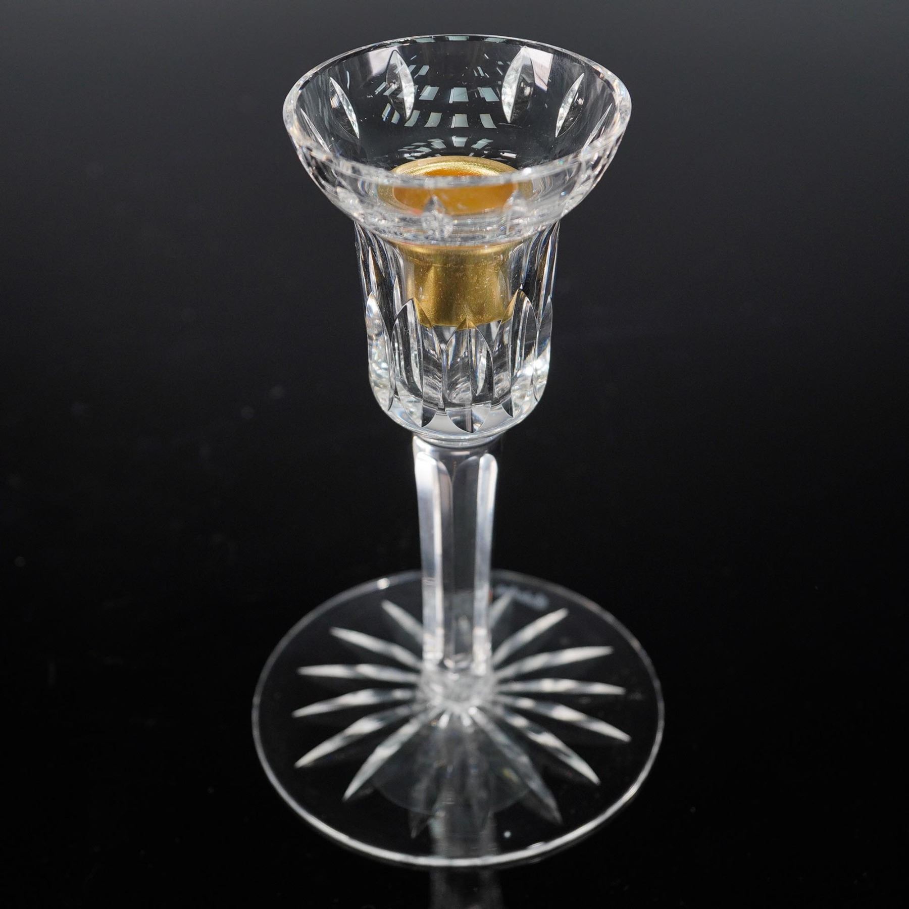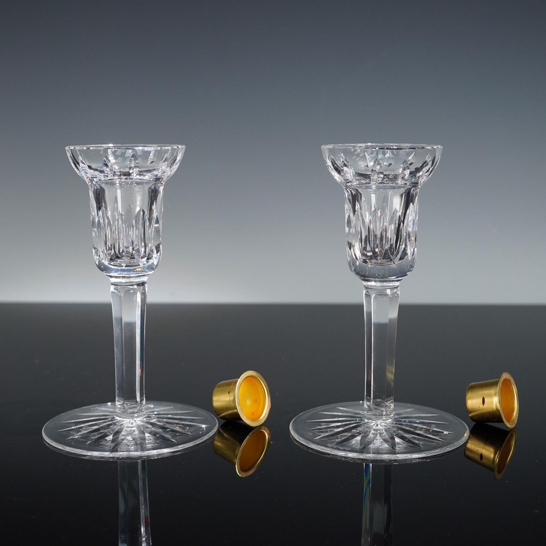 Pair of clear cut crystal candlestick holders by Waterford, each featuring elegant faceted detailing and a broad, star-cut foot for stability. Both pieces are marked with the acid-etched Waterford signature and include removable gold-tone metal inserts designed to hold taper candles. The combination of radiant crystal and gleaming metal adds a refined, versatile touch to any formal setting.