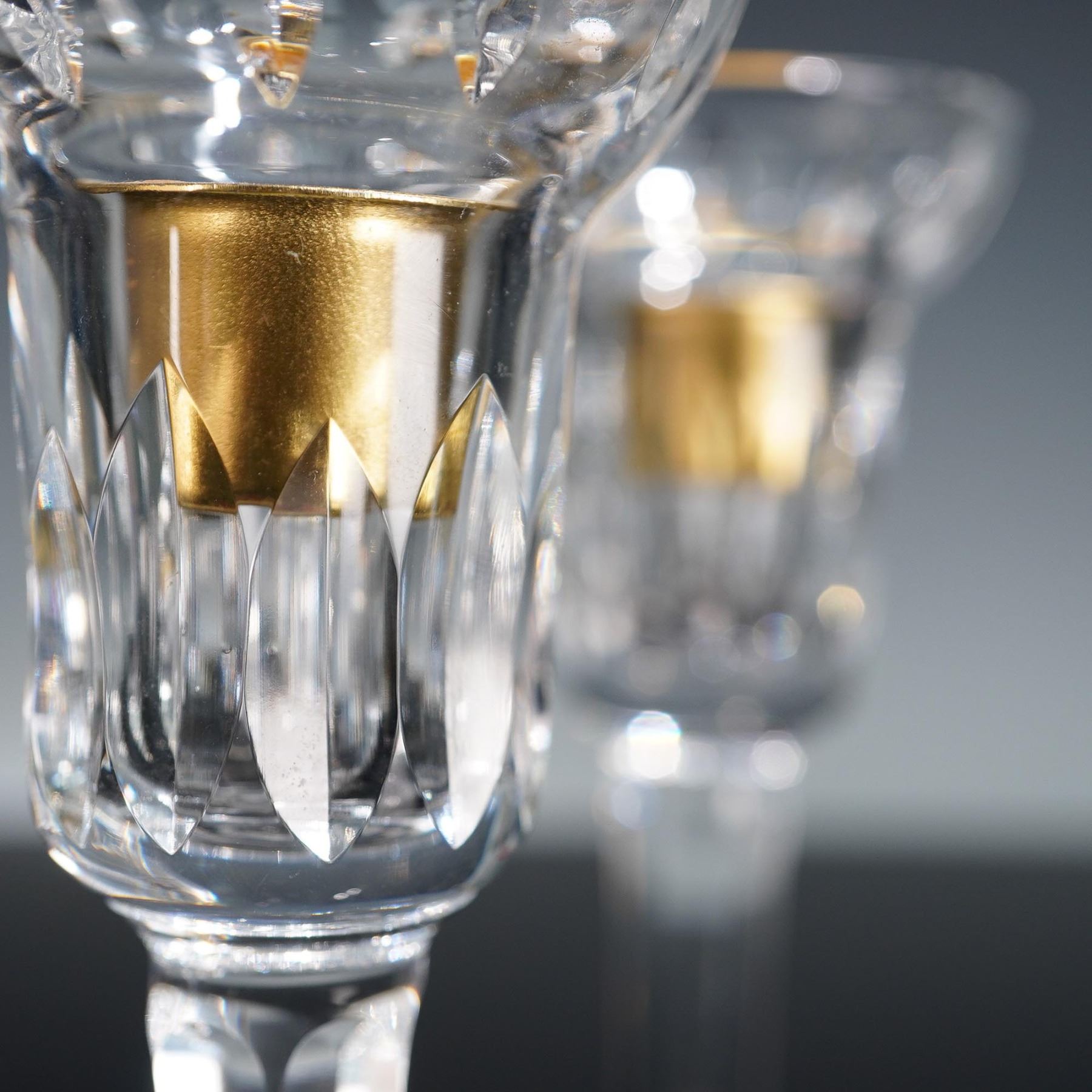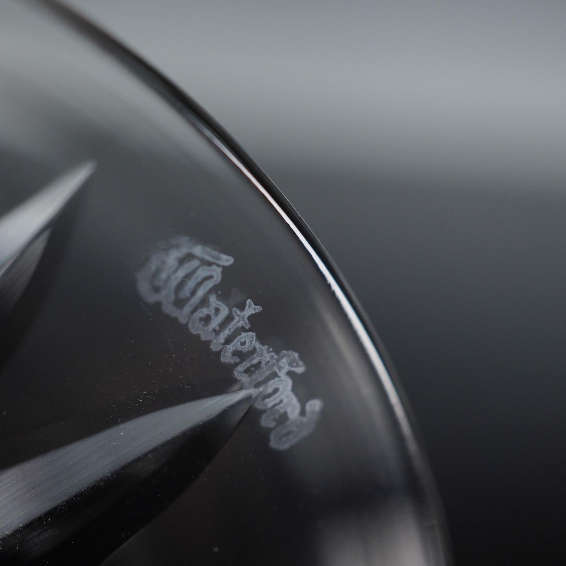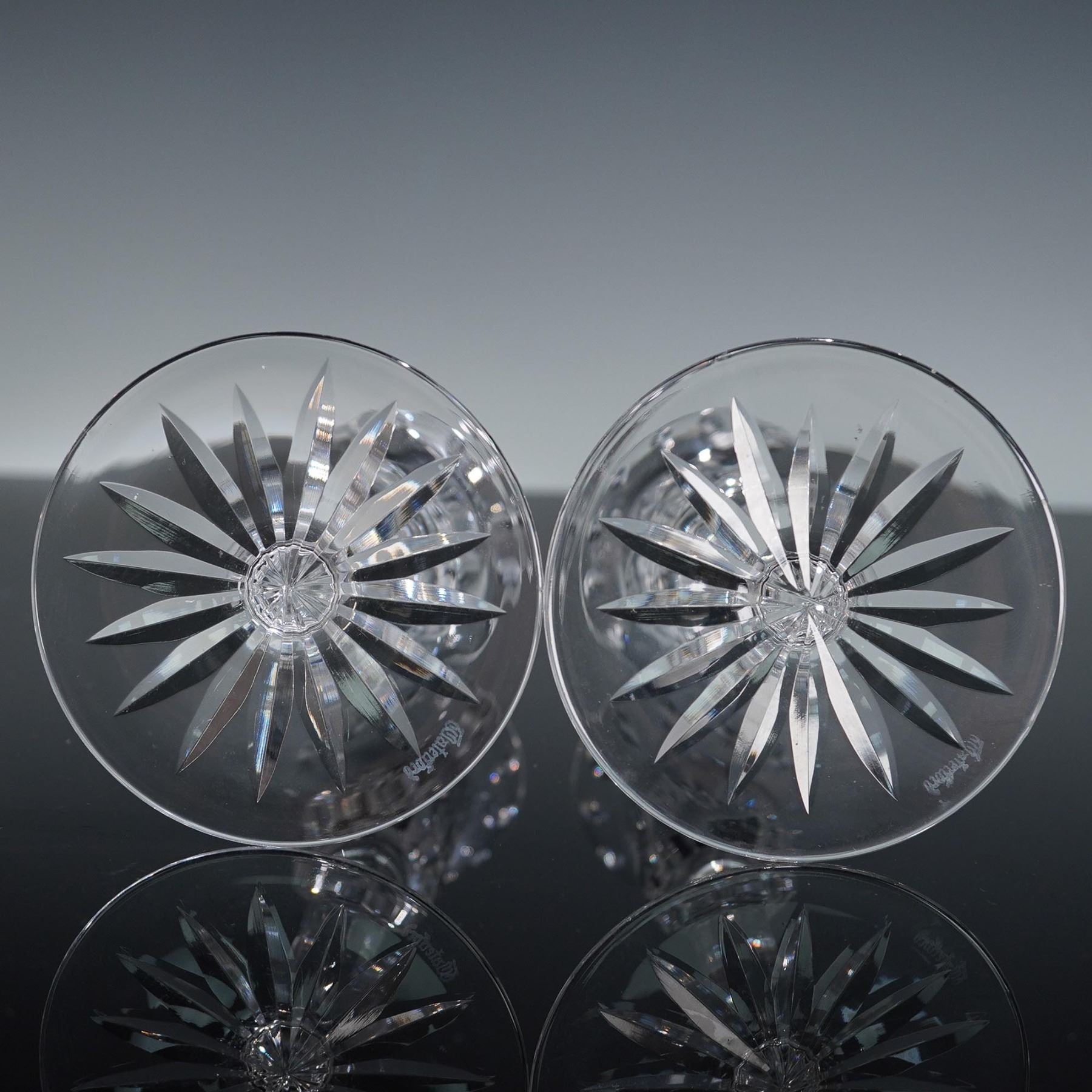 Pair of clear cut crystal candlestick holders by Waterford, each featuring elegant faceted detailing and a broad, star-cut foot for stability. Both pieces are marked with the acid-etched Waterford signature and include removable gold-tone metal inserts designed to hold taper candles. The combination of radiant crystal and gleaming metal adds a refined, versatile touch to any formal setting.