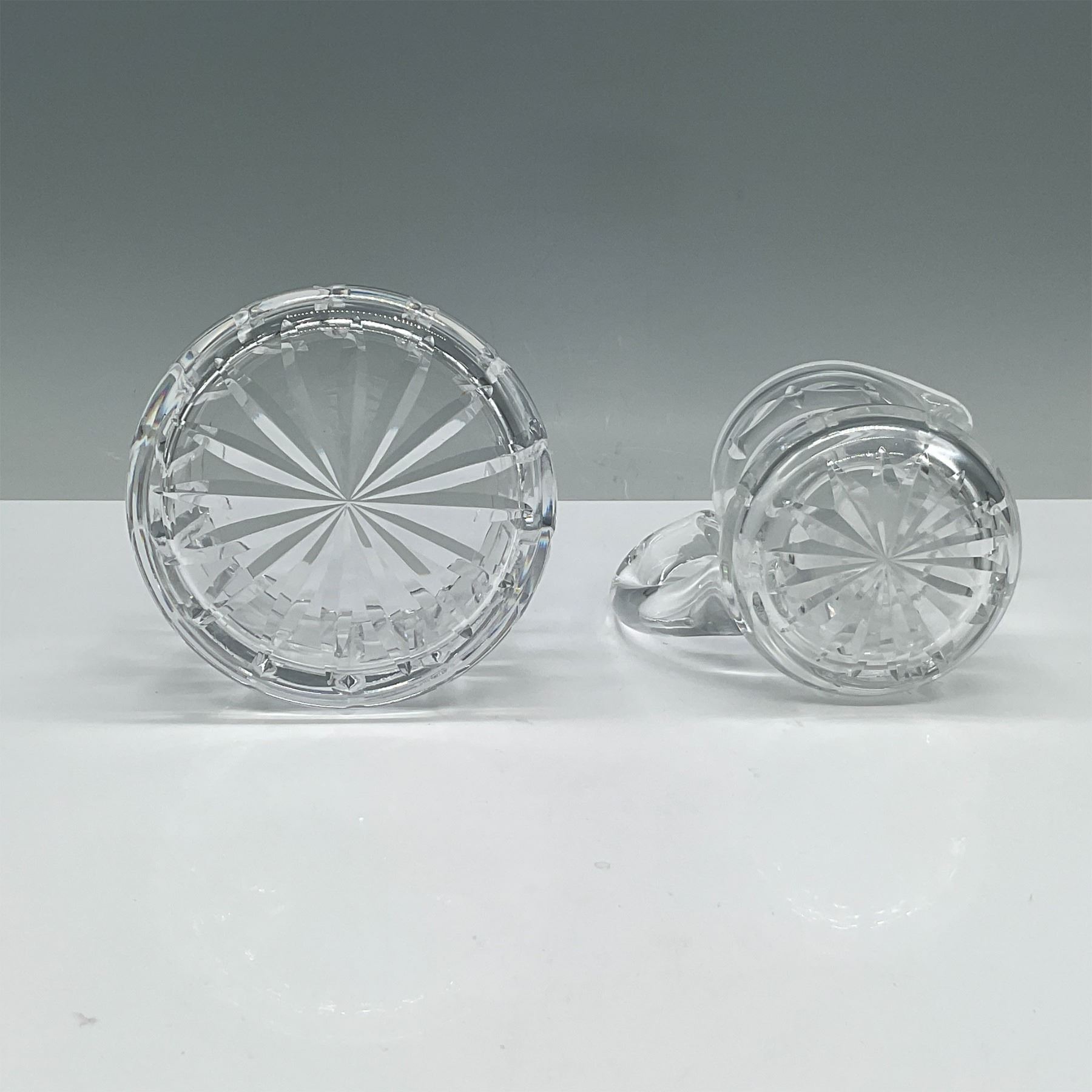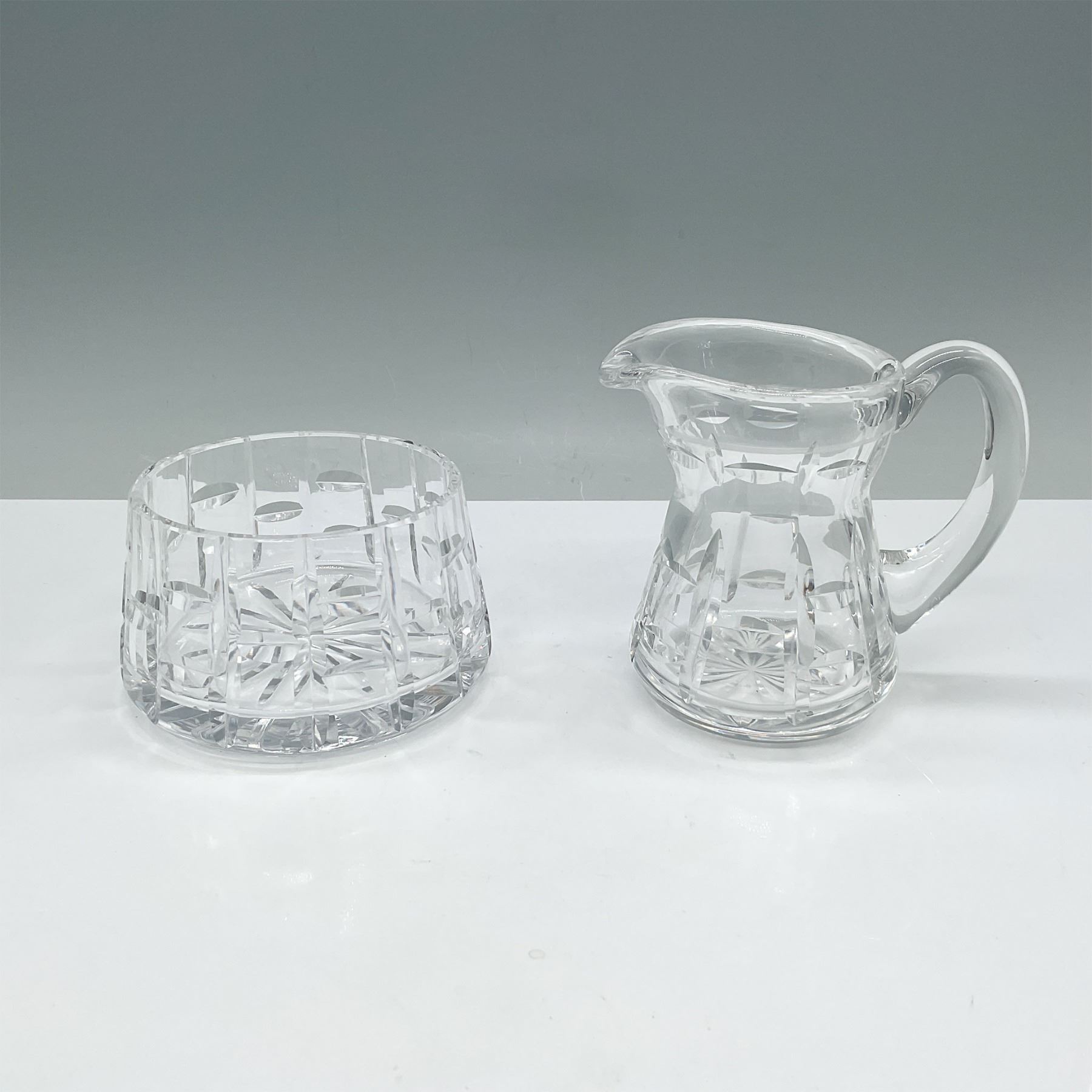 A timeless Waterford crystal set featuring a creamer (4"H) and an open sugar bowl (2.5"H). Both pieces display the brand's renowned craftsmanship with intricate cut designs, starburst bases, and radiant clarity. The pieces bear the acid-etched Waterford backstamp on their bases, authenticating their origin and quality. This elegant set is ideal for enhancing your table setting or adding to a collection of fine crystal.