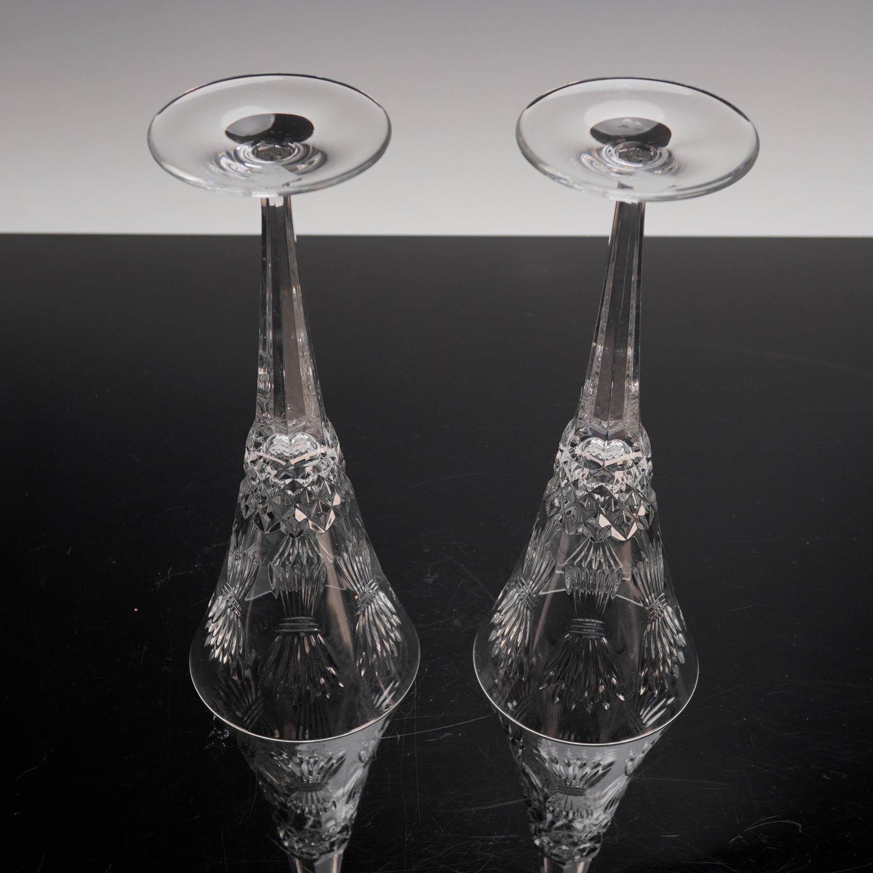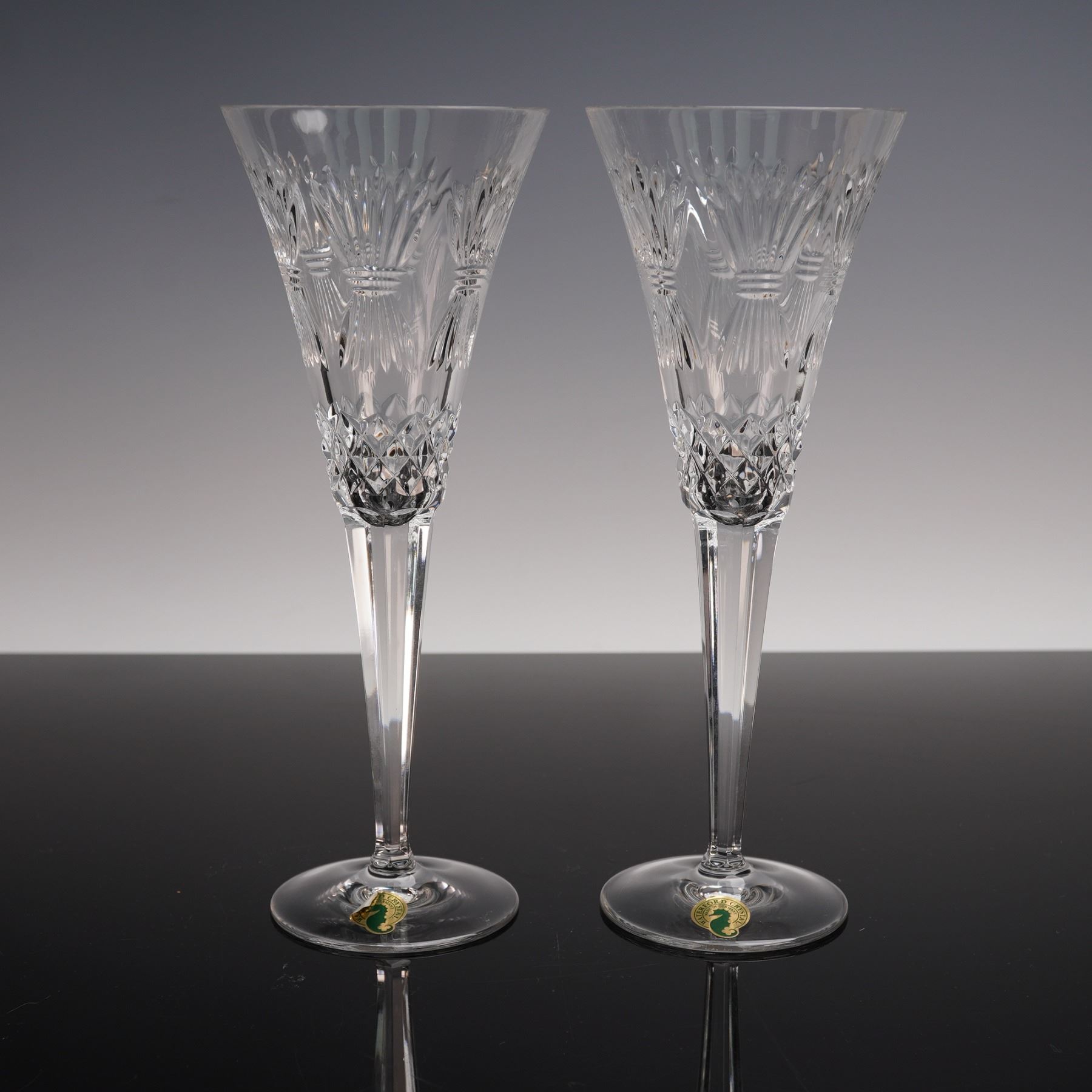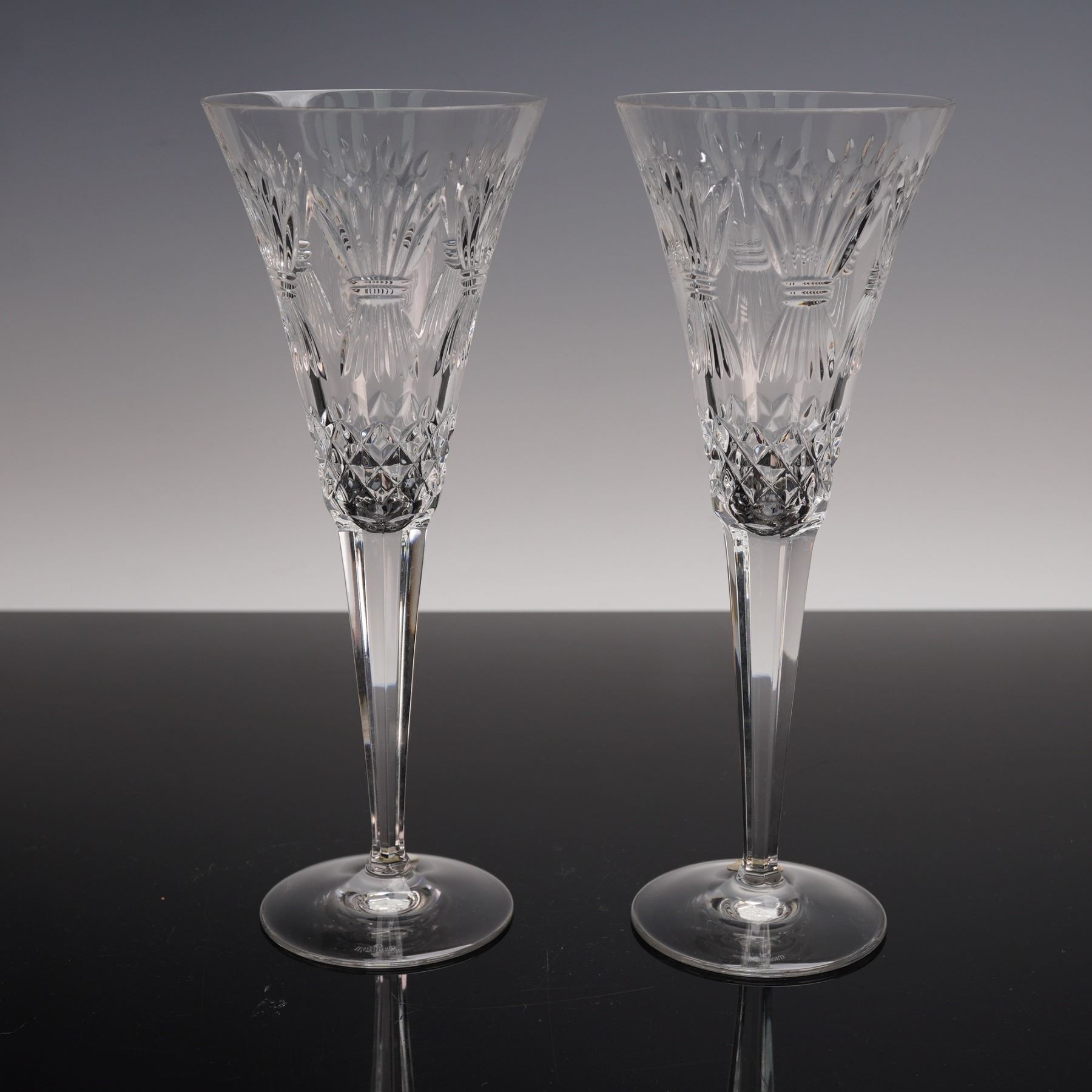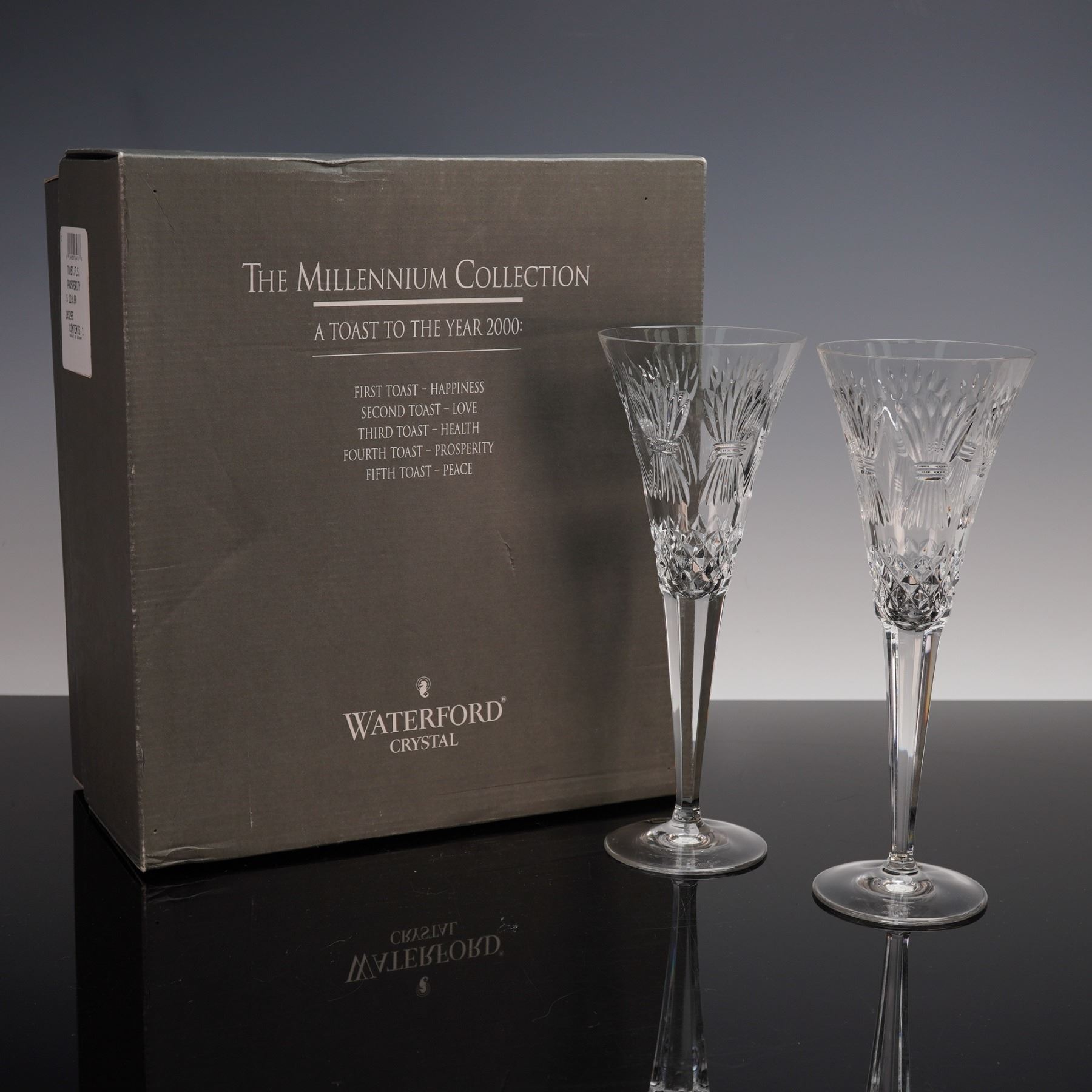 A pair of Waterford Crystal Millennium Series Prosperity champagne flutes with tall slender stems and brilliant faceted bowls. The intricate cut patterns sparkle beautifully in the light making these glasses elegant symbols of luxury and celebration. Waterford backstamp. Waterford manufacturing sticker. This item has its original box. Box measures: 12"L x 10.75"W x 12"H.