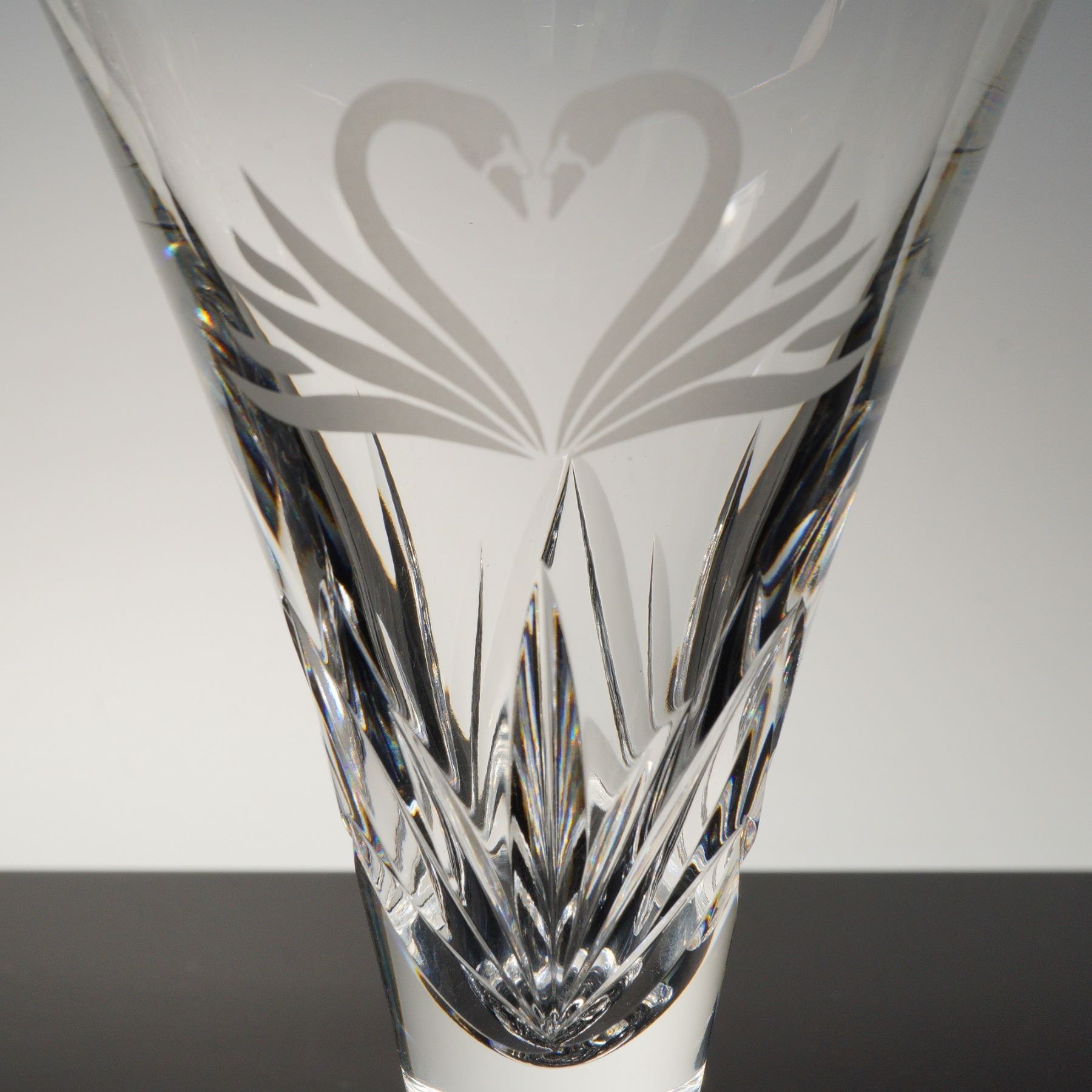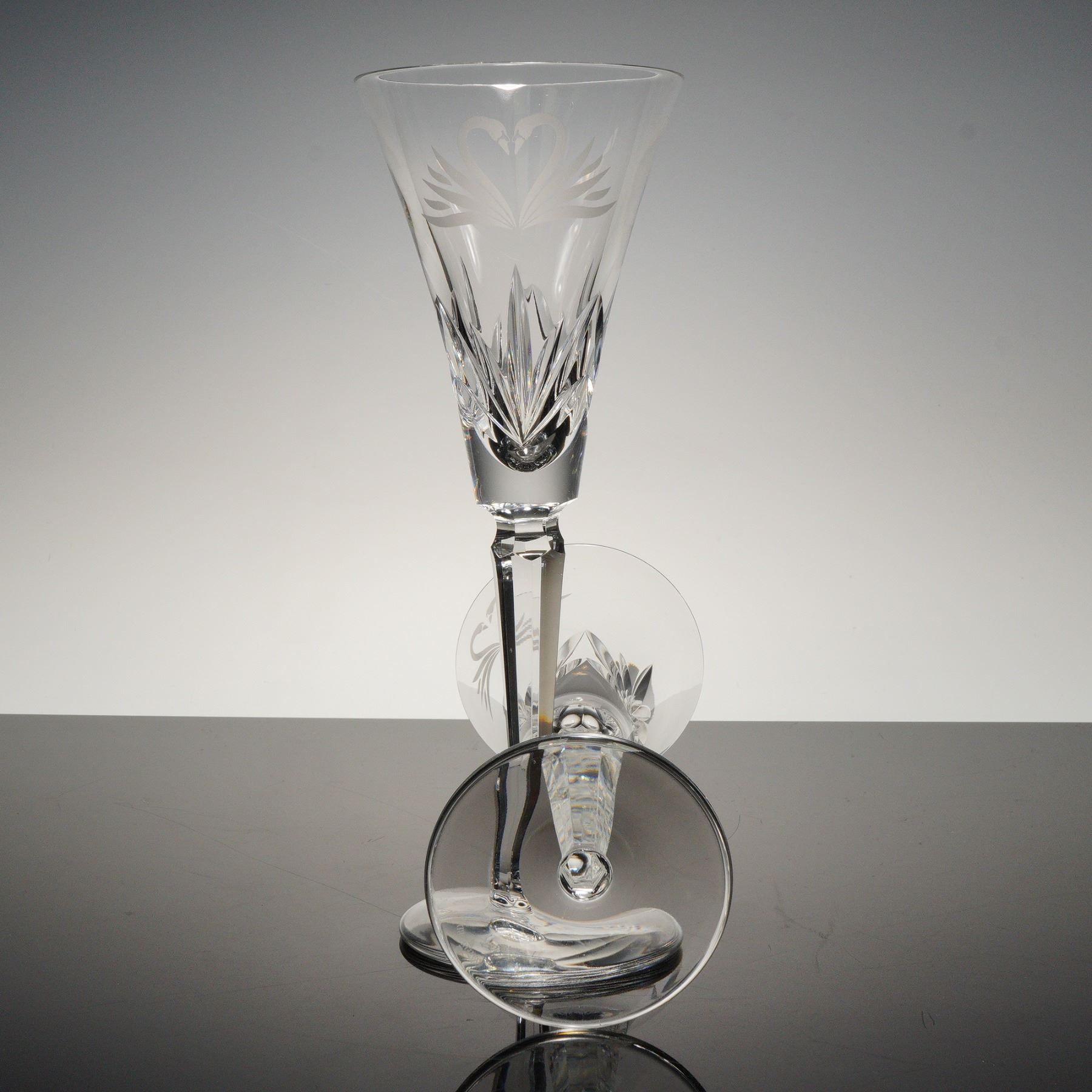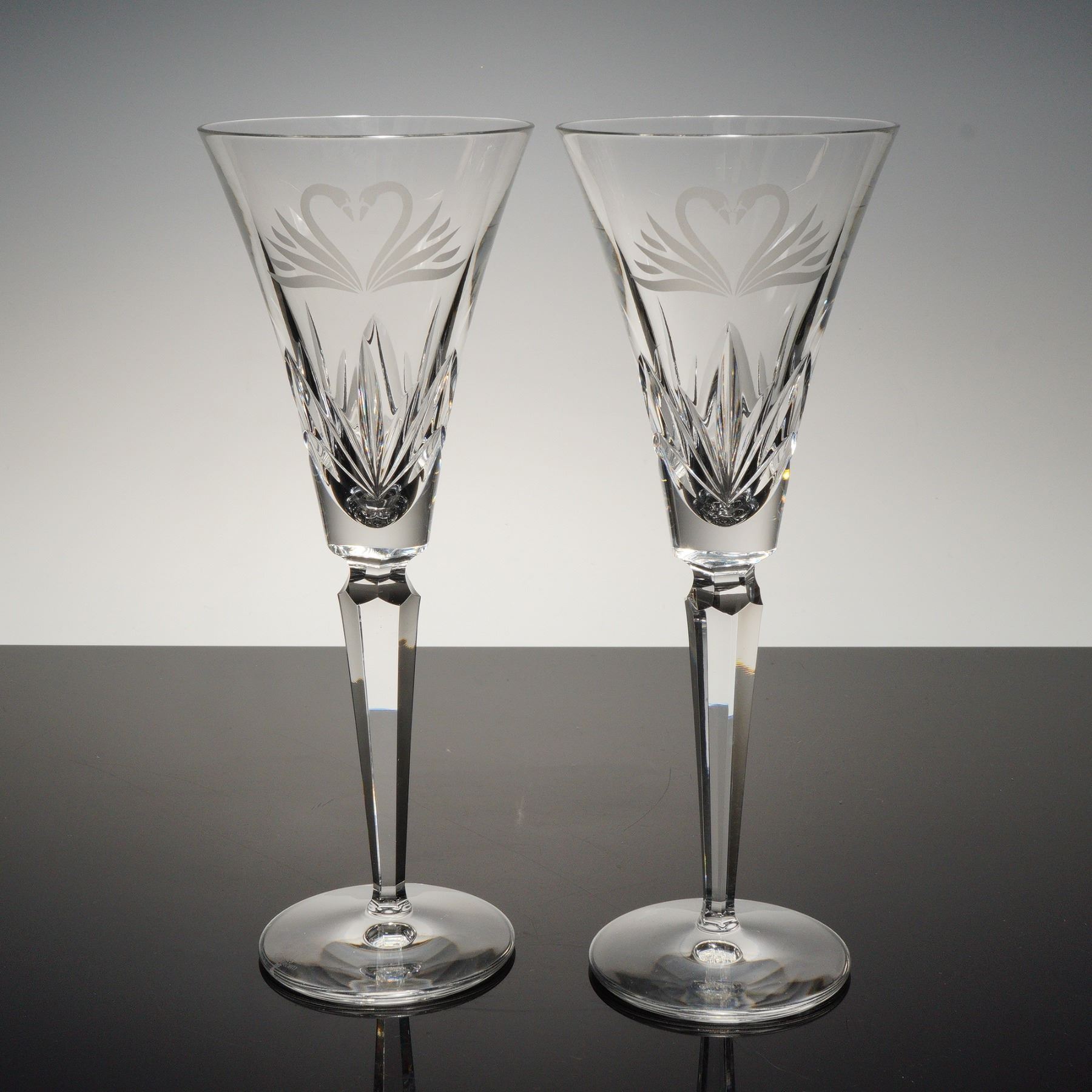 A beautiful pair of Waterford Crystal toasting flutes from The Wedding Collection, exquisitely crafted in fine lead crystal and featuring the iconic etched swan motif forming a heart above brilliant, deeply cut facets. These elegant glasses capture light with dazzling clarity, highlighting Waterford's renowned craftsmanship and timeless design. Each flute is finished with a faceted stem and circular base etched with the Waterford mark, ensuring authenticity. Perfect for weddings, anniversaries, or display, this pair embodies enduring romance and refined elegance.