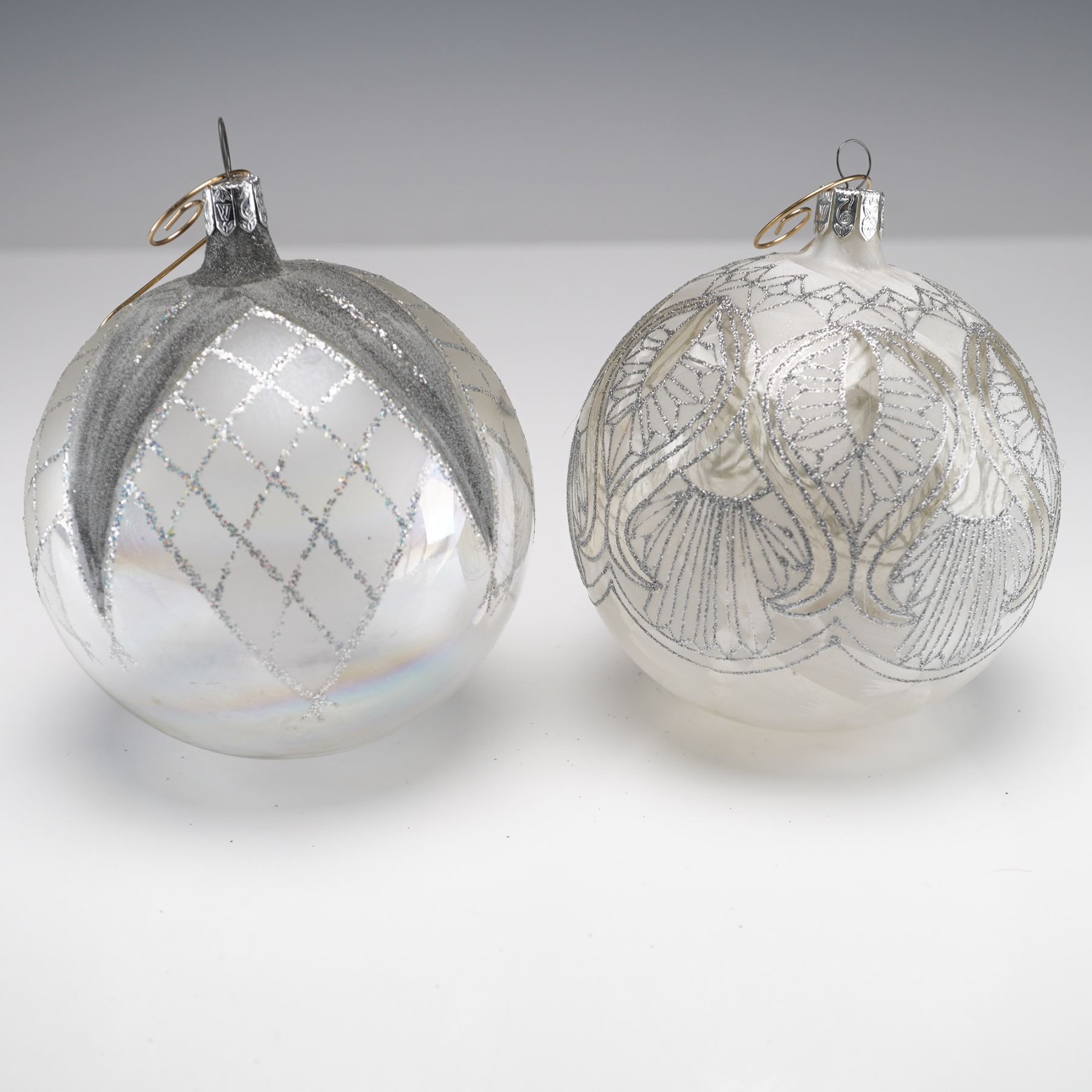 This pair of Waterford Holiday Heirloom ornaments showcases a refined winter elegance with a cool silver palette. The Avoca iridescent ball has a clear glass body with a silvery diamond lattice pattern and frosted detailing near the top, creating a luminous and airy look. Beside it, the Peacock Ice ball features a soft pearl tone with intricate silver glitter designs inspired by peacock feathers, adding graceful texture and movement. Together, they offer a sophisticated complement to any holiday tree with their sparkling details and timeless style. Waterford backstamp. This item has its original box. Largest box measures: 5.25"L x 5.25"W x 5"H.