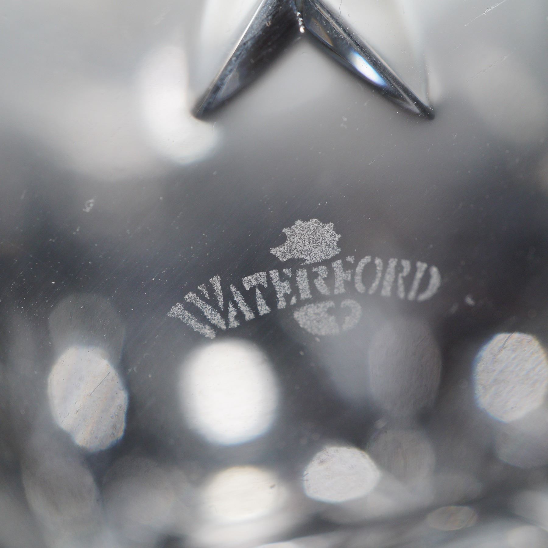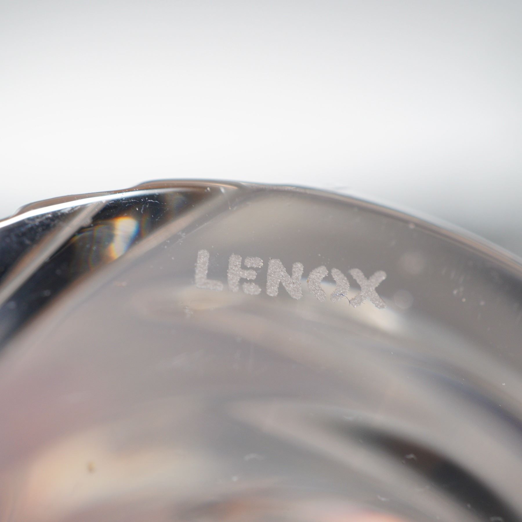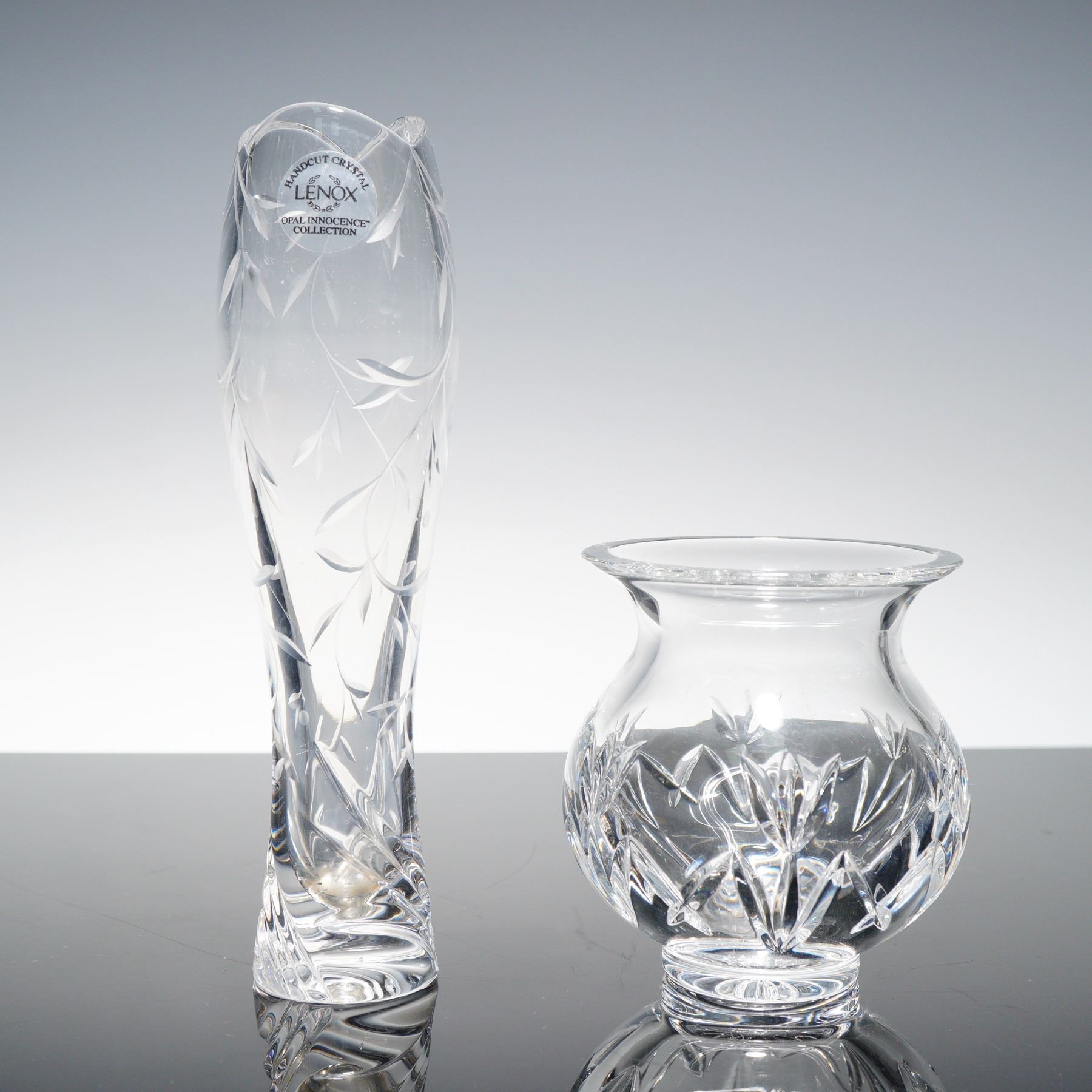 A pair of crystal vases including a Waterford vase in the Thank You pattern with a distinctive cut design and marked Waterford on the base, paired with a Lenox vase from the Opal Innocence Collection featuring an etched leaf motif and displaying both a Lenox sticker on the side and an acid etched Lenox mark on the underside.