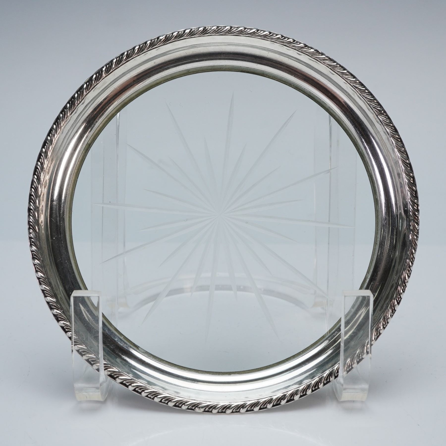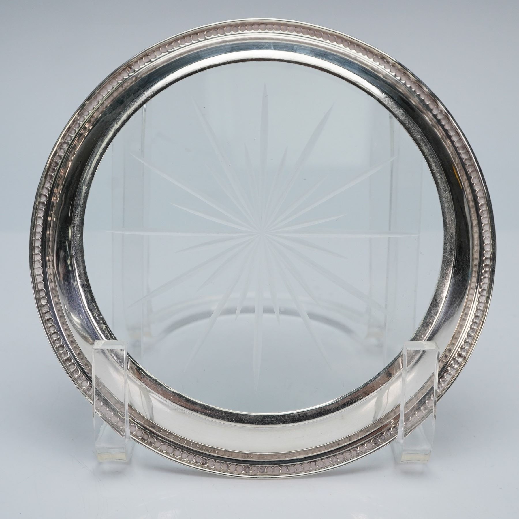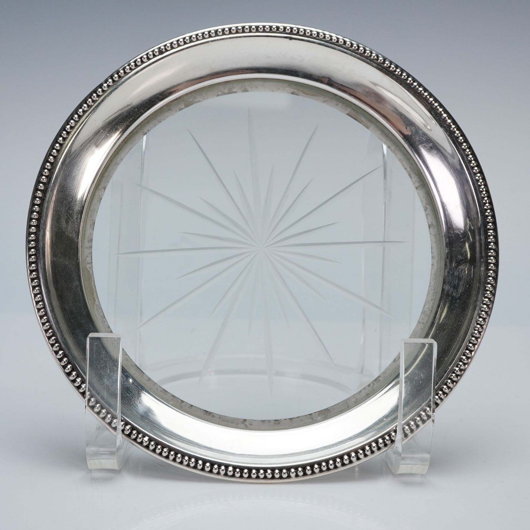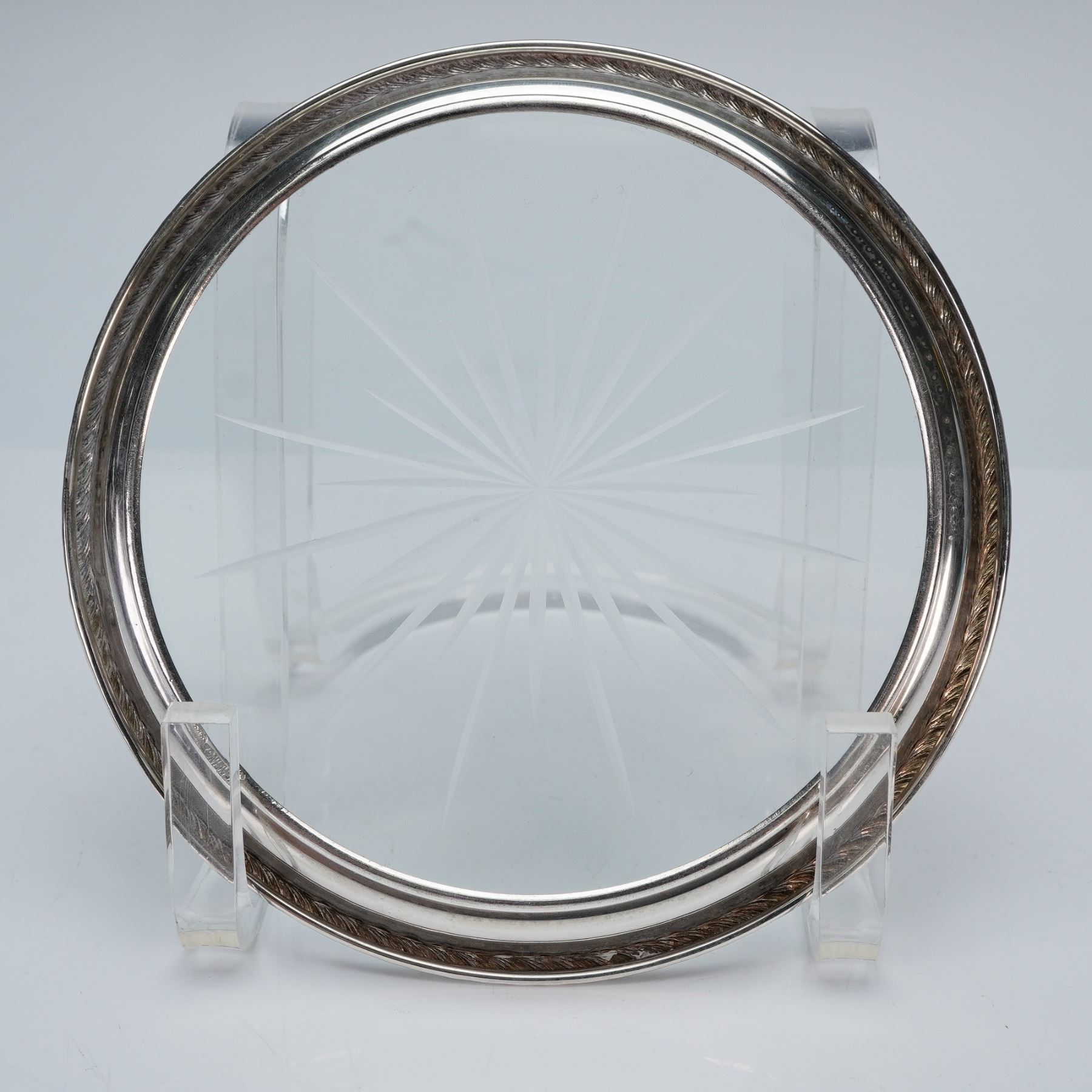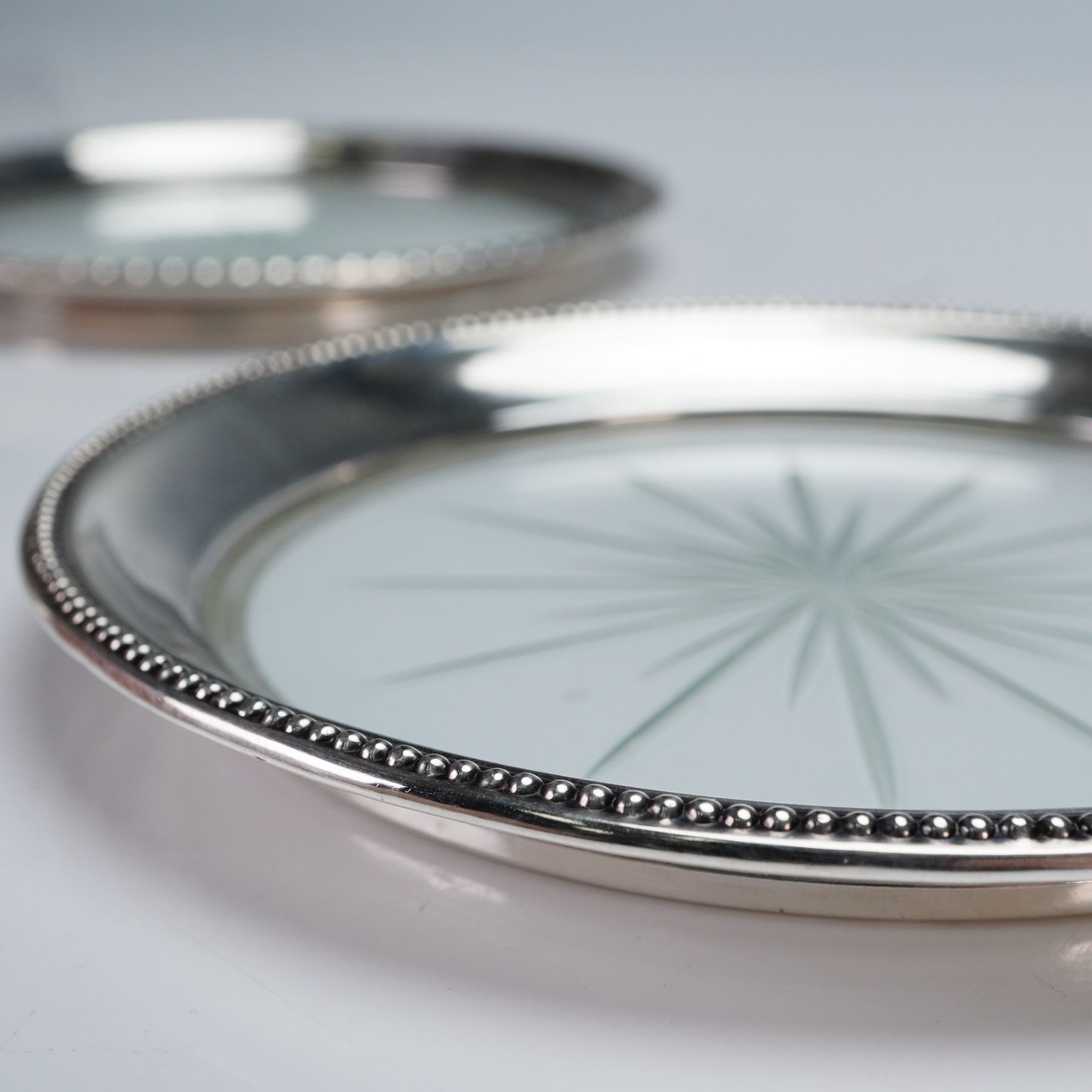 A classical set of two sterling and glass wine coasters. Each coaster showcases a circular glass base intricately cut with a starburst motif and the sterling silver is decorated with beaded and rope pattern along the rim. Rope pattern is hallmarked Sterling with Webster & Co stylized W with feathered arrow. Beaded pattern is stamped Franklin M. Whiting & Co Sterling. Total Weight of both Sterling and Glass: 172.91 g.