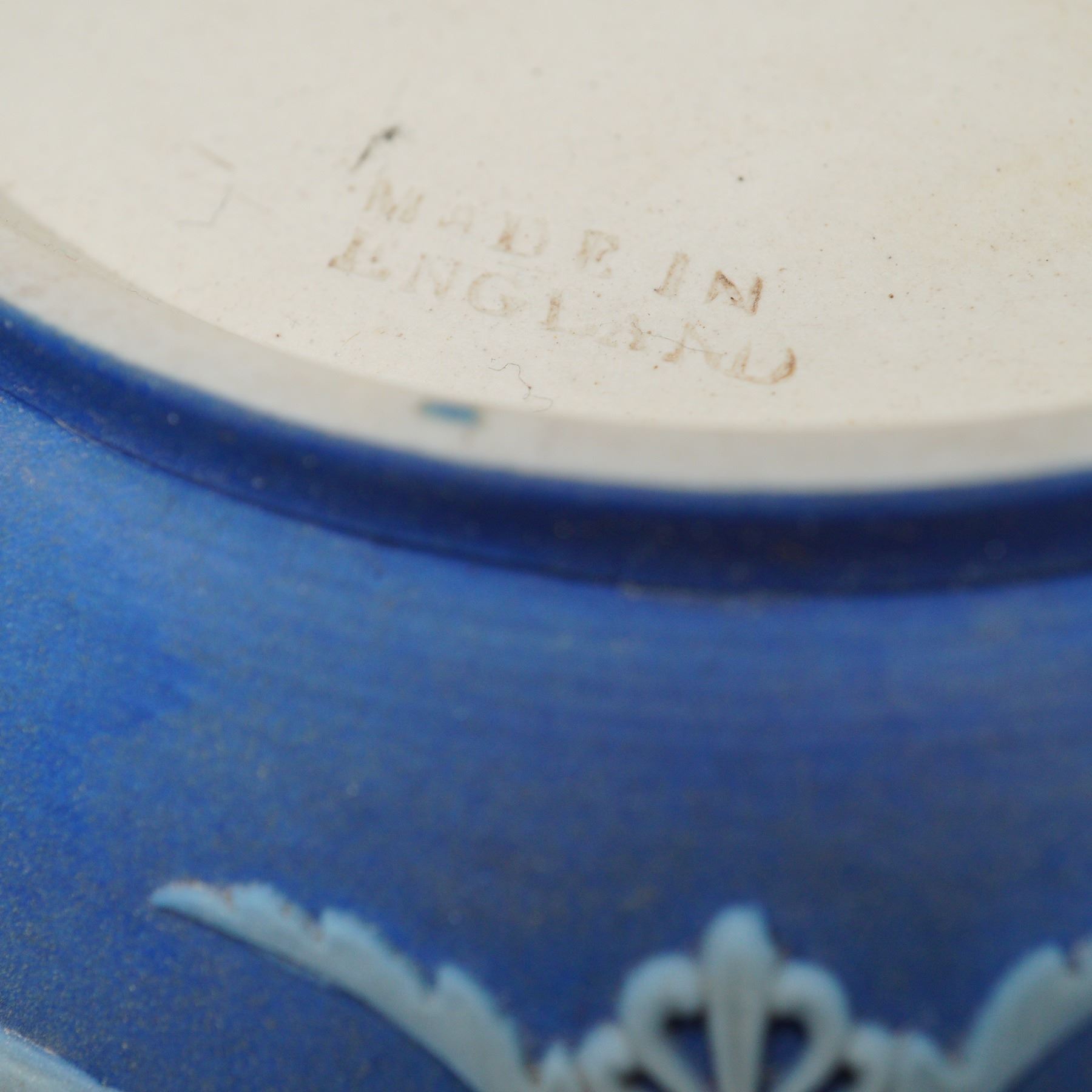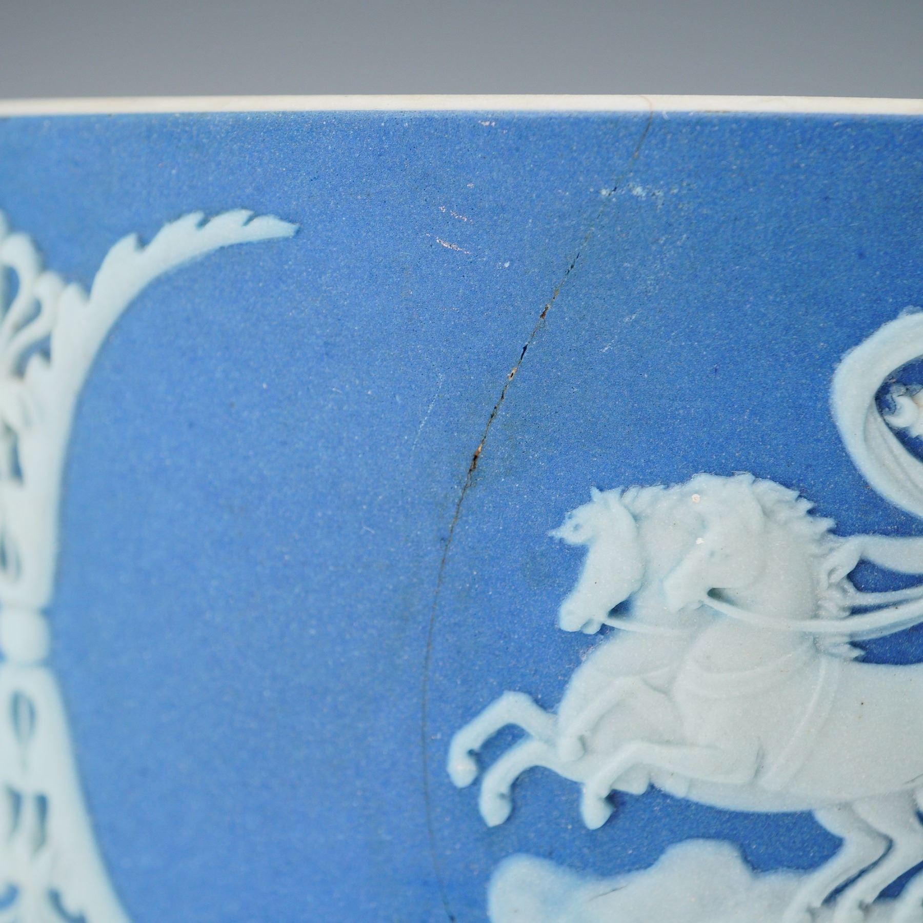 Two jasperware vessels comprising a tripodal round bowl with applied white classical figural medallions, and a lidded biscuit barrel of compressed form with plated metal swing handle and finial, similarly decorated with relief neoclassical scenes. The interior of the lid is hallmarked with H.F & Co. S for Harrison Fisher & Co. Ltd EPNS. Wedgwood Made in England backstamp.
