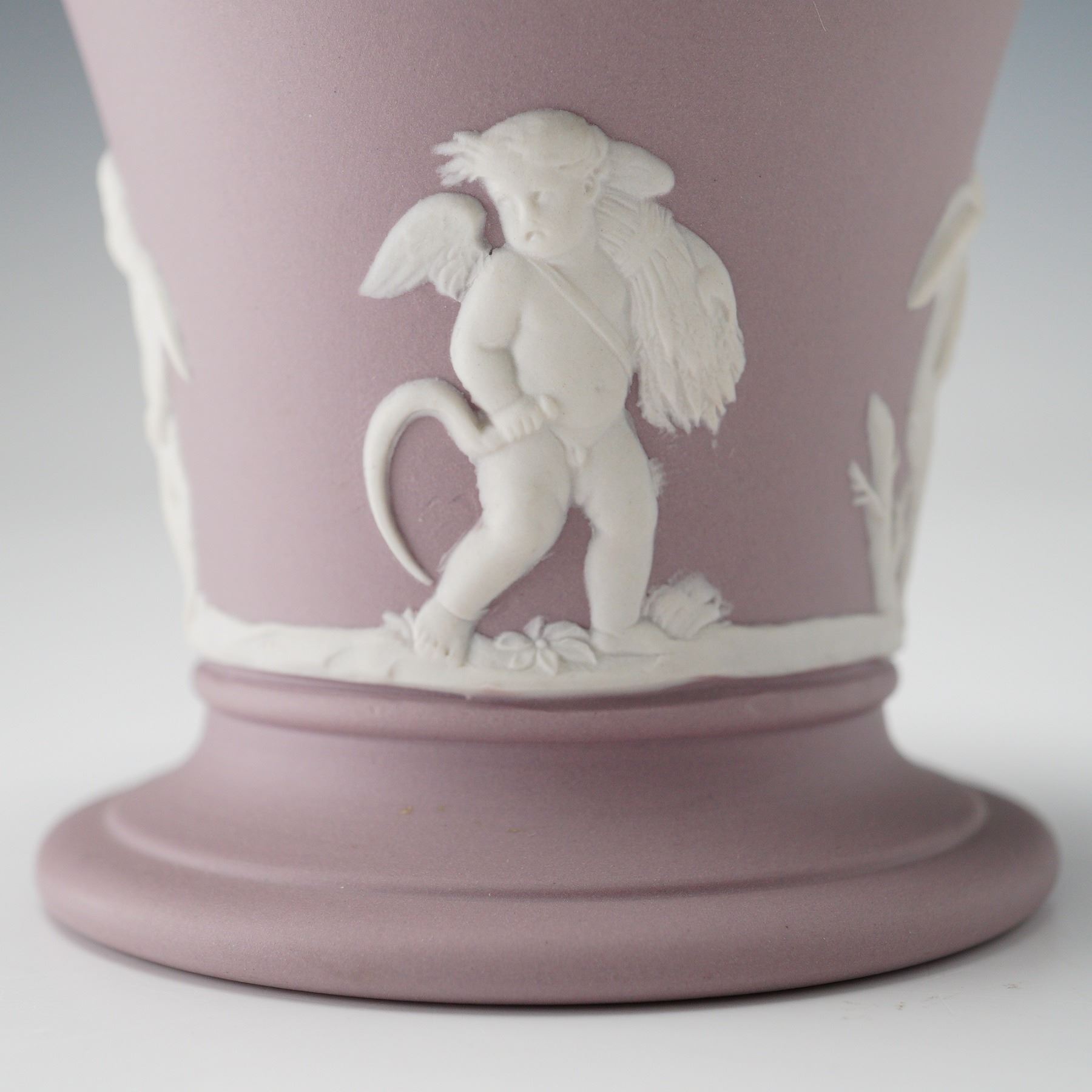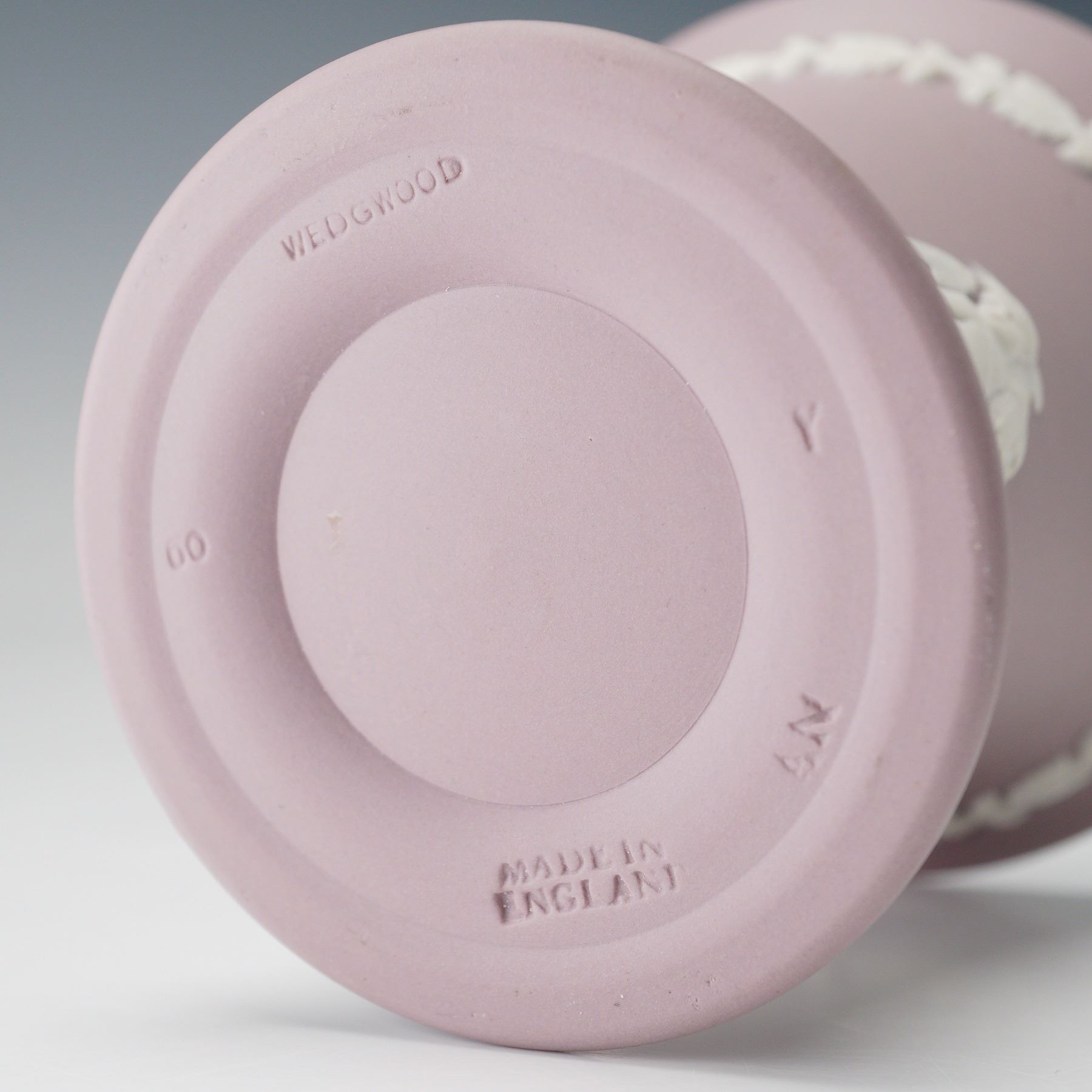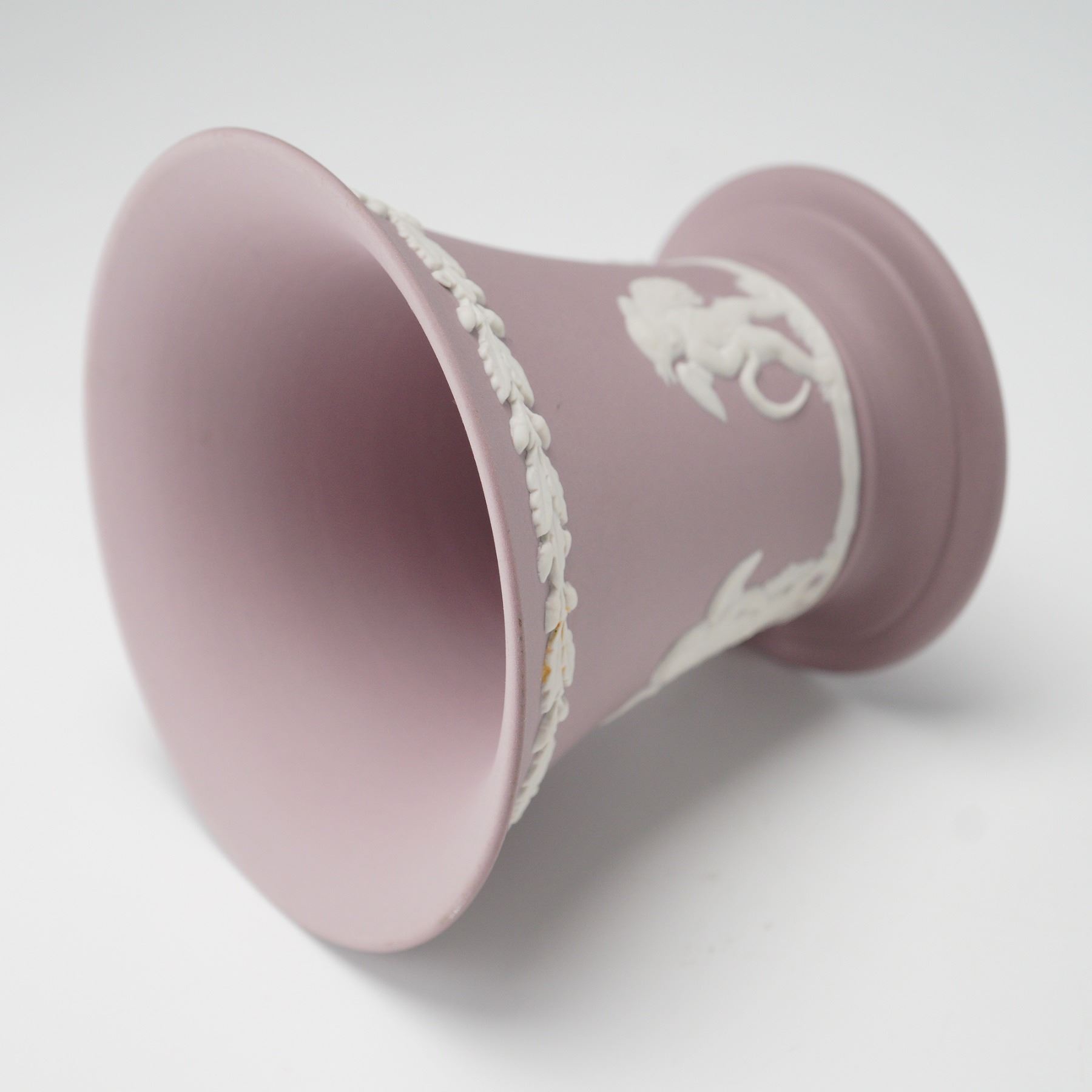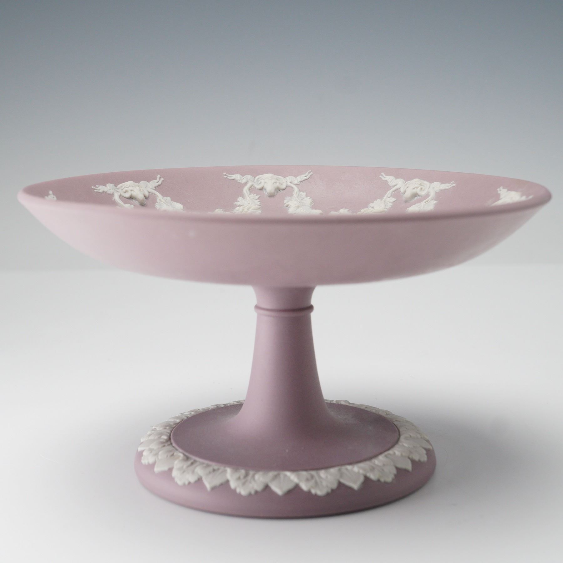 Pair of Wedgwood lilac jasperware pieces including a footed compote and a flared vase. Each features classic white relief decoration with neoclassical motifs and foliate borders. Marked Wedgwood on the base. Elegant matte finish in the desirable lilac color. Timeless decorative display pieces.