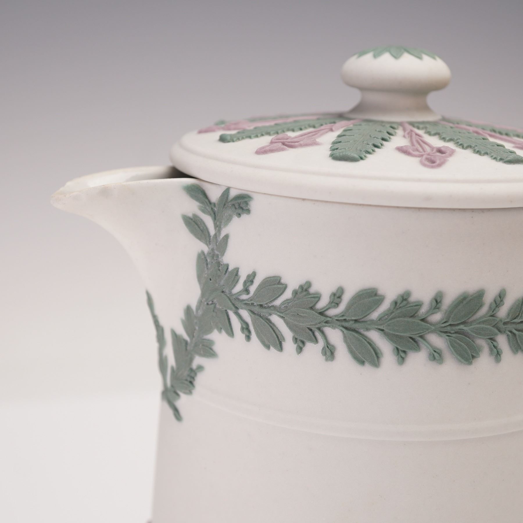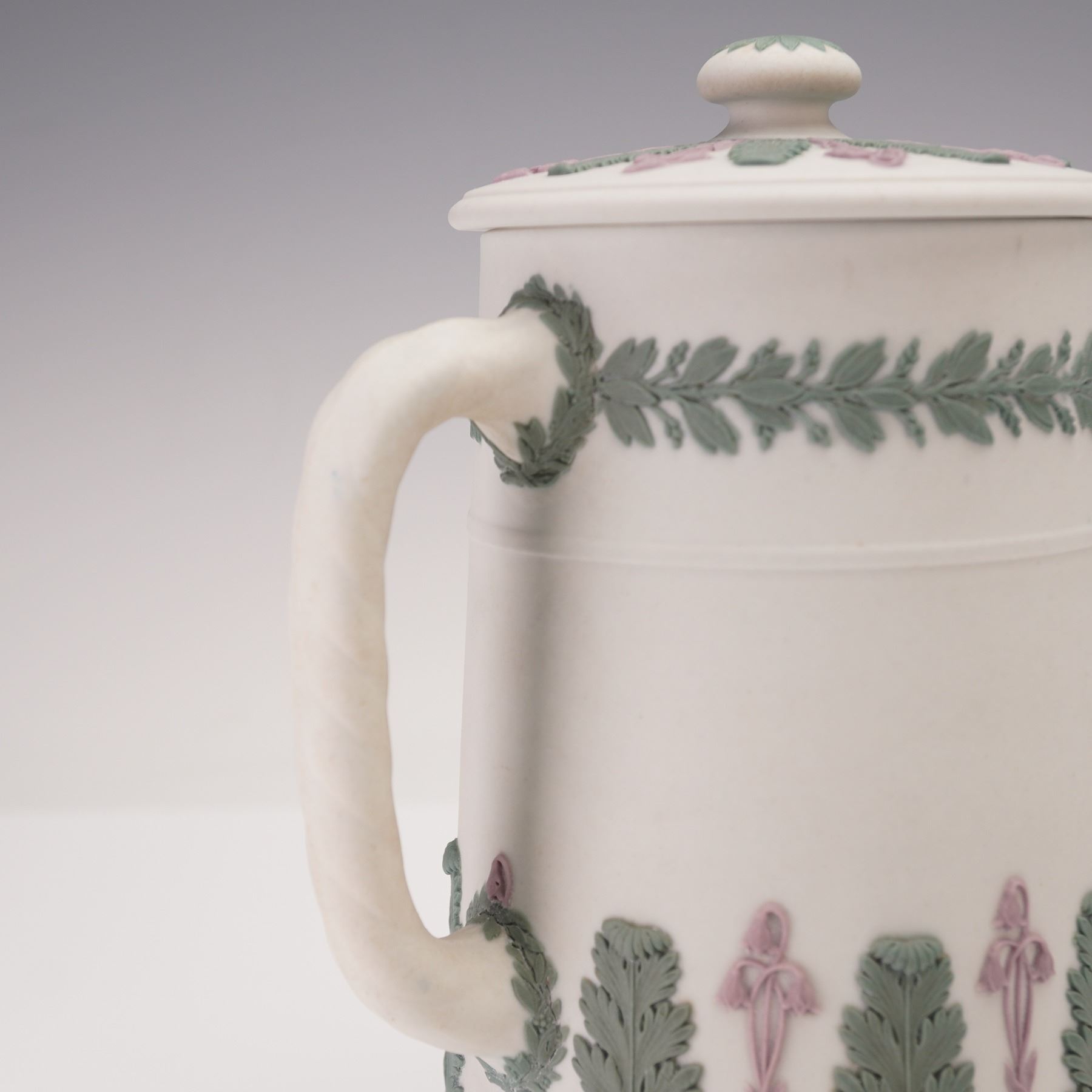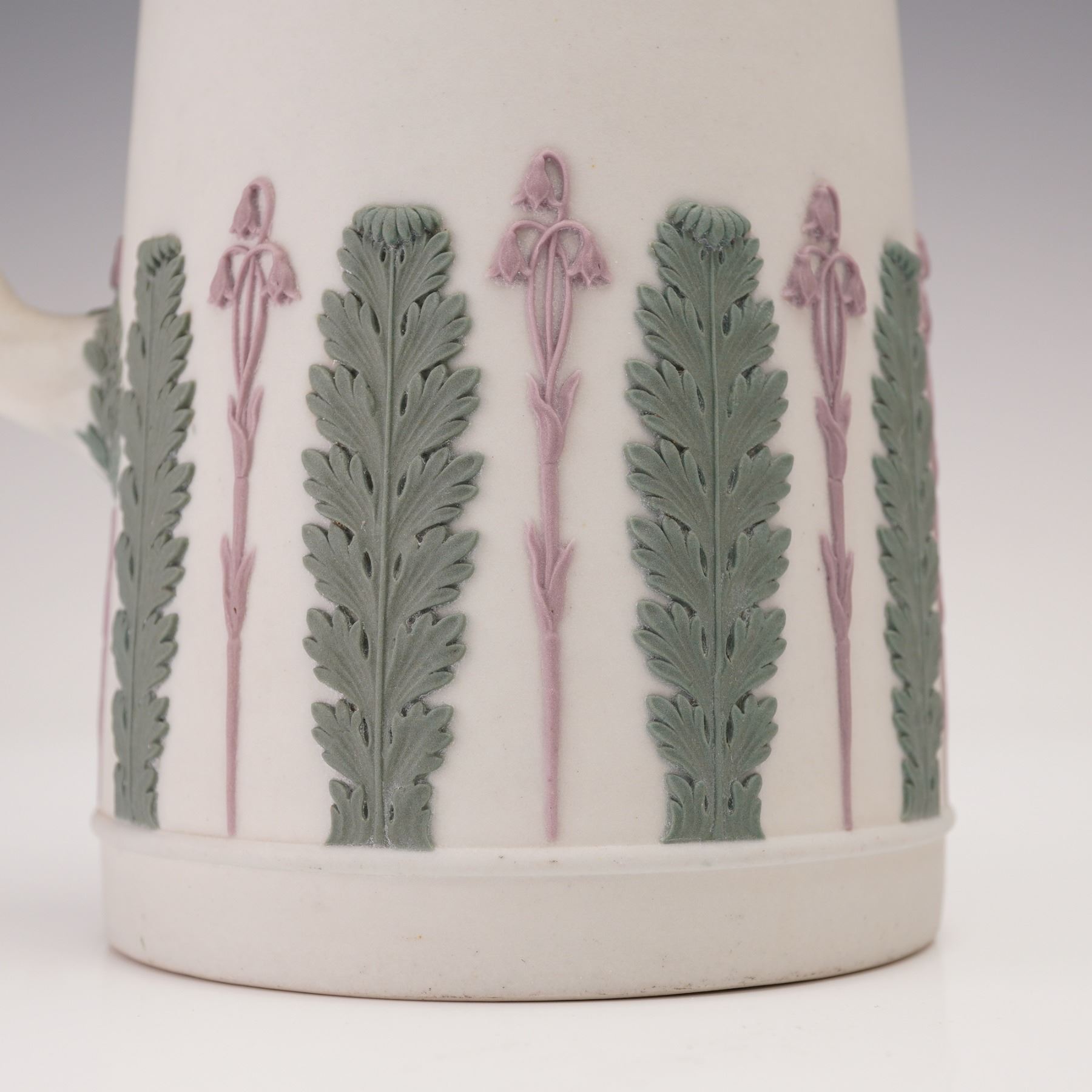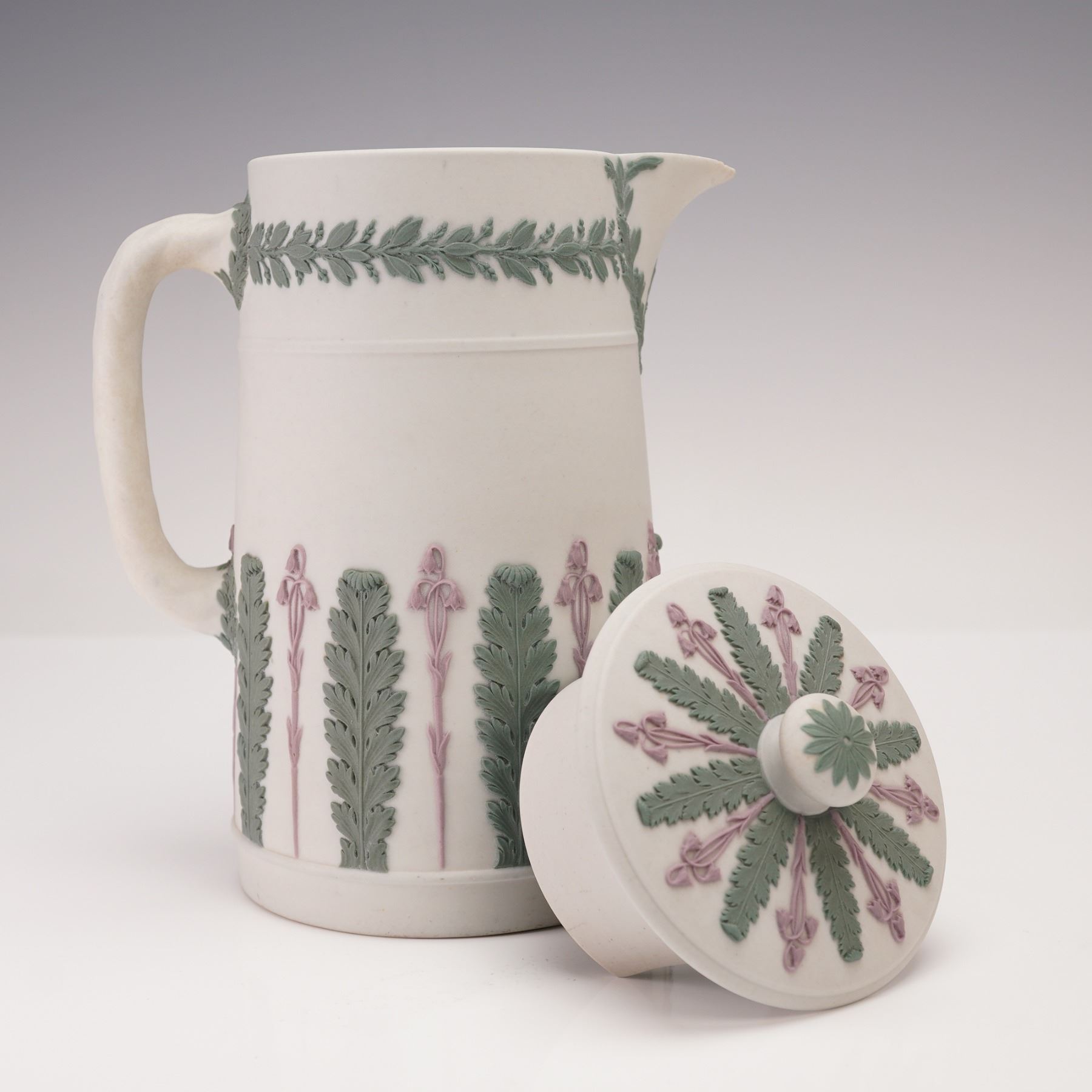 Classical Wedgwood jasperware pitcher with matching lid, featuring applied foliate and floral reliefs in green and lilac on a pale ground. The body is decorated with alternating vertical panels of fern and iris motifs, with a leafy garland encircling the shoulder and a twisted handle. The underside impressed Wedgwood.