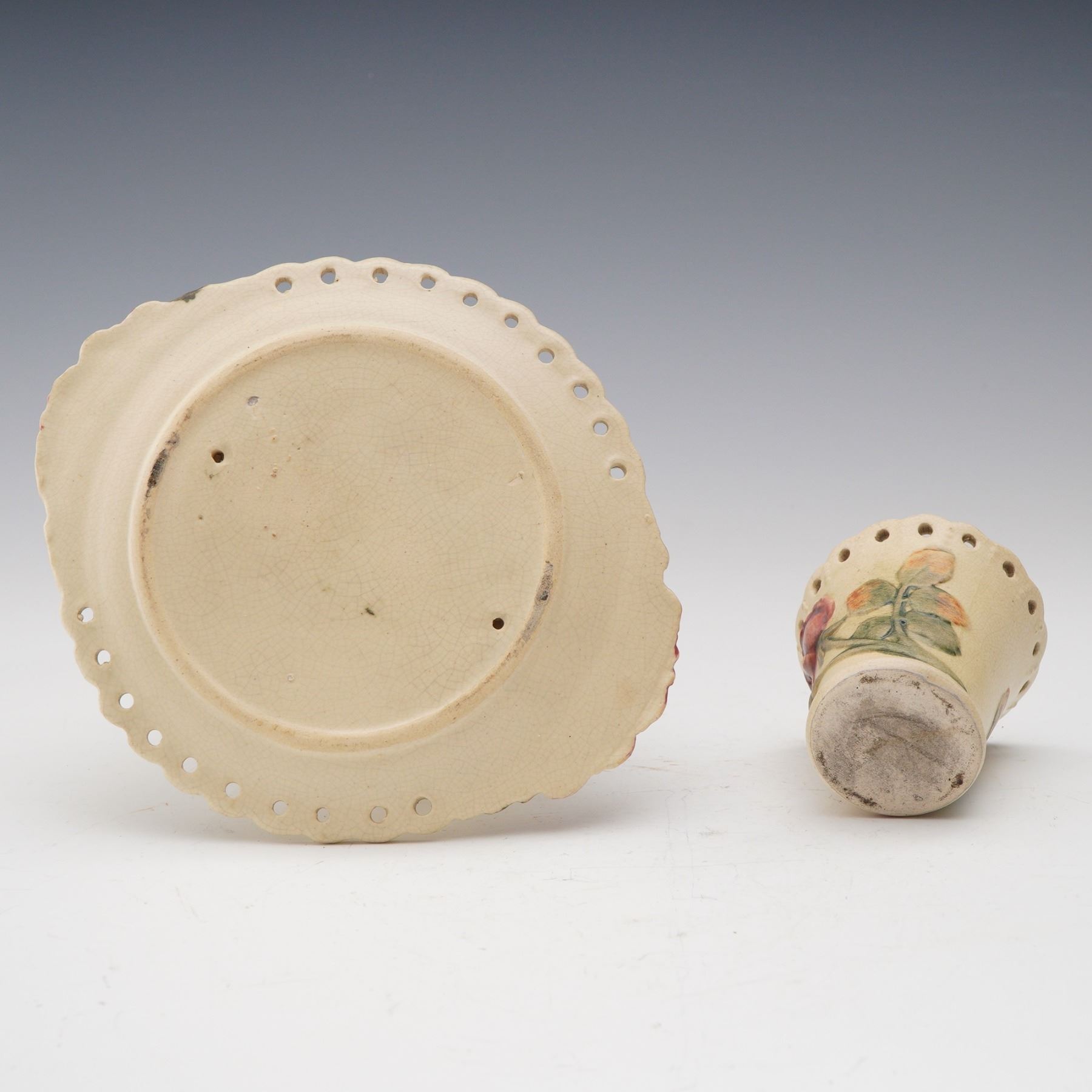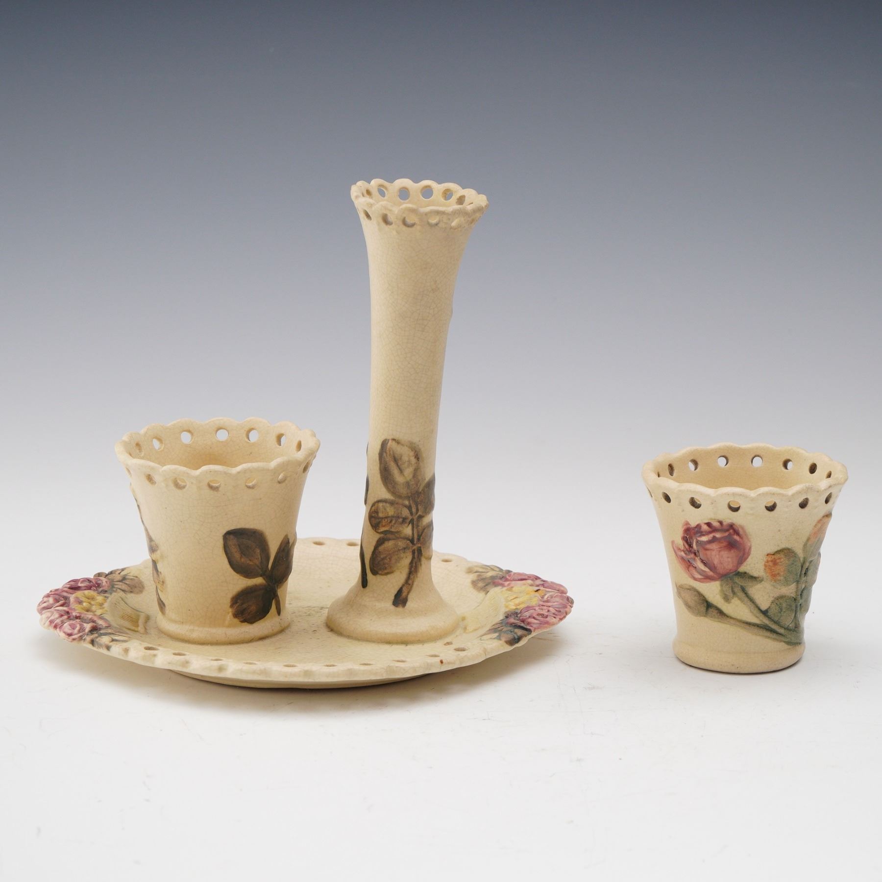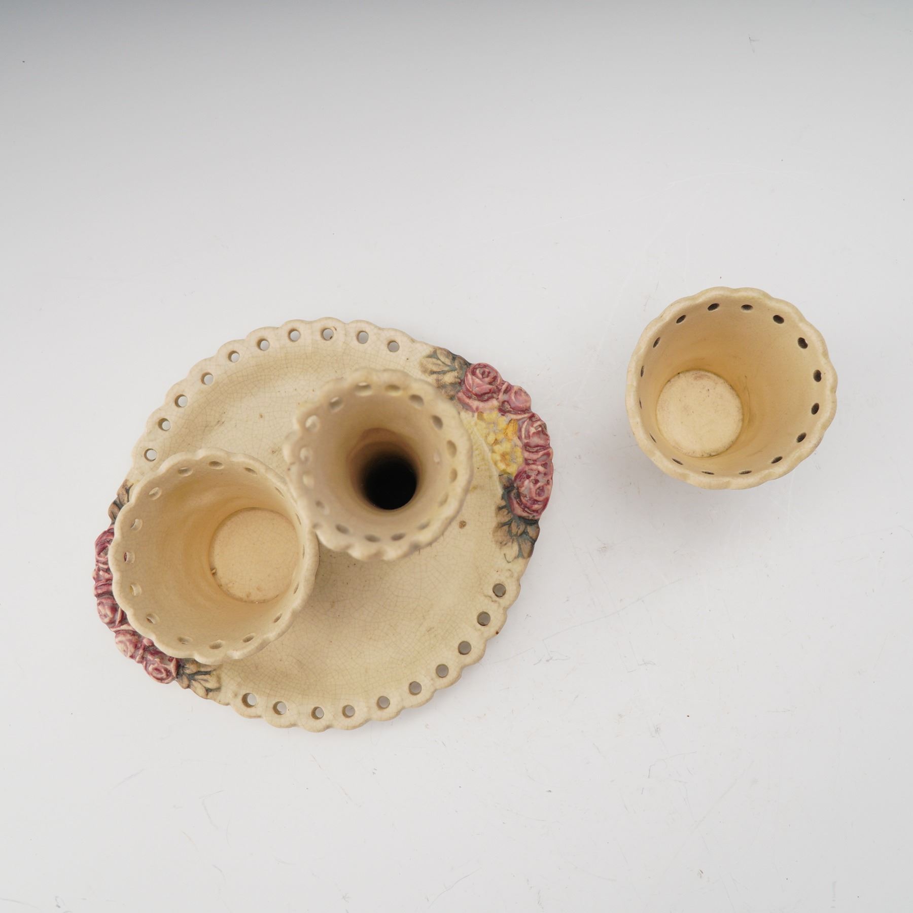 Charming Weller Pottery Florala vanity set featuring a pierced-edge plate with applied vase and matching loose cup. The ivory ground is decorated with decal-style roses in pink and green, accented by reticulated rims. One cup is permanently affixed to the tray alongside a slender vase, while the second cup is free-standing. A delicate and decorative example of early 20th century Weller design, perfect for dresser or display use.