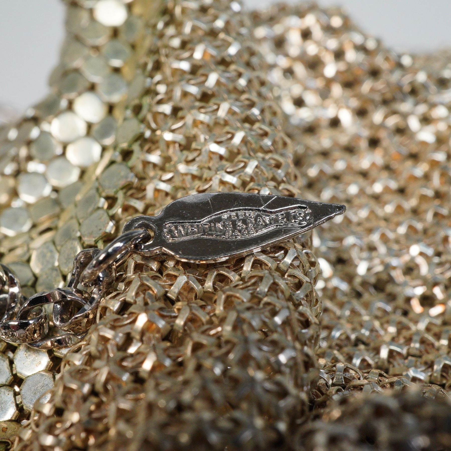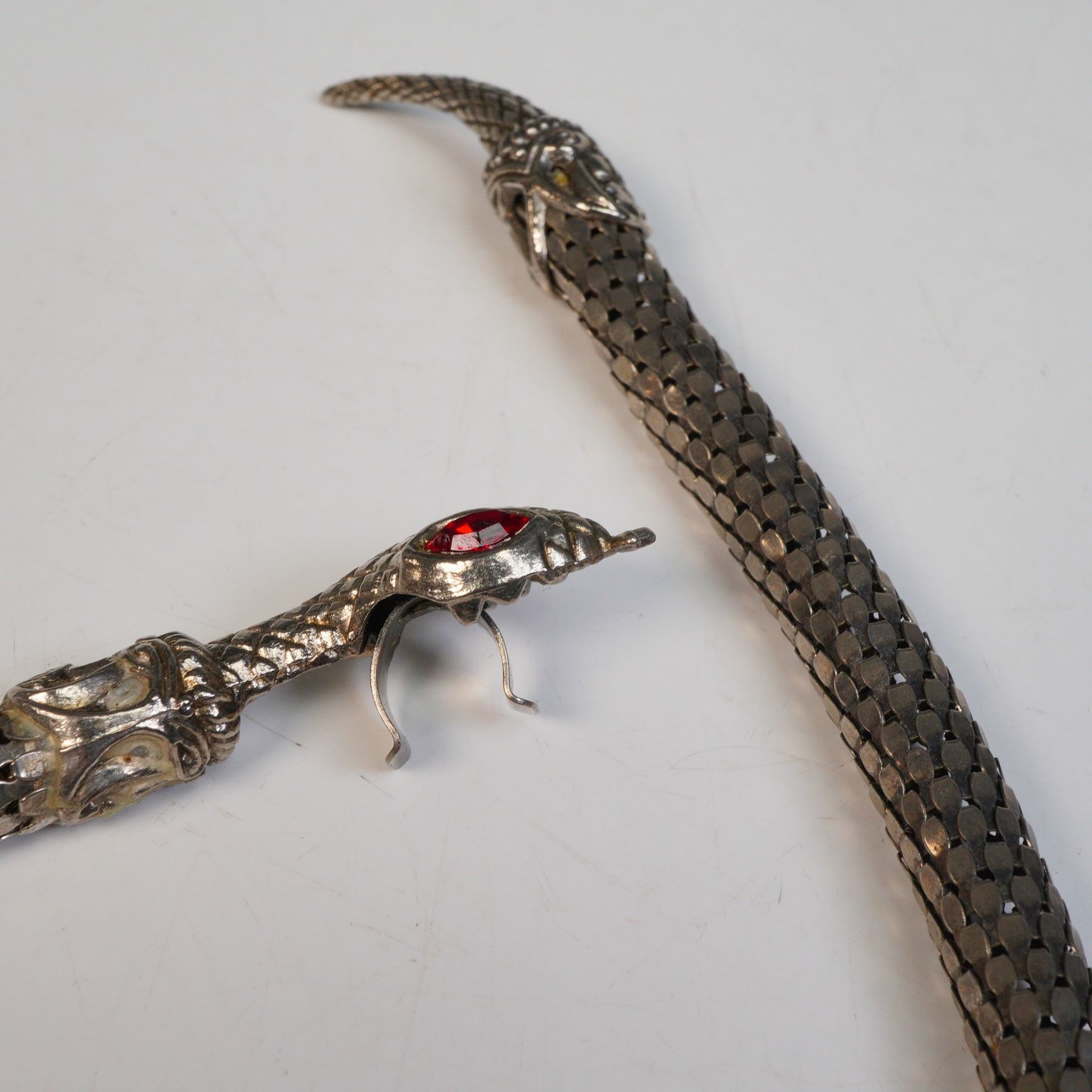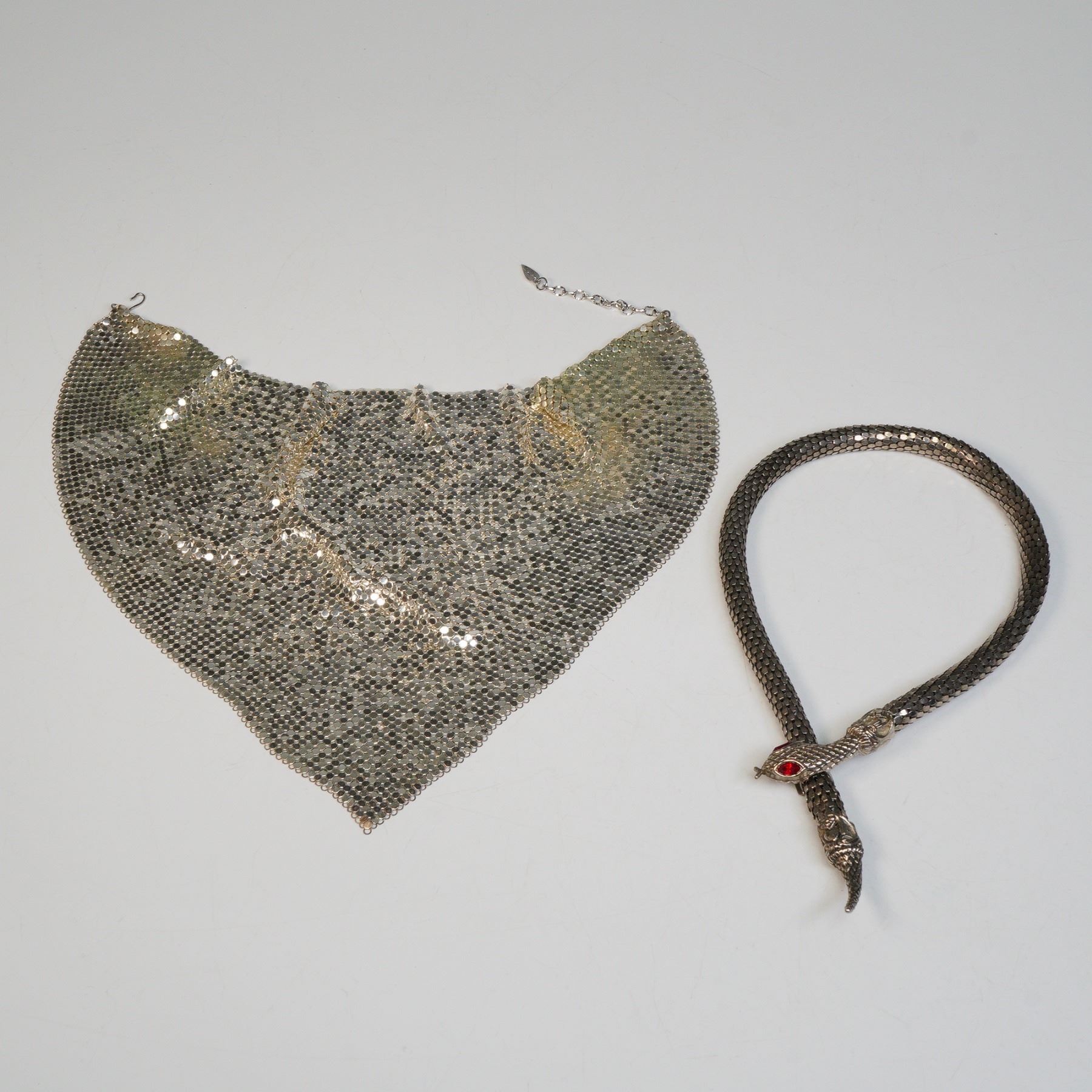 Glamorous Whiting & Davis metal mesh necklaces, showcasing the brand's signature craftsmanship and distinctive Art Deco-inspired allure. The first is a fluid, gold-tone mesh bib necklace with fine drape and brilliant reflective quality, marked with the Whiting & Davis tag and fitted with an adjustable chain and clasp. The second piece is a striking silver-tone serpent necklace, its sinuous mesh body terminating in a sculptural snake head and tail. The head is detailed with two vivid red glass eyes, adding a dramatic focal point. Both necklaces exhibit Whiting & Davis's hallmark flexible mesh construction, blending movement and shine in timeless fashion.
