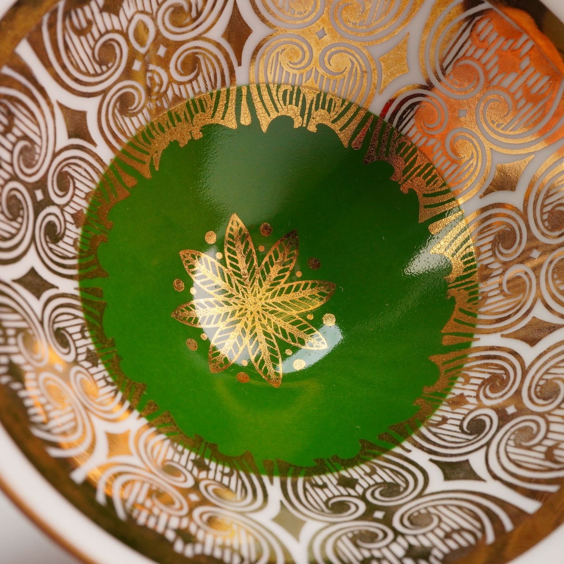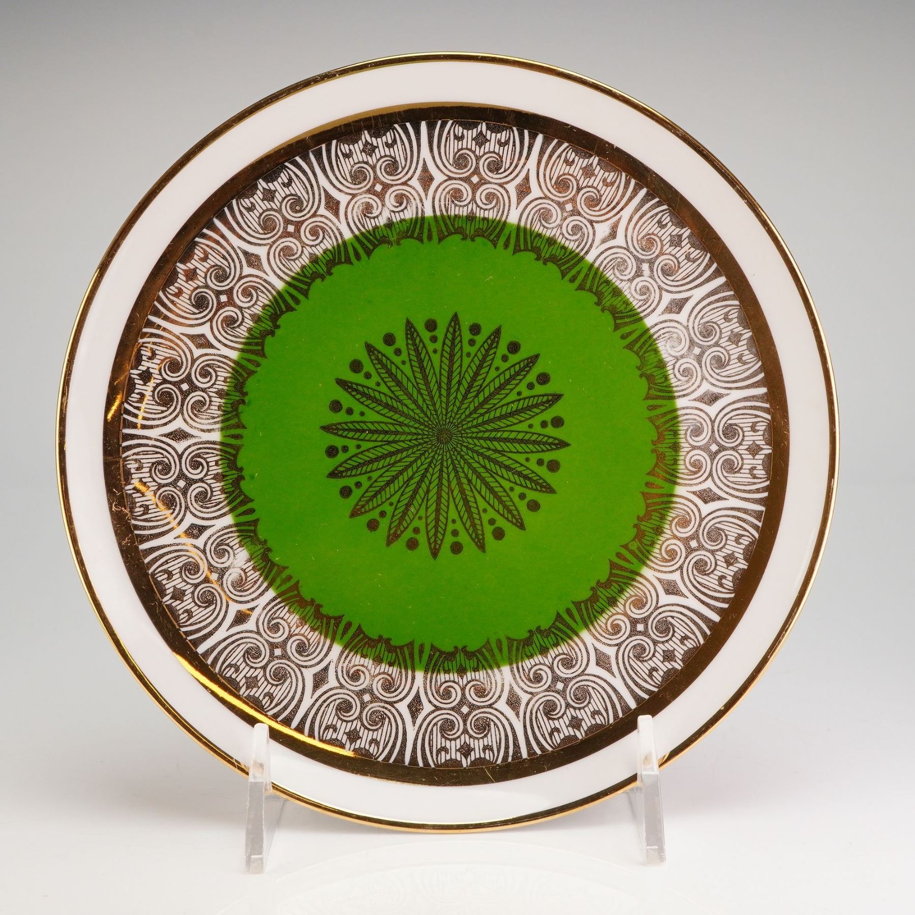 The cup and saucer set is executed in white porcelain with a mid-century modern aesthetic, featuring a vibrant, glossy green glaze applied to the central well of both pieces. The decoration utilizes extensive gold overlay, forming highly stylized scrollwork and geometric floral motifs. The cup features a pronounced gilded handle and a gilded footed base. The interior of the cup and the central zone of the saucer/plate are covered in the green glaze and gold filigree decoration. The saucer/plate features a central green field overlaid with a dark geometric starburst pattern, surrounded by heavy gold scrollwork. The underside of the saucer bears the visible green backstamp reading WINTERLING MARKLEUTHEN BAVARIA beneath a crown motif.