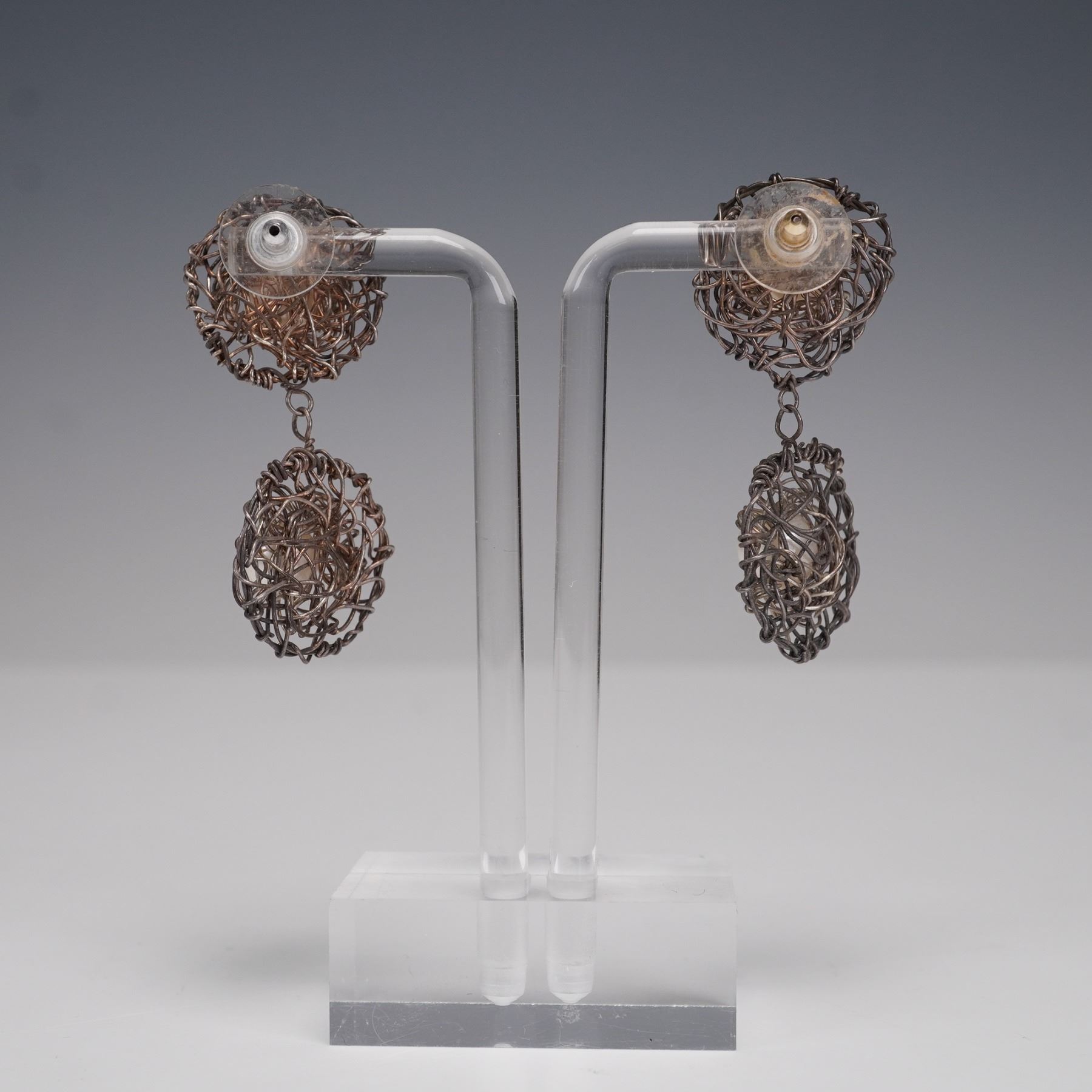 Pair of striking drop earrings featuring sculptural wirework orbs in dark metal tones, each encasing a large simulated pearl at center. Double-orb design with articulated drops, giving them dramatic movement and dimensional flair.