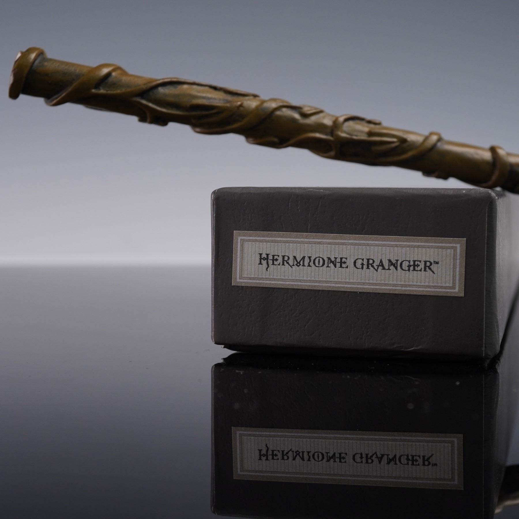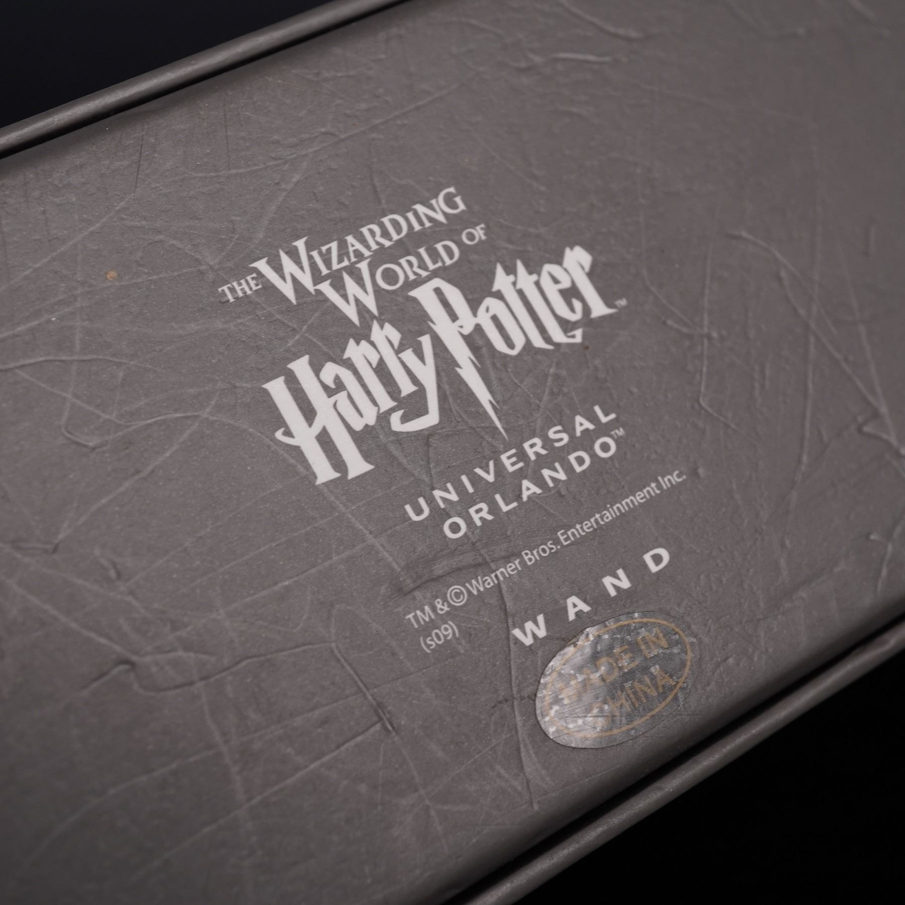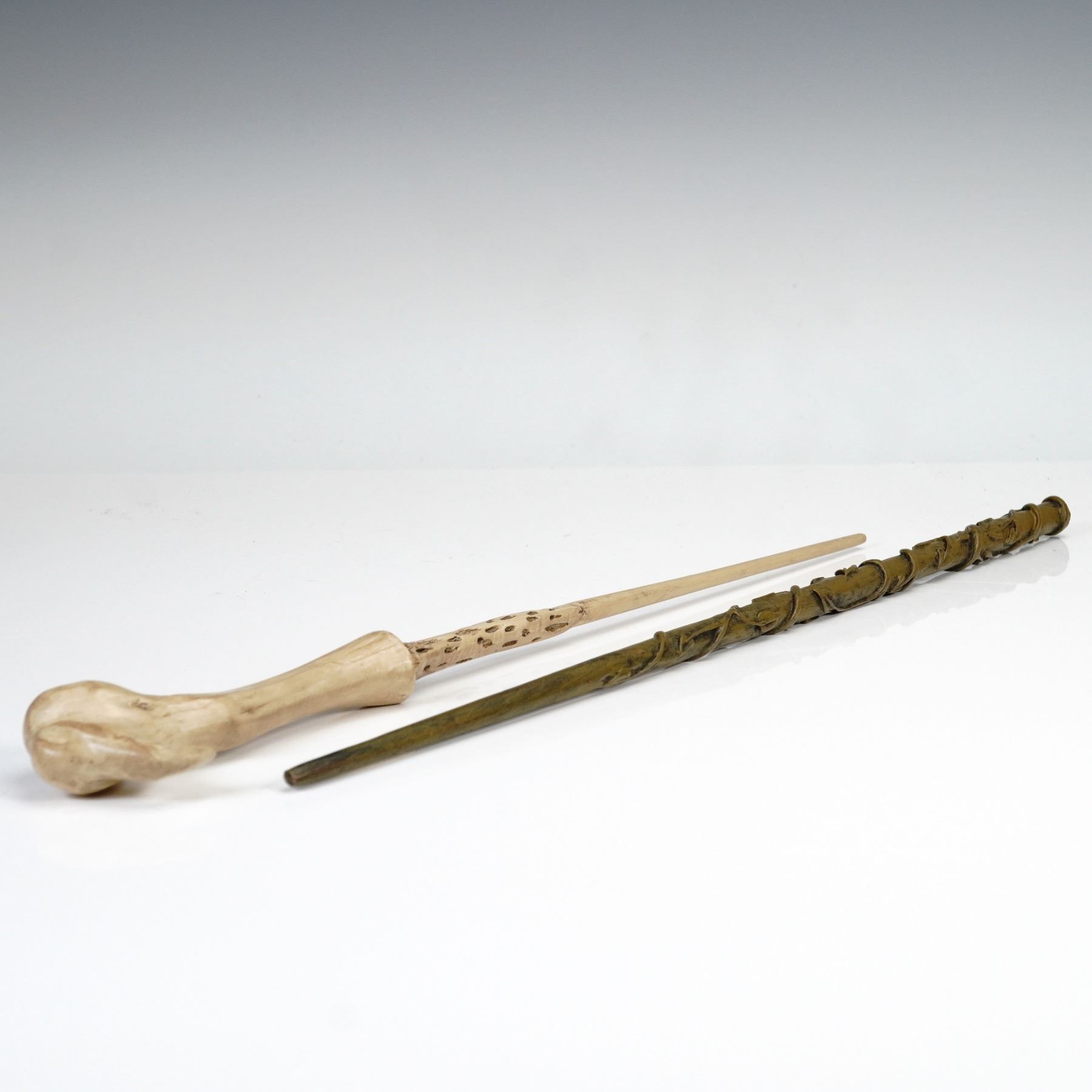 A pair of officially licensed replica wands from The Wizarding World of Harry Potter at Universal Orlando, each housed in its original Ollivanders-style presentation box. This set includes the distinctively curved wand of Voldemort with its bone-like finish and the intricately detailed wand of Hermione Granger with vine patterning. Designed for display or light cosplay use, these collectible pieces offer fans a tangible link to the beloved characters and film series. This item has its original box.