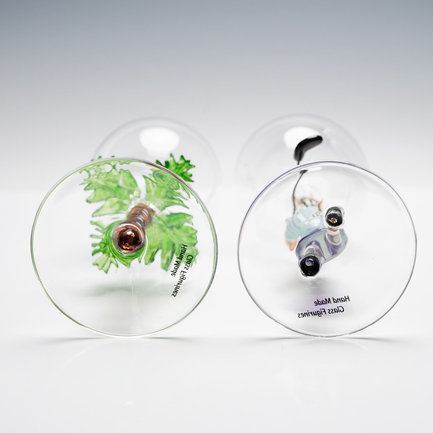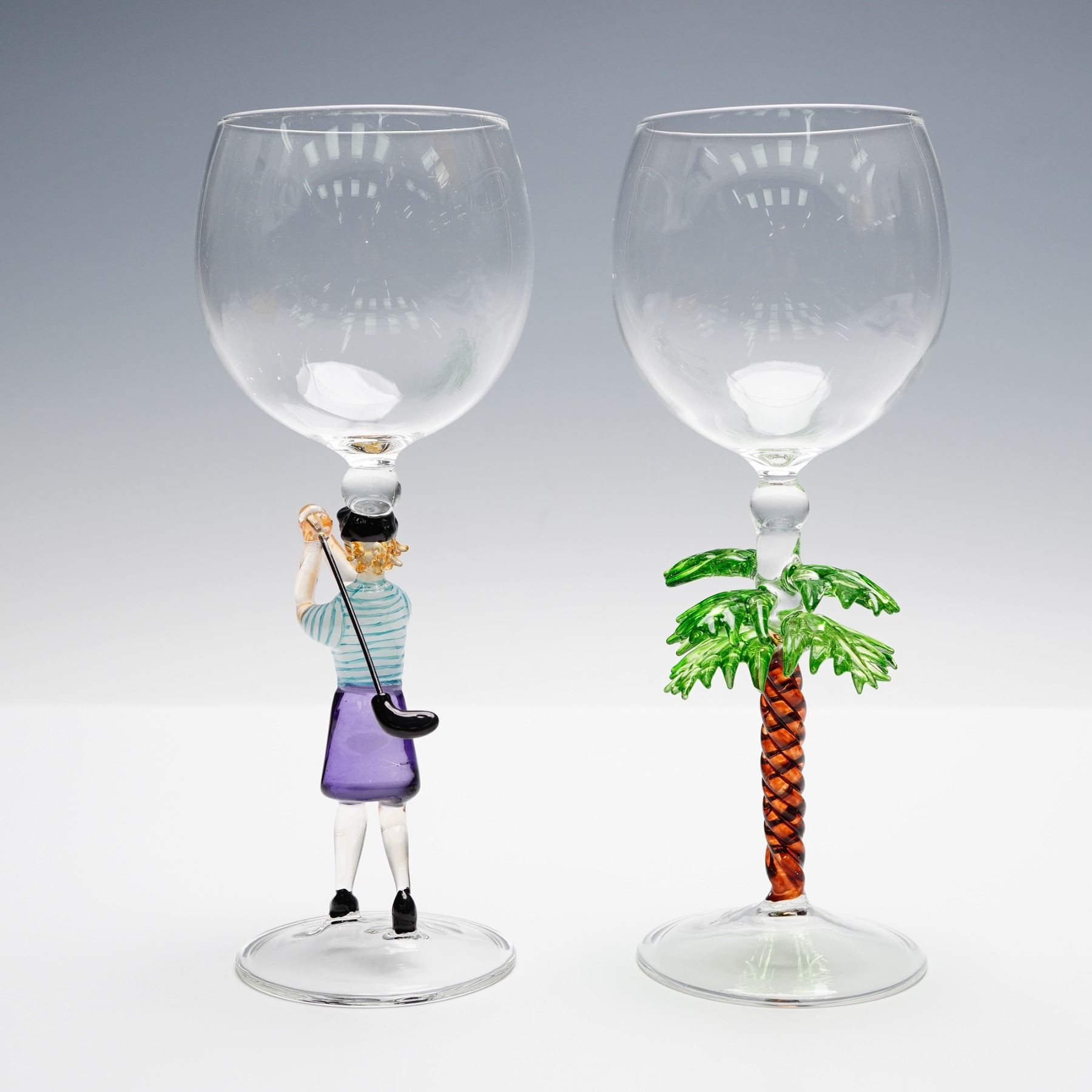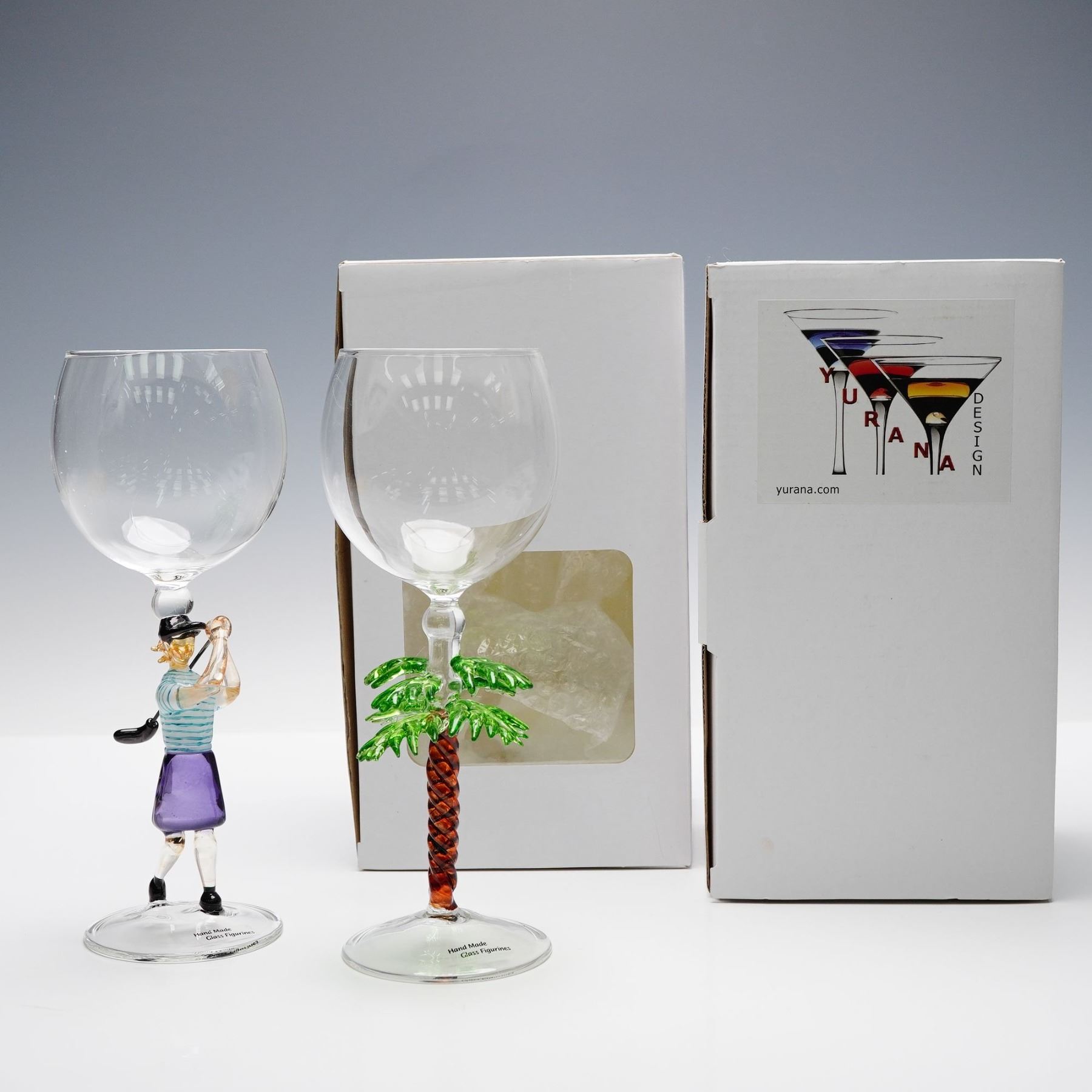2pc Yurana Design Figural Art Glass Wine Glasses, Golfer and Palm Tree