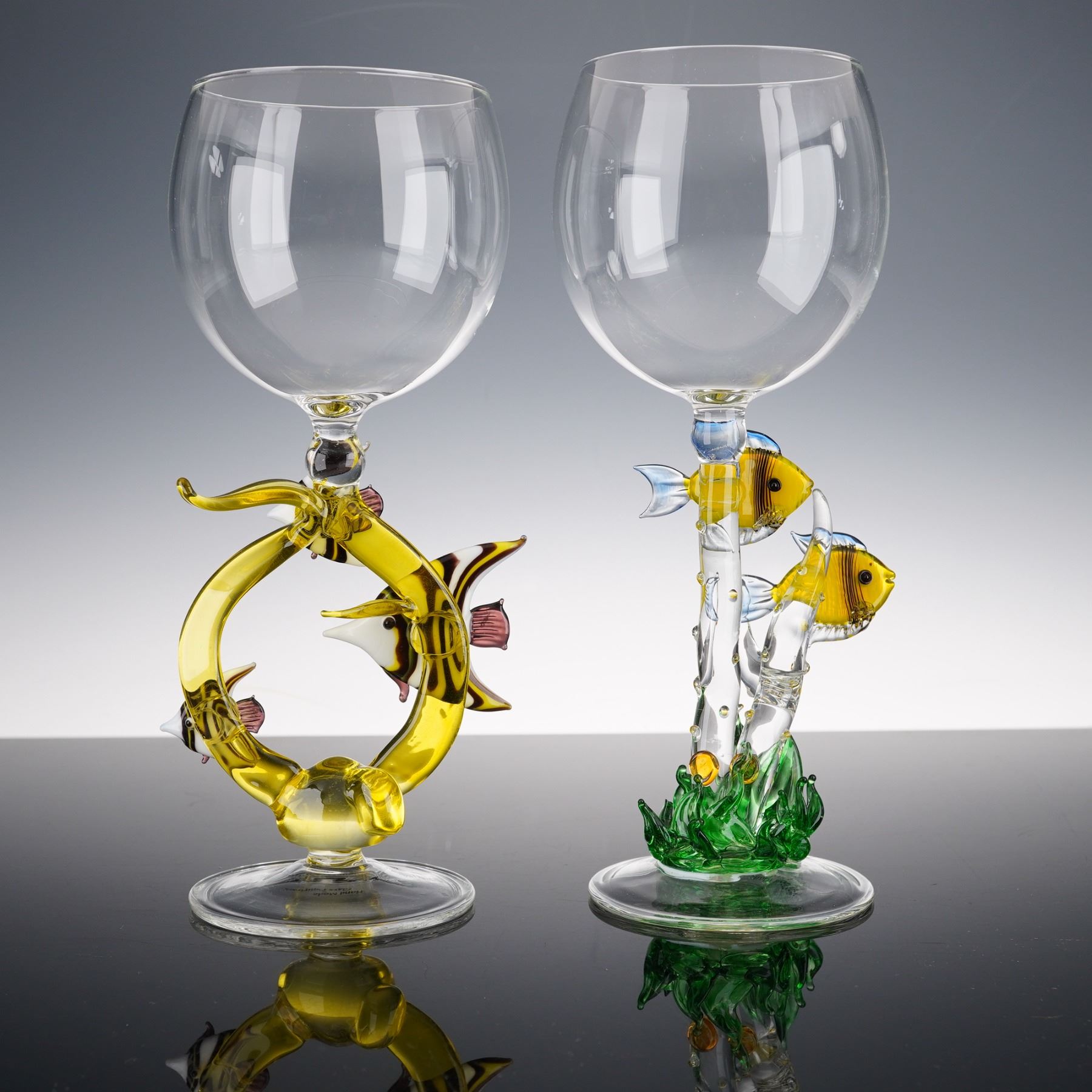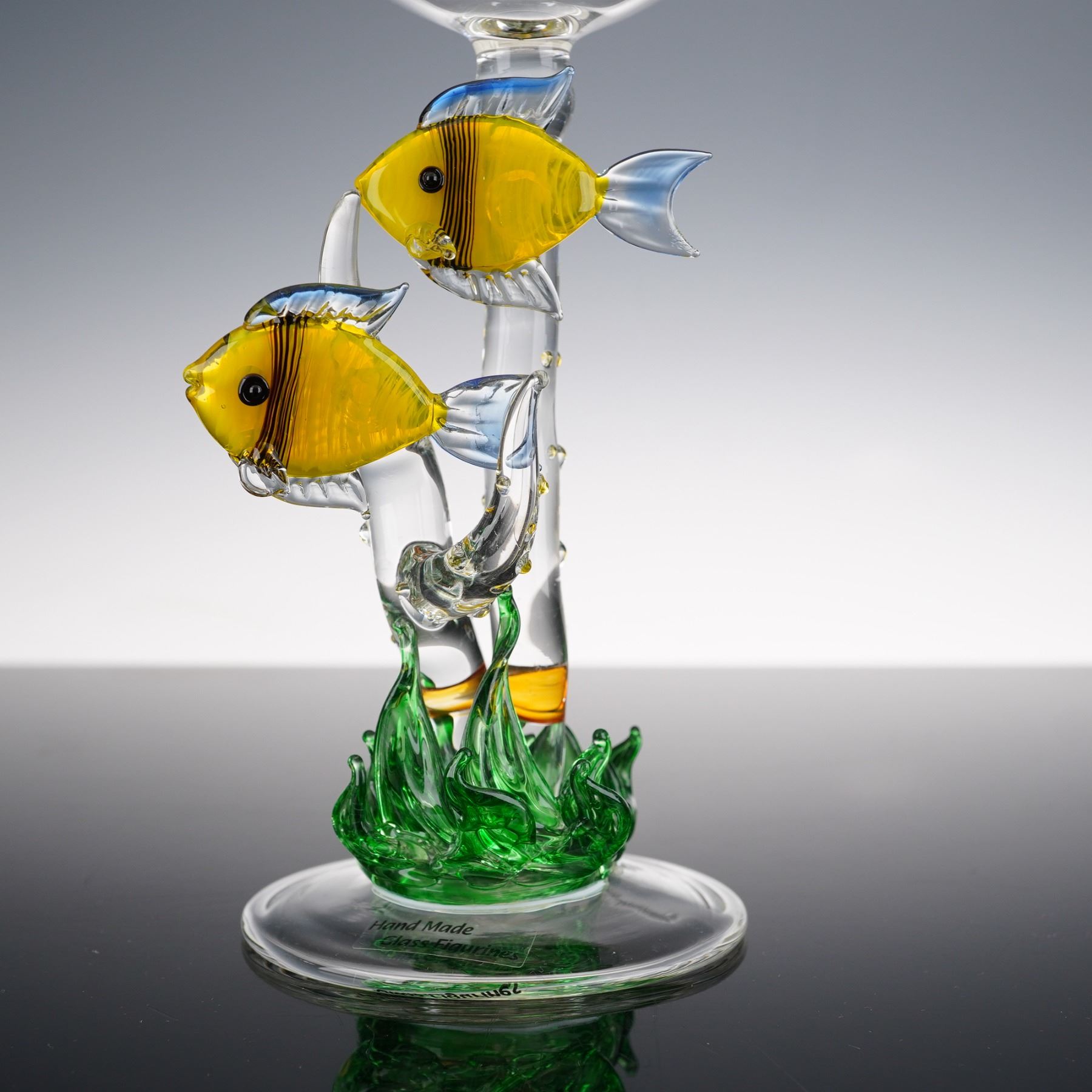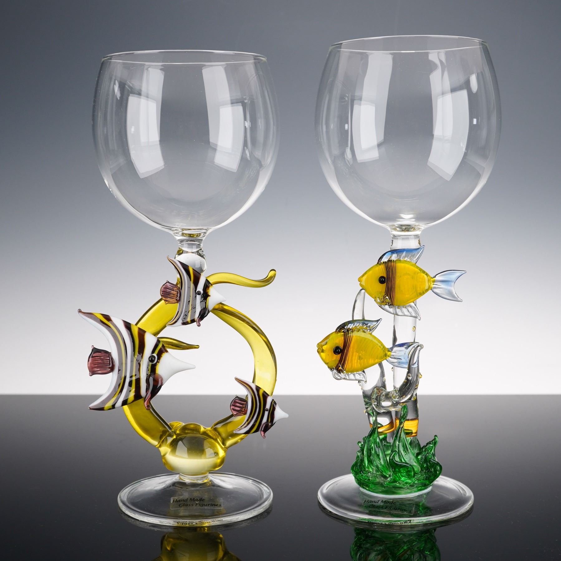 Handmade art glass goblets each featuring a detailed aquatic theme in the sculptural stem. One goblet displays three striped angelfish swimming in a looping yellow glass form, while the other depicts two yellow fish among green sea grass. Both are meticulously hand-blown and fused with vibrant color accents, exemplifying the brand's signature figural artistry. Each bears the Hand Made Glass Figurines label to the base, combining utility with sculptural charm, ideal for collectors or coastal-themed decor.