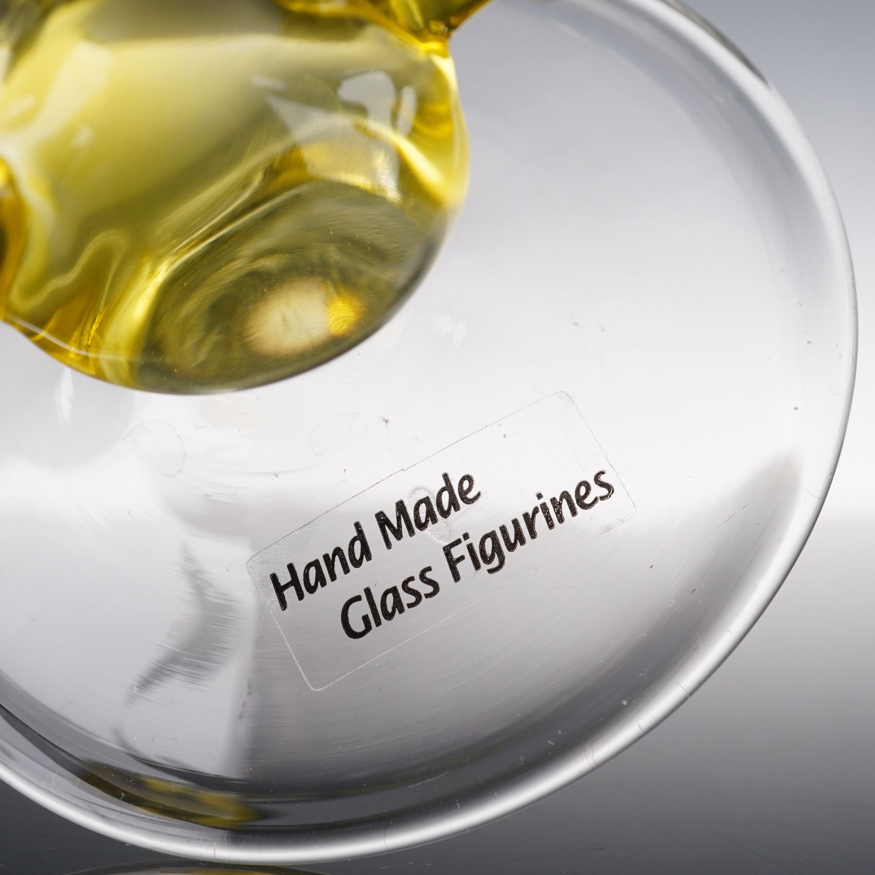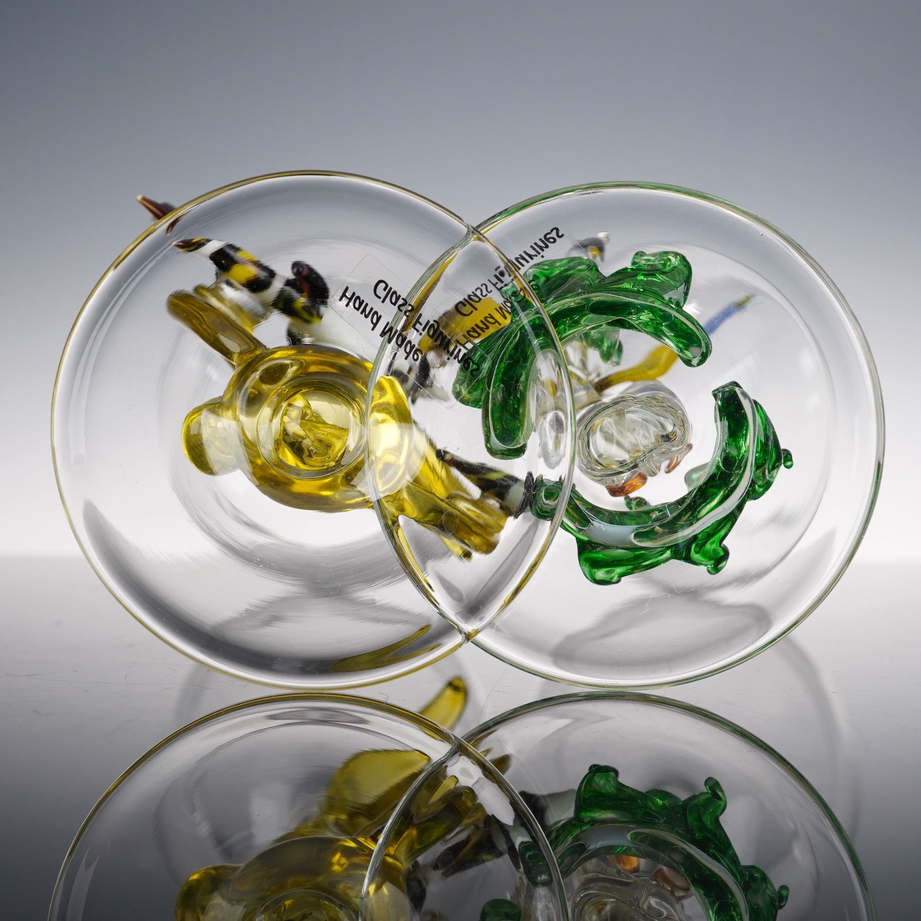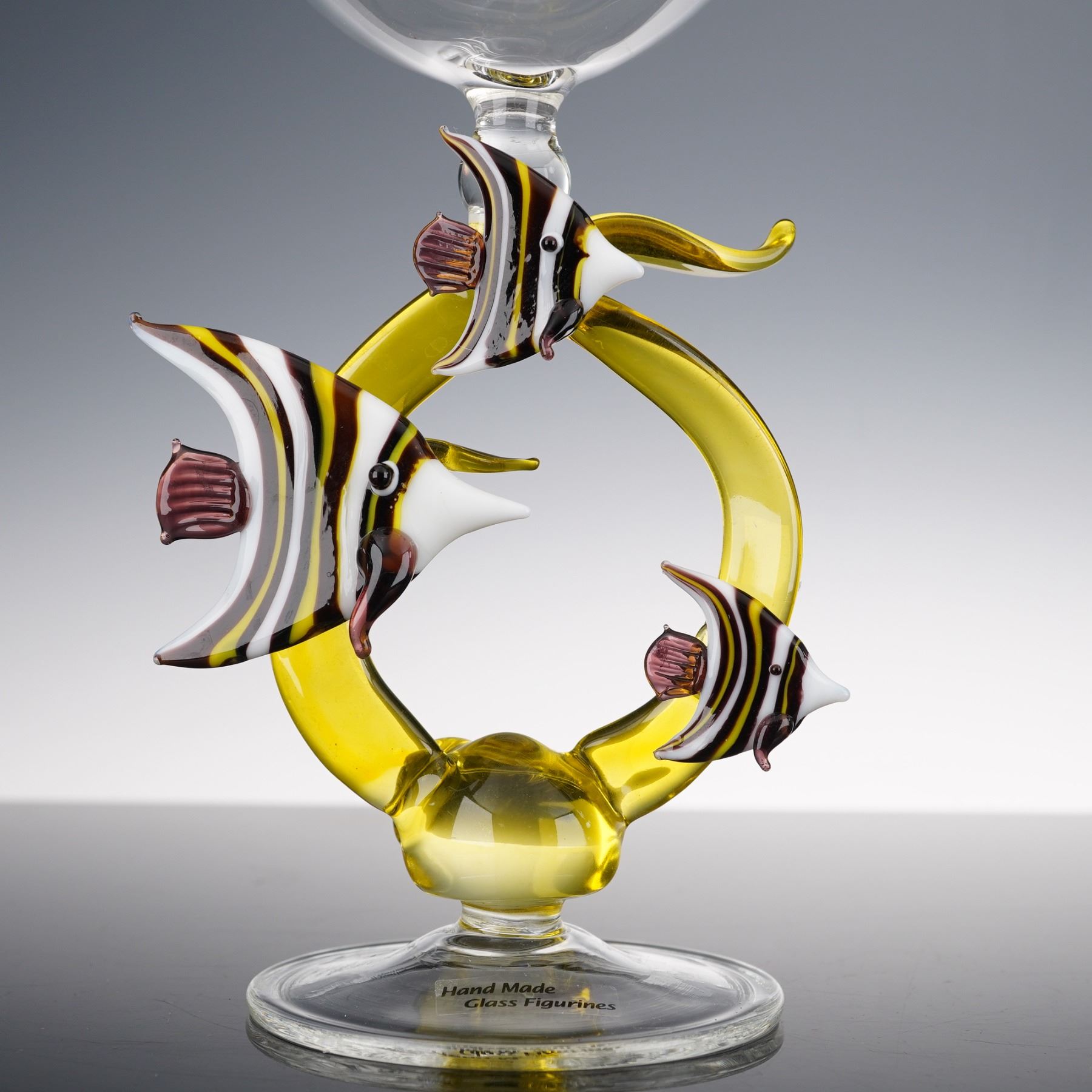 Handmade art glass goblets each featuring a detailed aquatic theme in the sculptural stem. One goblet displays three striped angelfish swimming in a looping yellow glass form, while the other depicts two yellow fish among green sea grass. Both are meticulously hand-blown and fused with vibrant color accents, exemplifying the brand's signature figural artistry. Each bears the Hand Made Glass Figurines label to the base, combining utility with sculptural charm, ideal for collectors or coastal-themed decor.