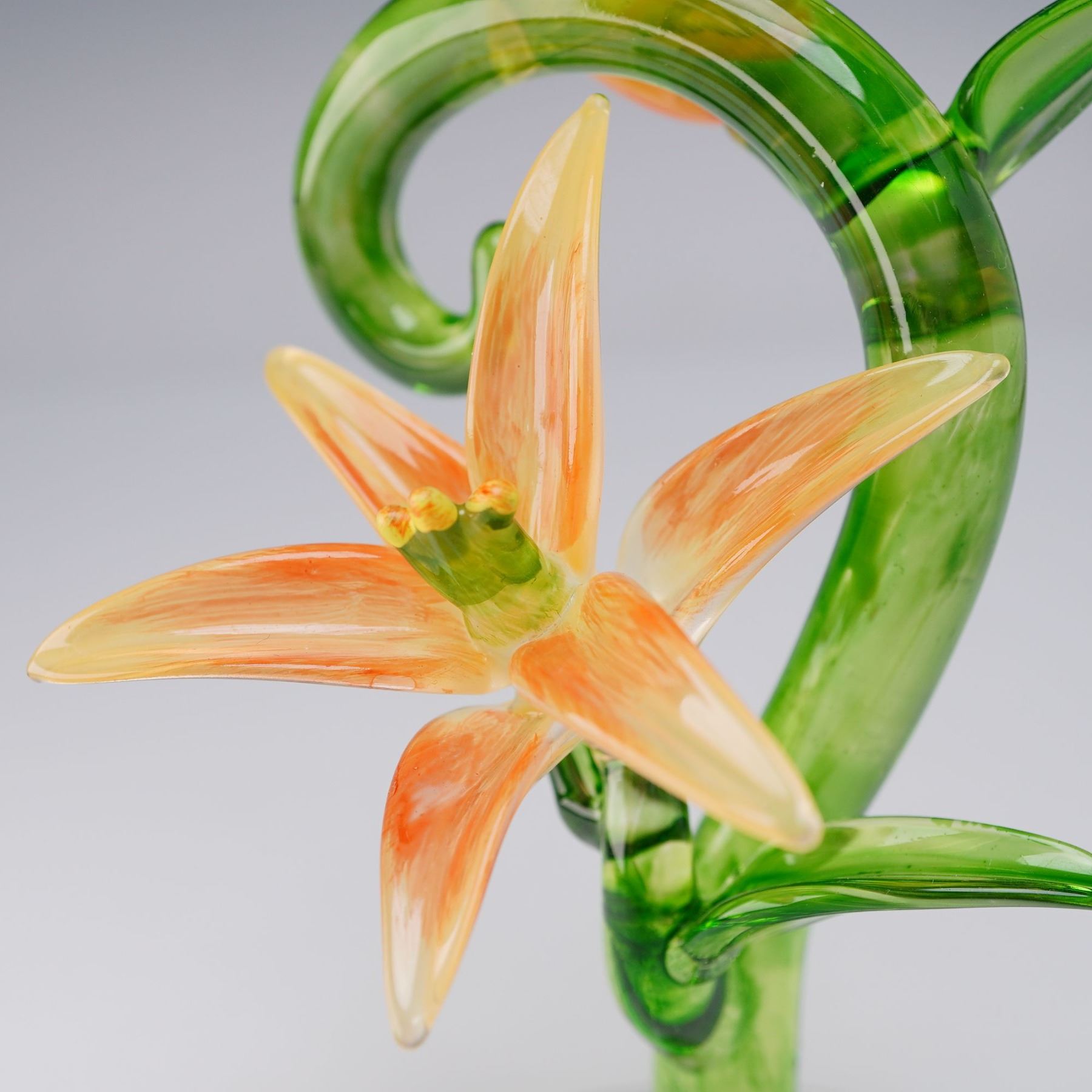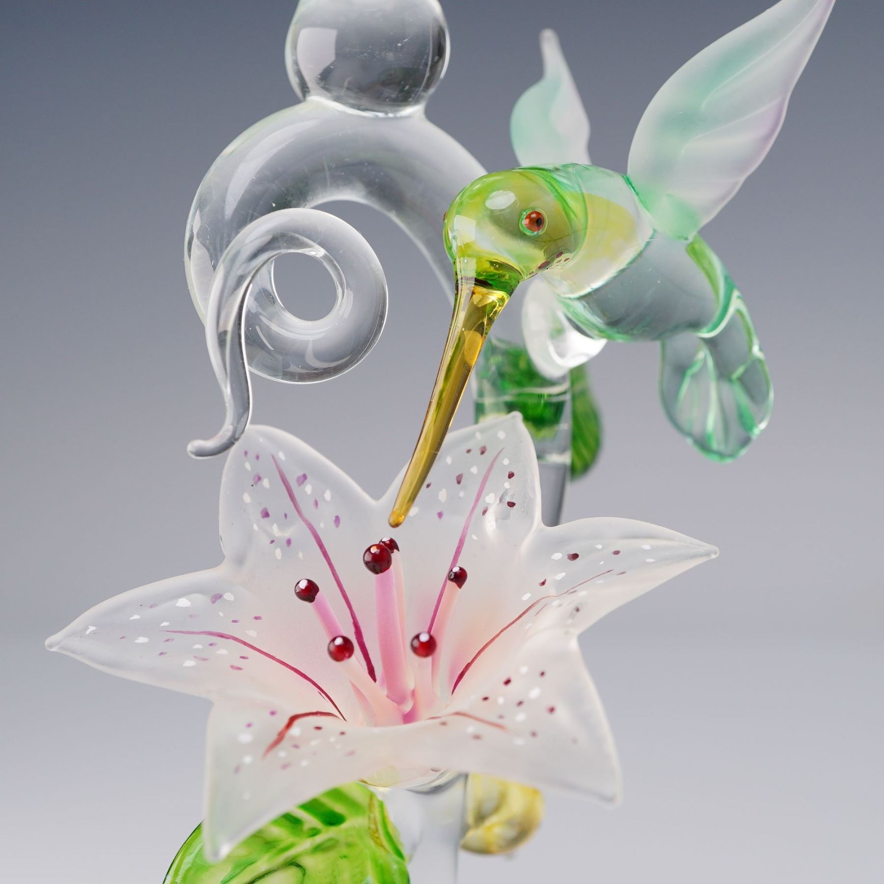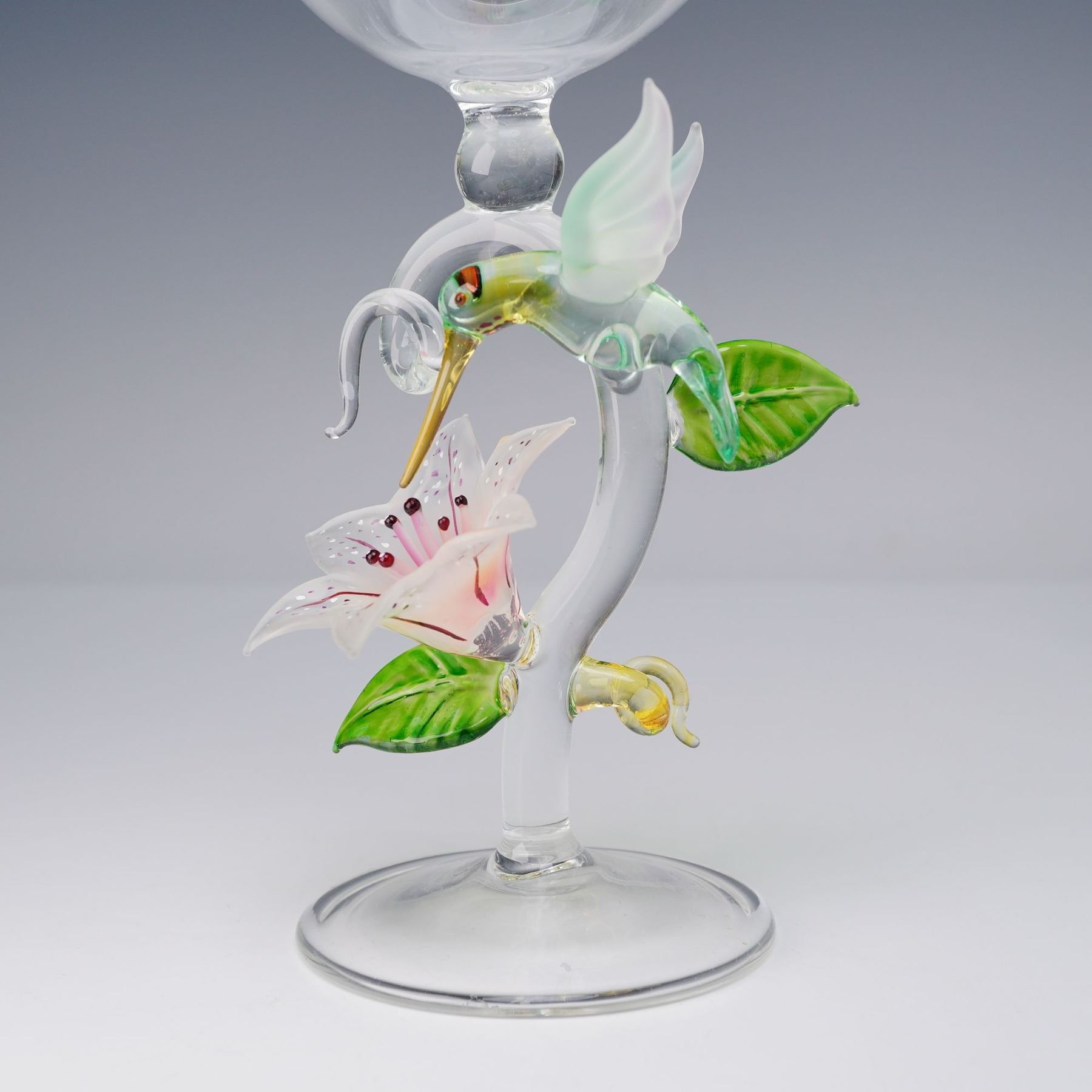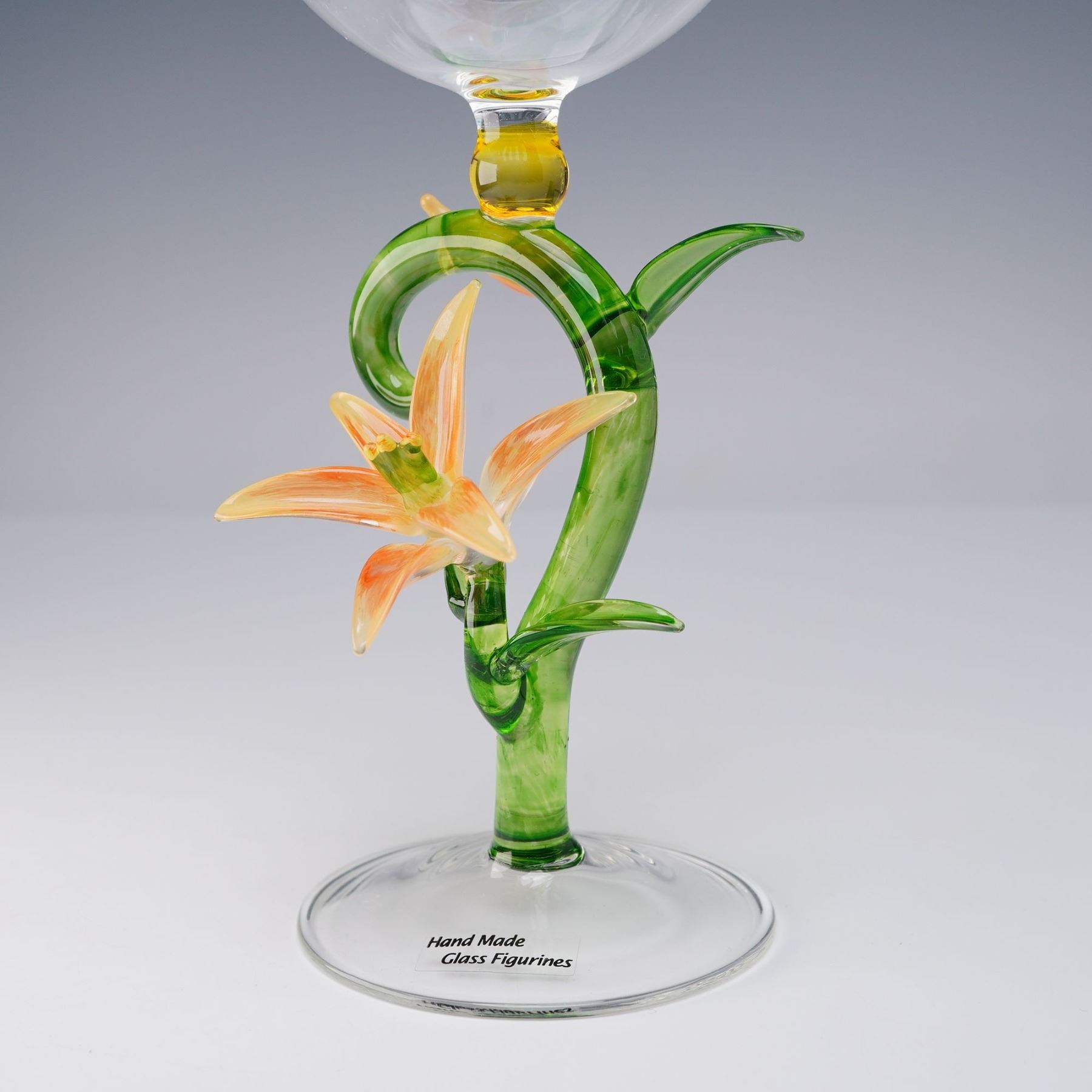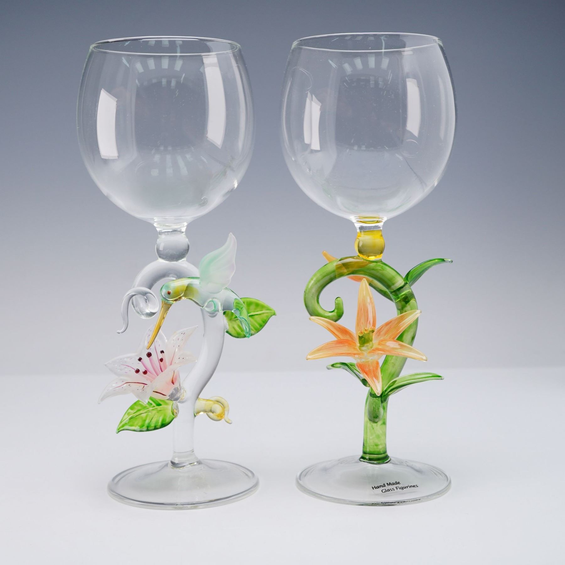 Pair of Yurana Design hand-blown wine glasses, each featuring intricate sculpted stems with applied glass floral and nature details. One glass showcases a delicate orange lily and green vine stem, while the other is adorned with a pink lily and a hovering green hummingbird. Both pieces are handcrafted with vibrant color accents and retain their original boxes.