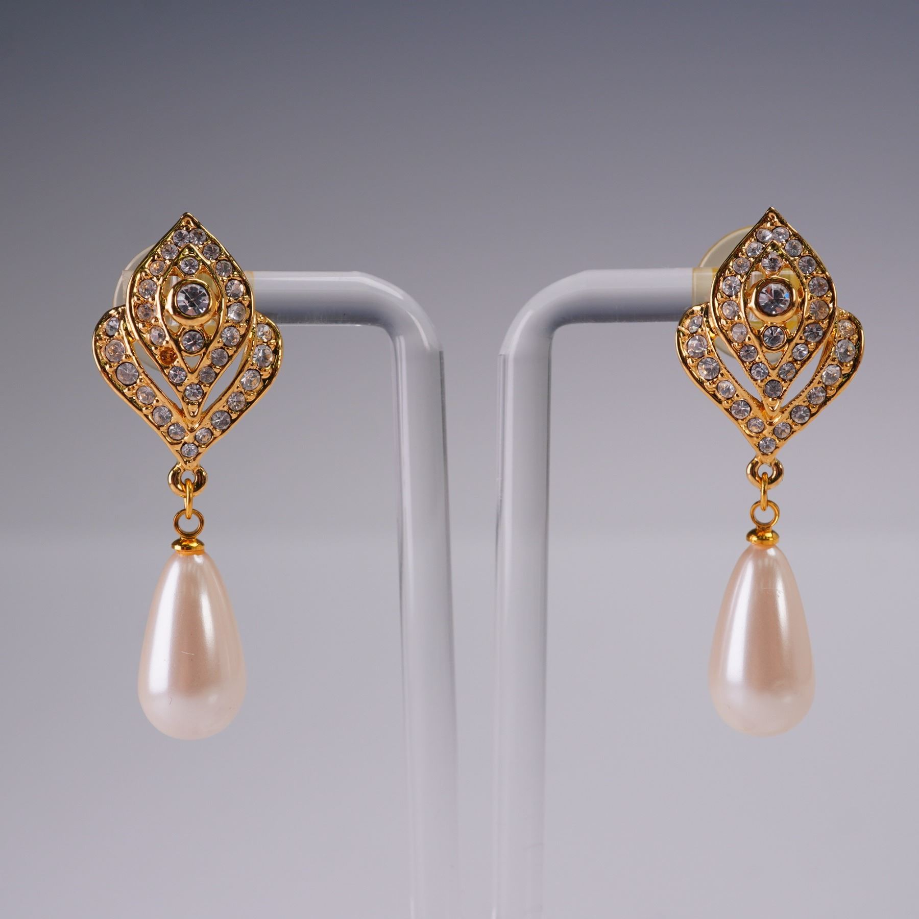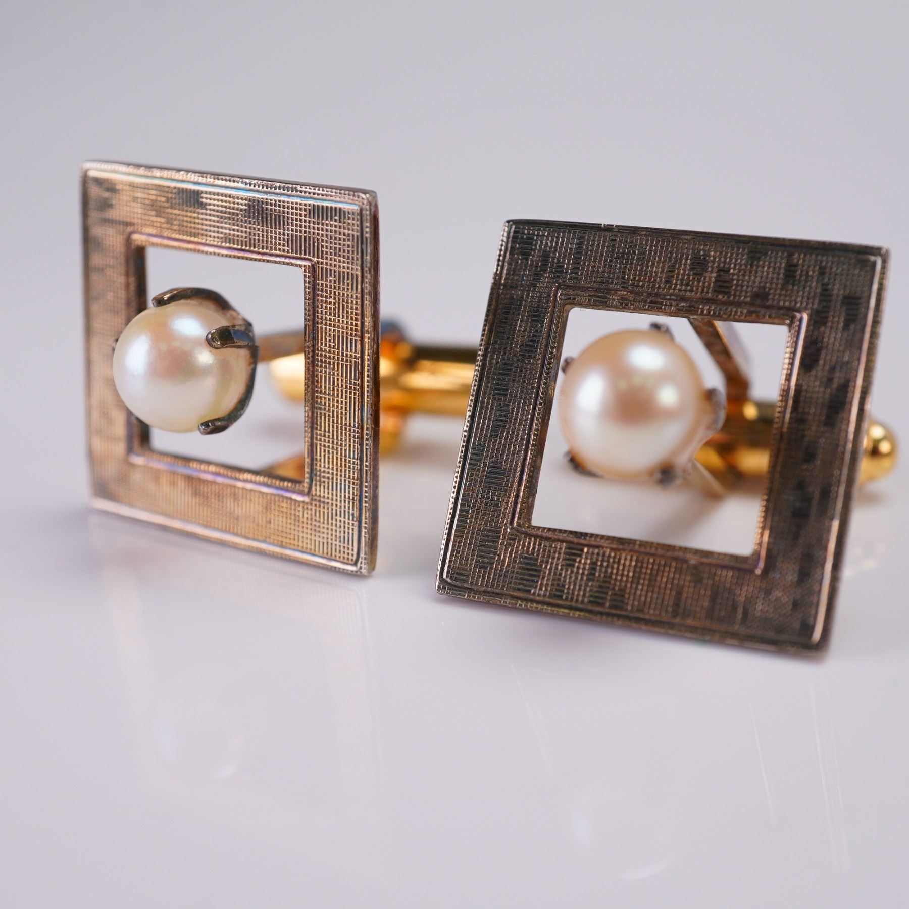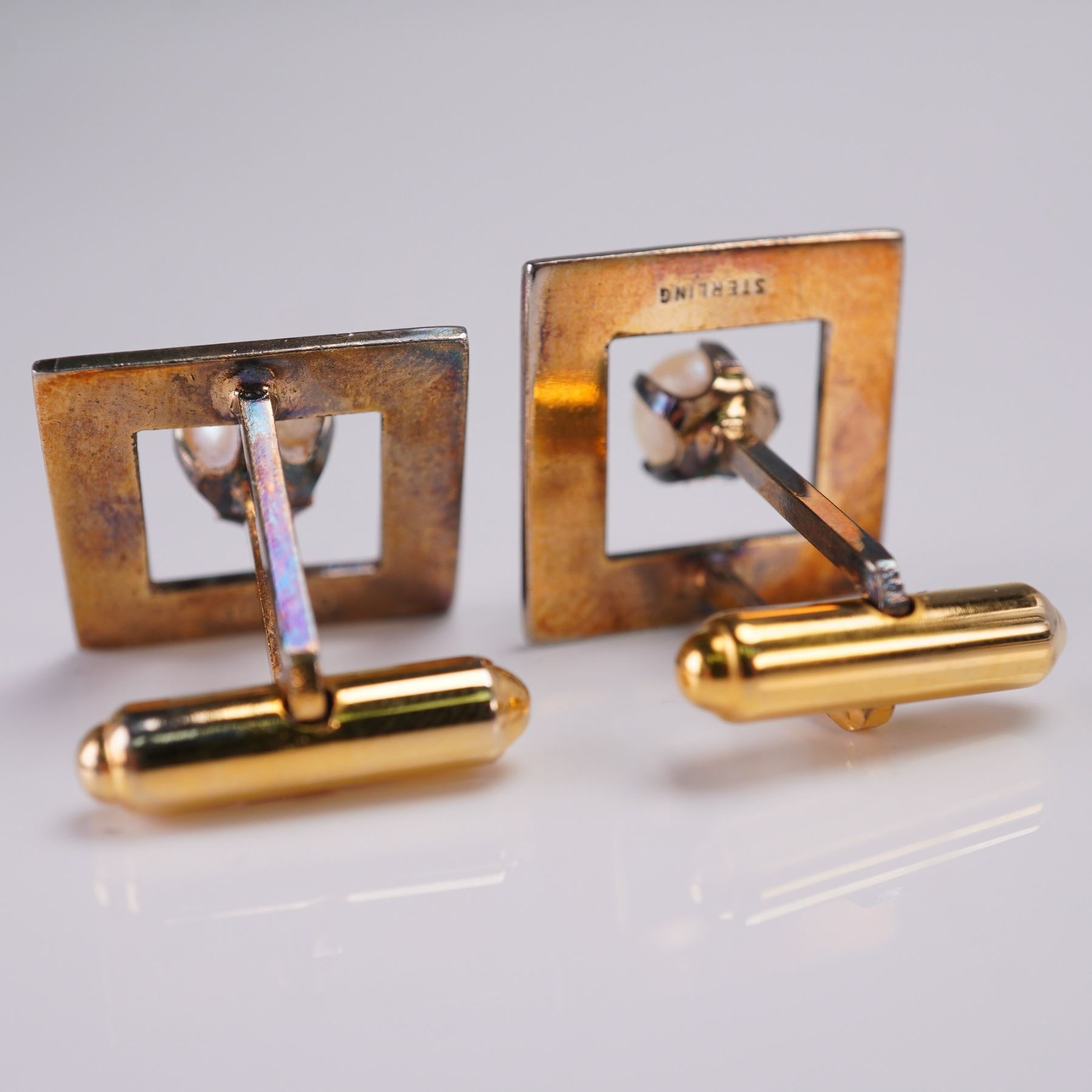 2 pairs: one set of gold tone post back earrings with faux pearl teardrops and rhinestones measuring 1.75"H, and one set of sterling cuff links with open square frames and center pearls, measuring 0.75"W and weighing 7.87 grams.