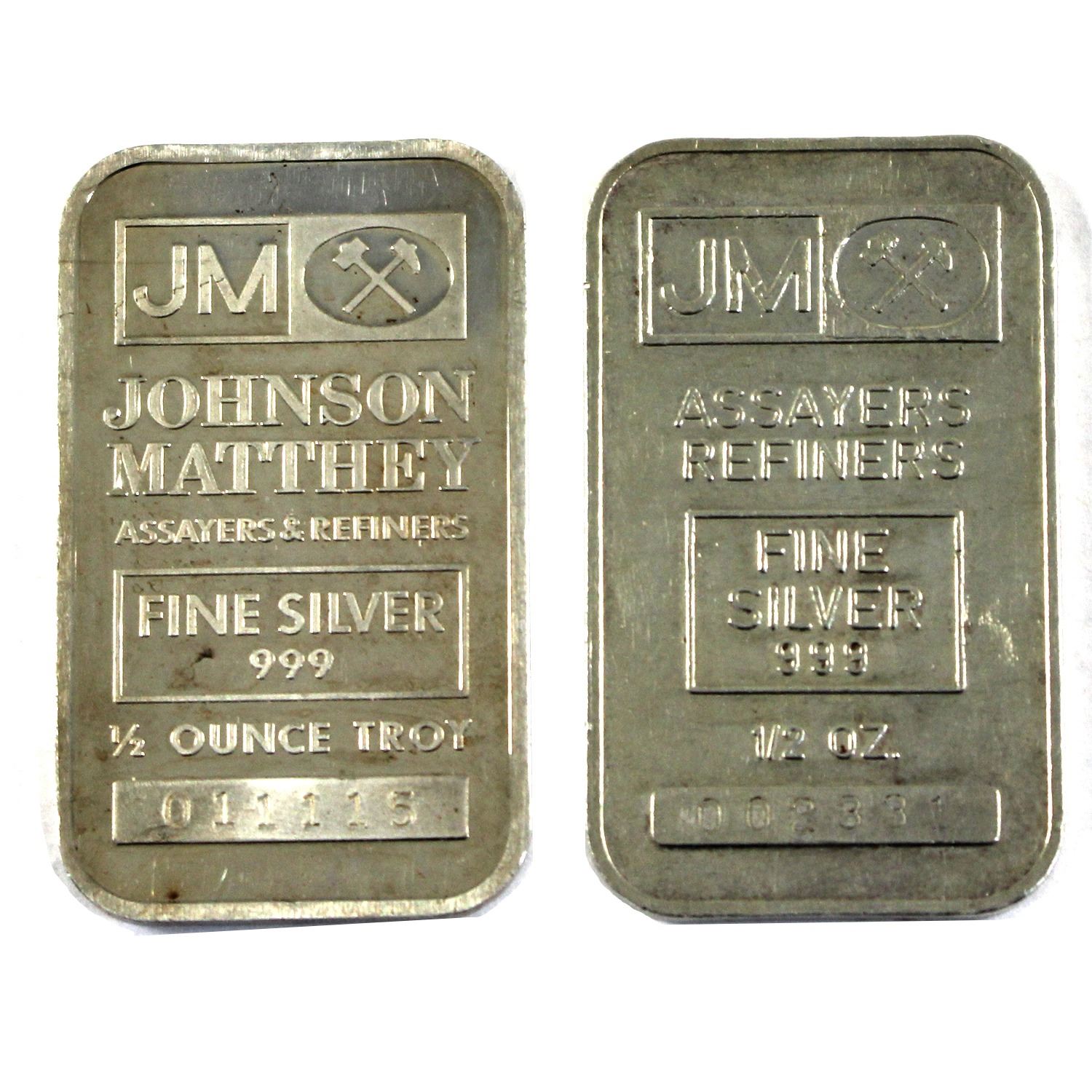 2x 1/2oz Johnson Matthey .999 Silver Bars. Lot Includes: Blank Back 002331, & JM Logo Back 011115. 2pcs. (Tax Exempt)