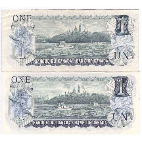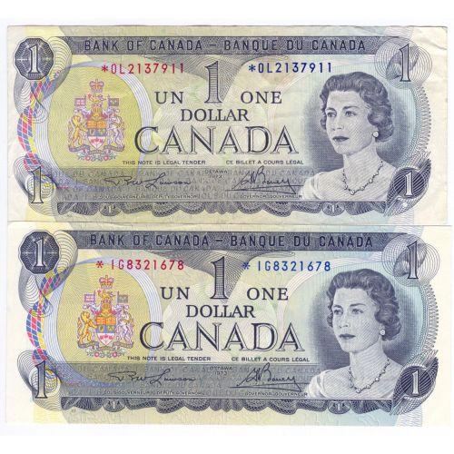 Bank of Canada, $1.00 Replacement note 1973, grade AU, Charlton # BC-46aA, signature Lawson Bouey, serial *IG8321678. $1.00 Replacement note 1973, grade VF, Charlton # BC-46aA, signature Lawson Bouey, serial *OL2137911. Lot of 2 notes.