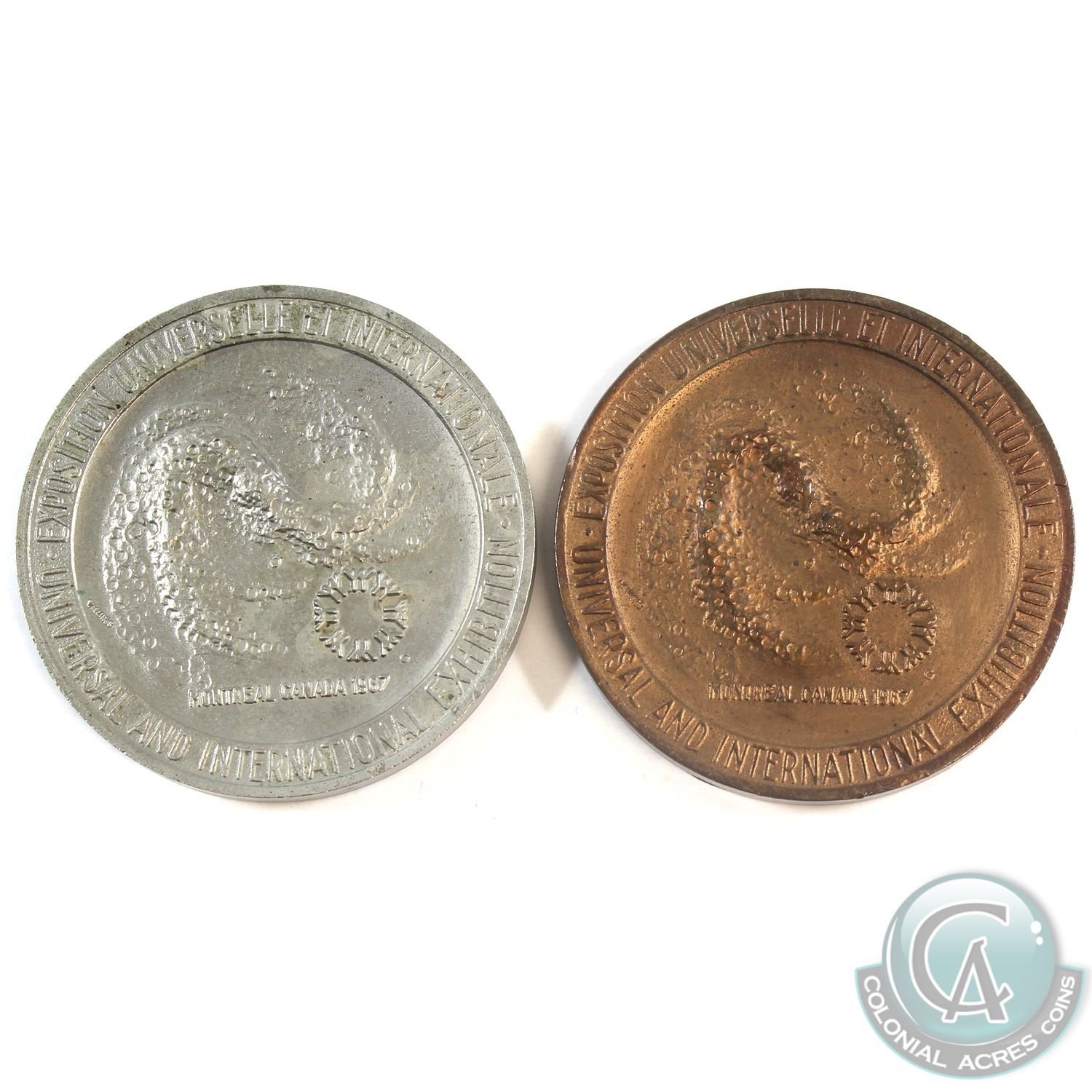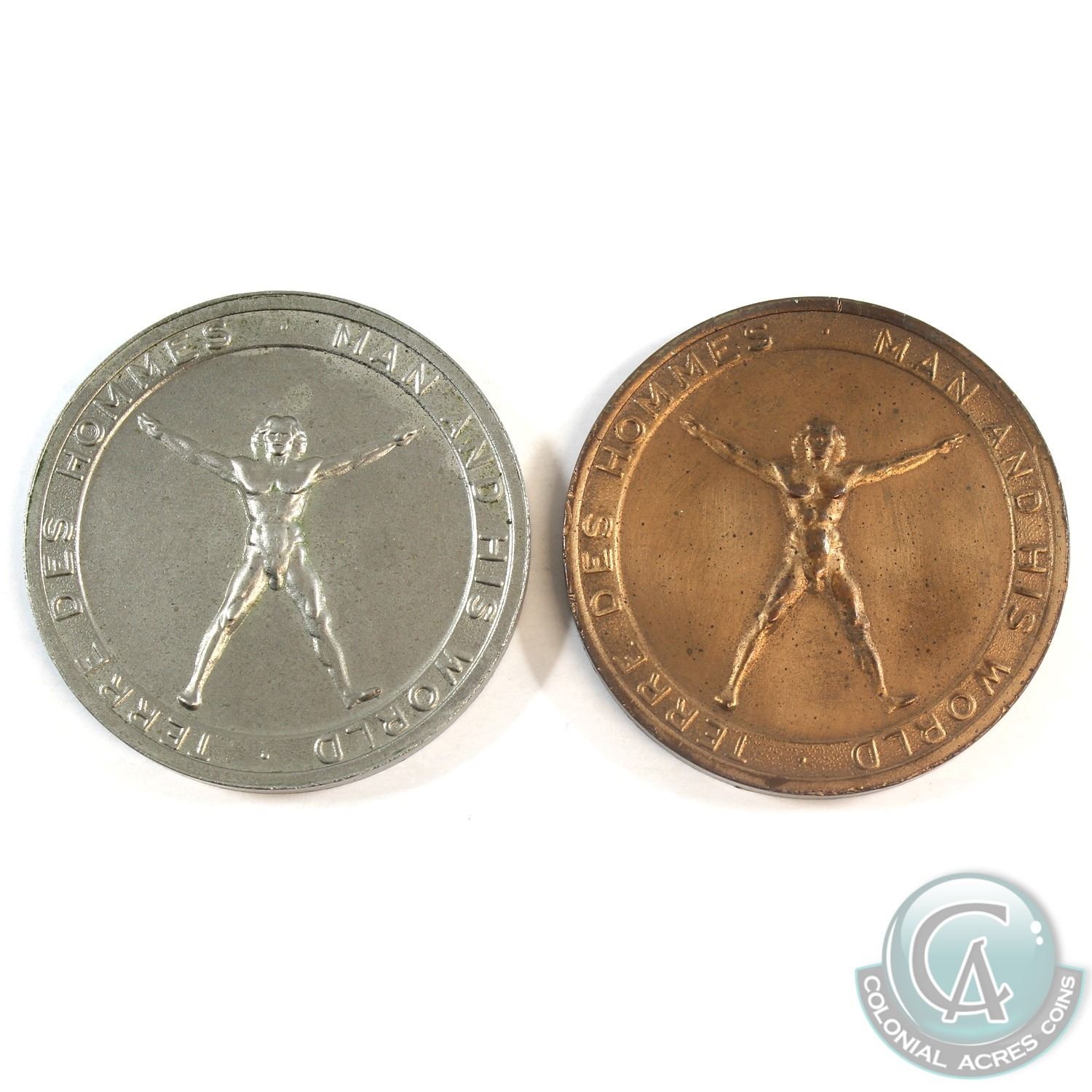 2x 1967 Montreal 'Man and His World' Universal and International Exhibition Medals. You will receive a copper or bronze and white metal version of this medal. Both 39mm diameter. 2pcs