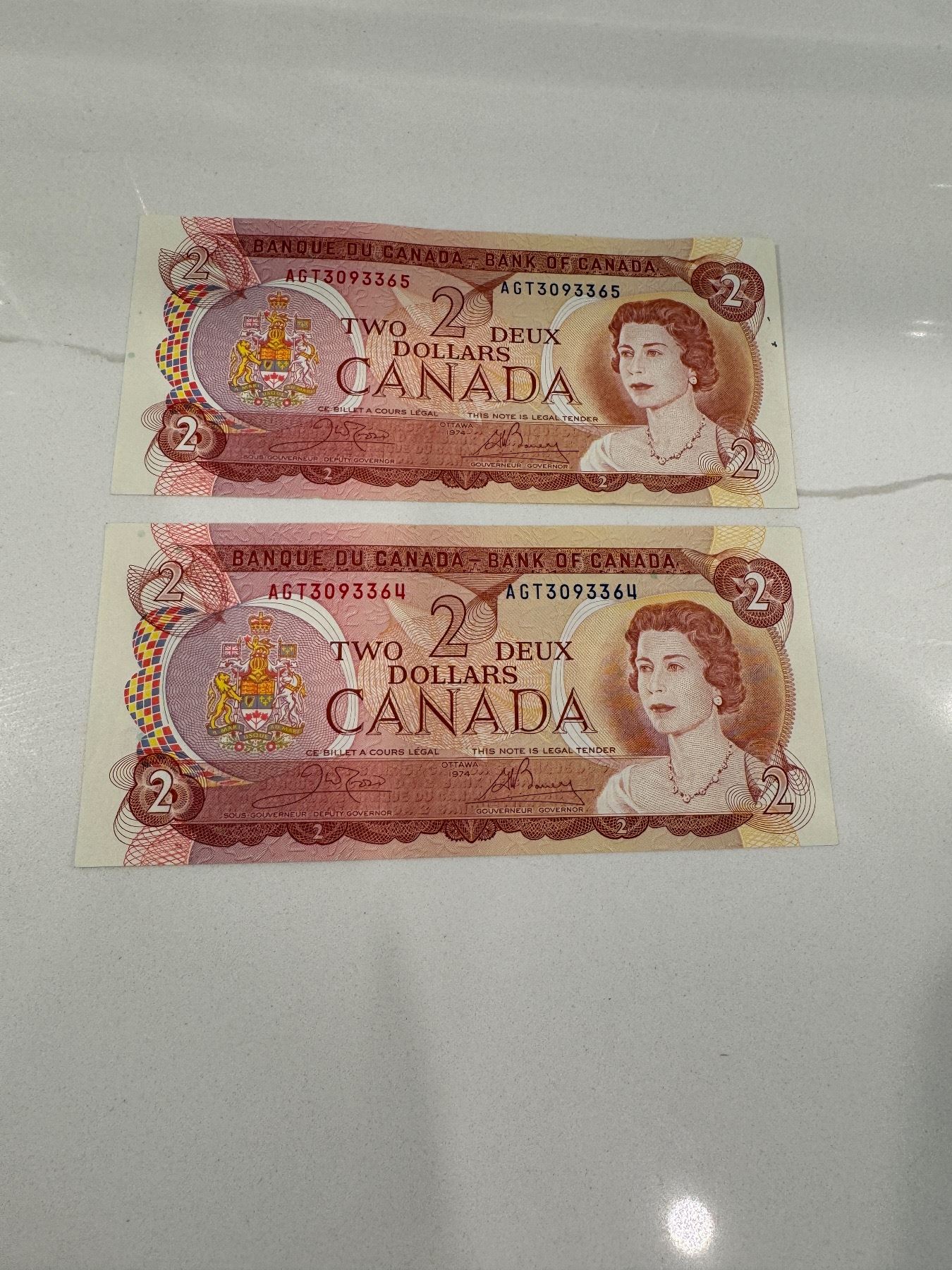 2x 1974 Canada $2 bills sequential