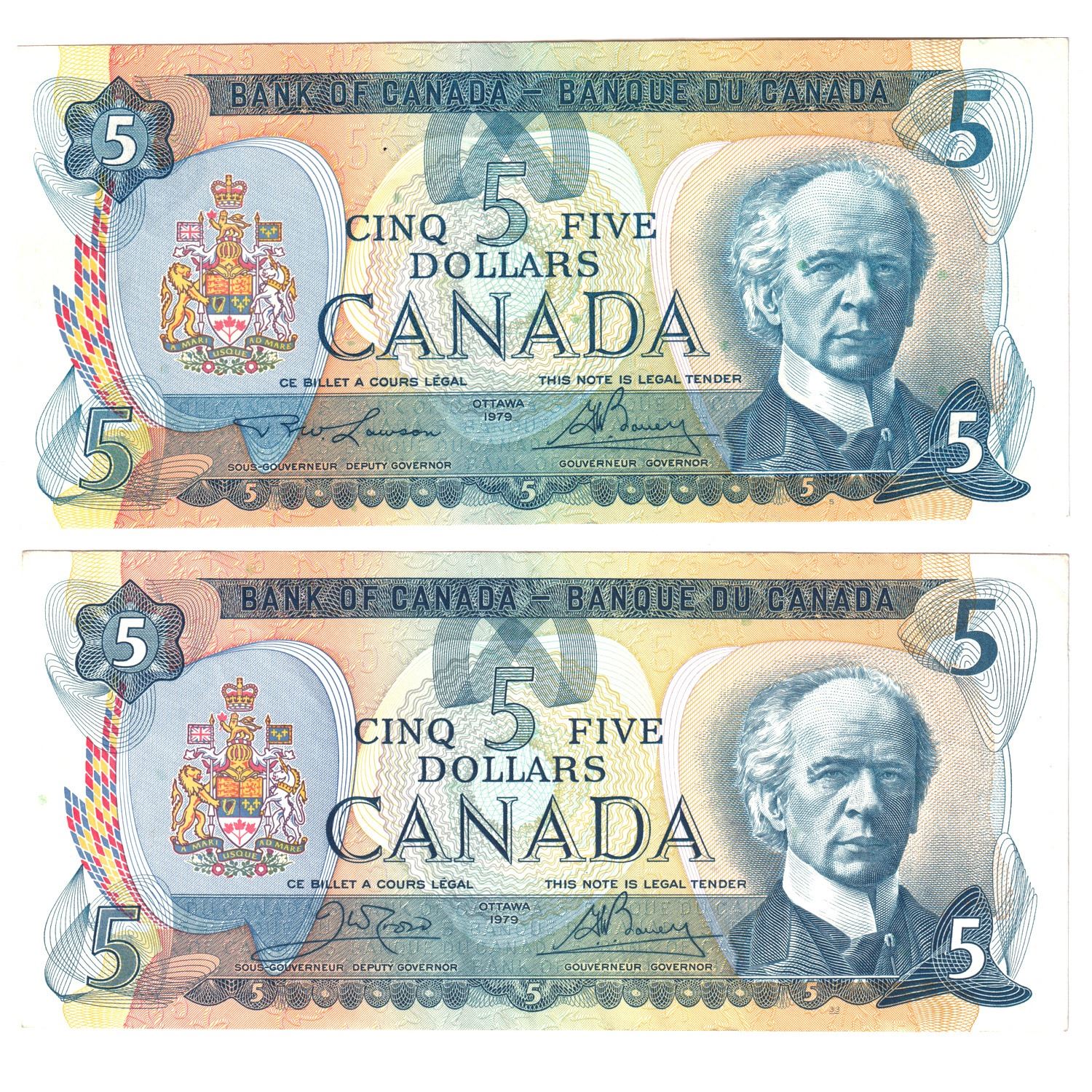 2x 1979 Bank of Canada $5 Notes - BC-53a Lawson-Bouey. S/N: 30040872565 About AU & BC-53b Crow-Bouey. S/N: 30579323250 EF+ Condition. 2pcs