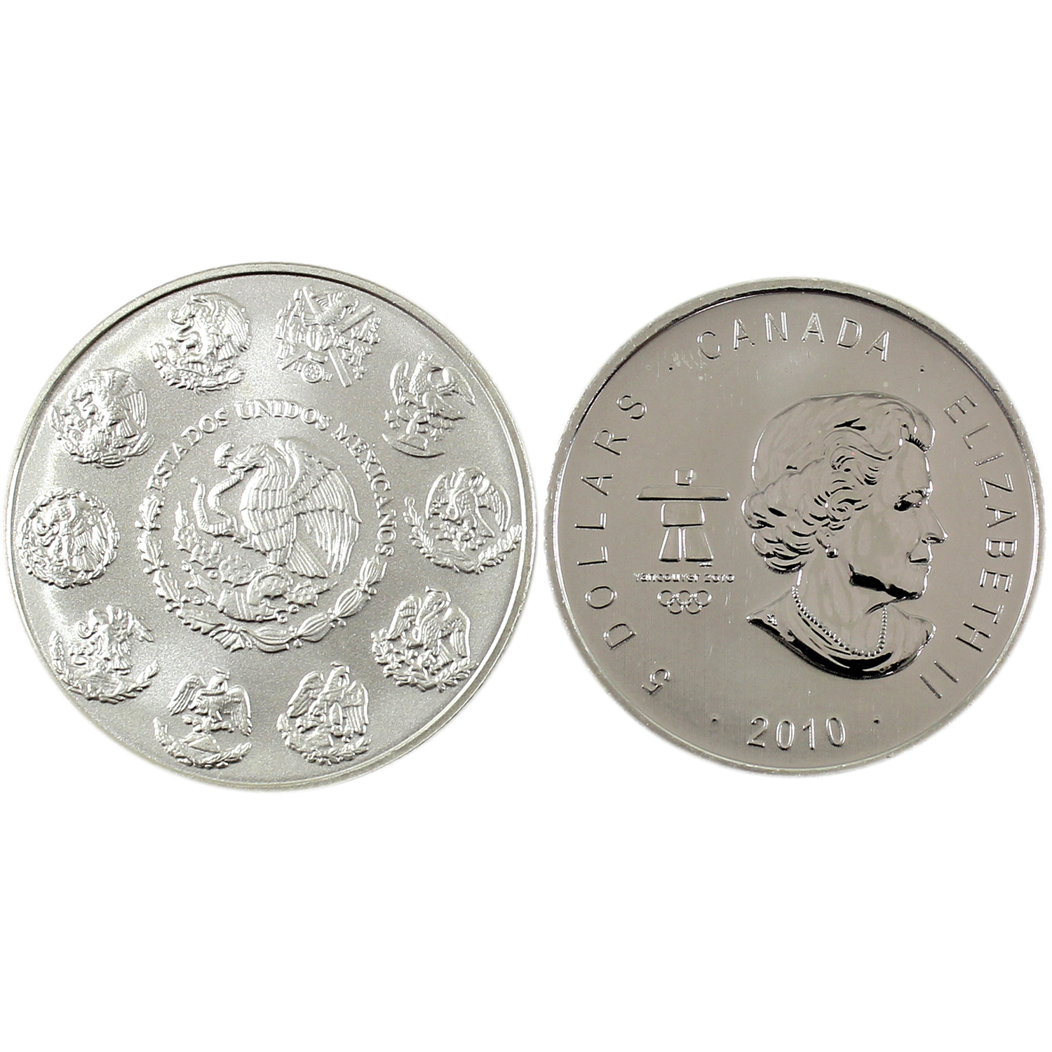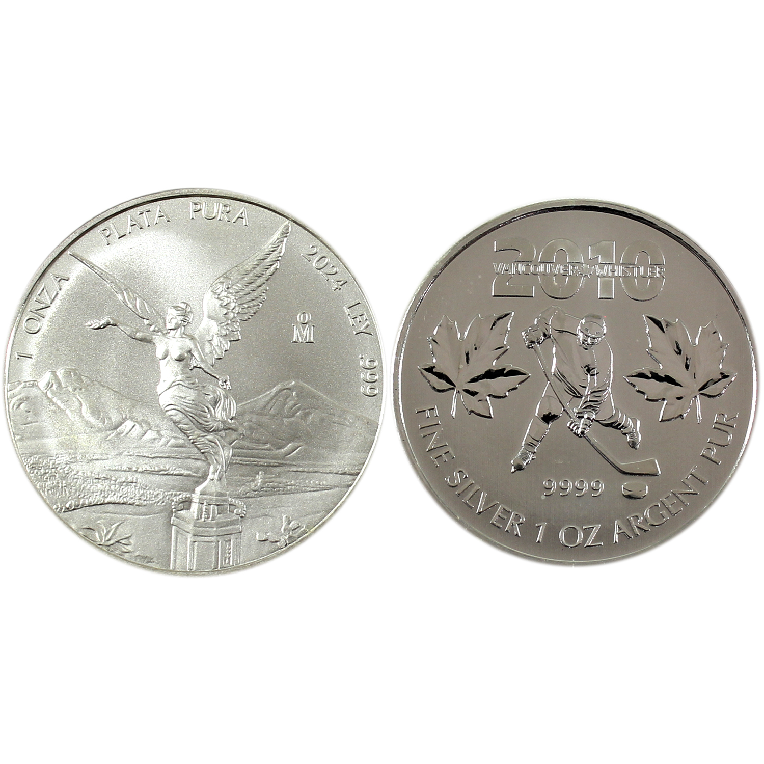 INCLUDES: Mexico 2024 Libertad .999 fine silver round, & Canada 2010 $5 Olympic Hockey .9999 fine silver round. 2pcs. (Tax Exempt)