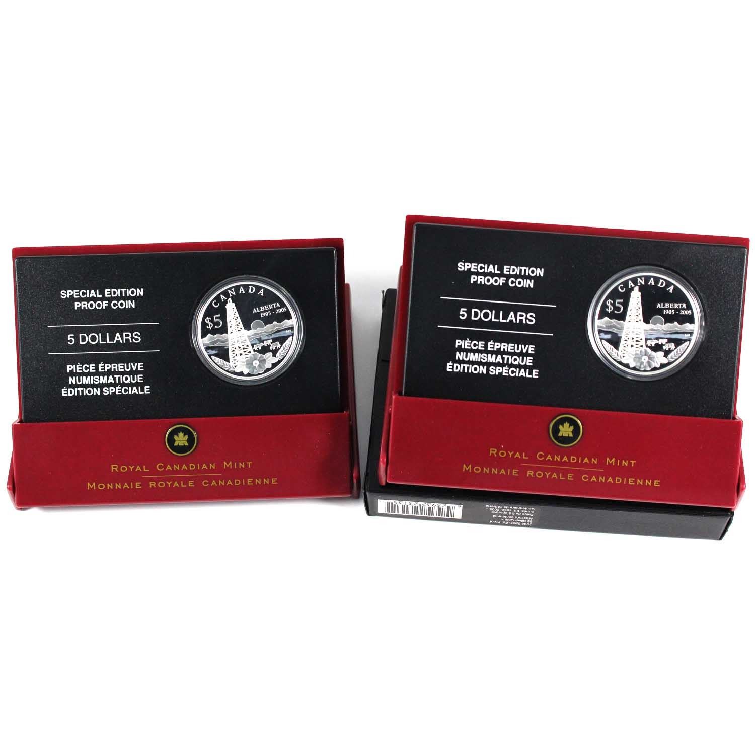 2x 2005 Canada $5 Alberta's Centennial Special Edition Fine Silver Coins (Capsules lightly scratched, one missing sleeve). 2pcs (TAX Exempt)