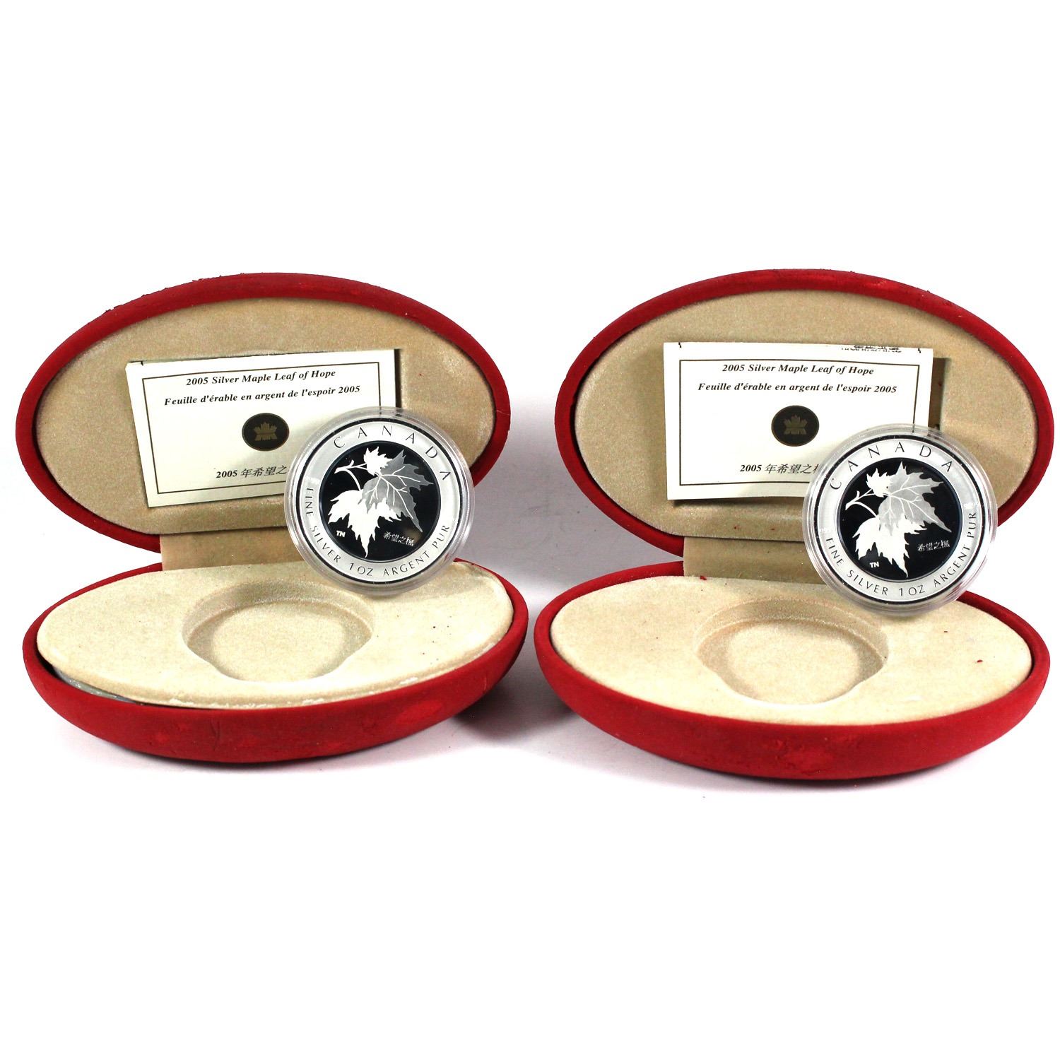 2x 2005 Canada $5 Maple of Hope Fine Silver Coins (Impaired display cases, one capsule scuffed and the other lightly scratched). 2pcs (TAX Exempt)