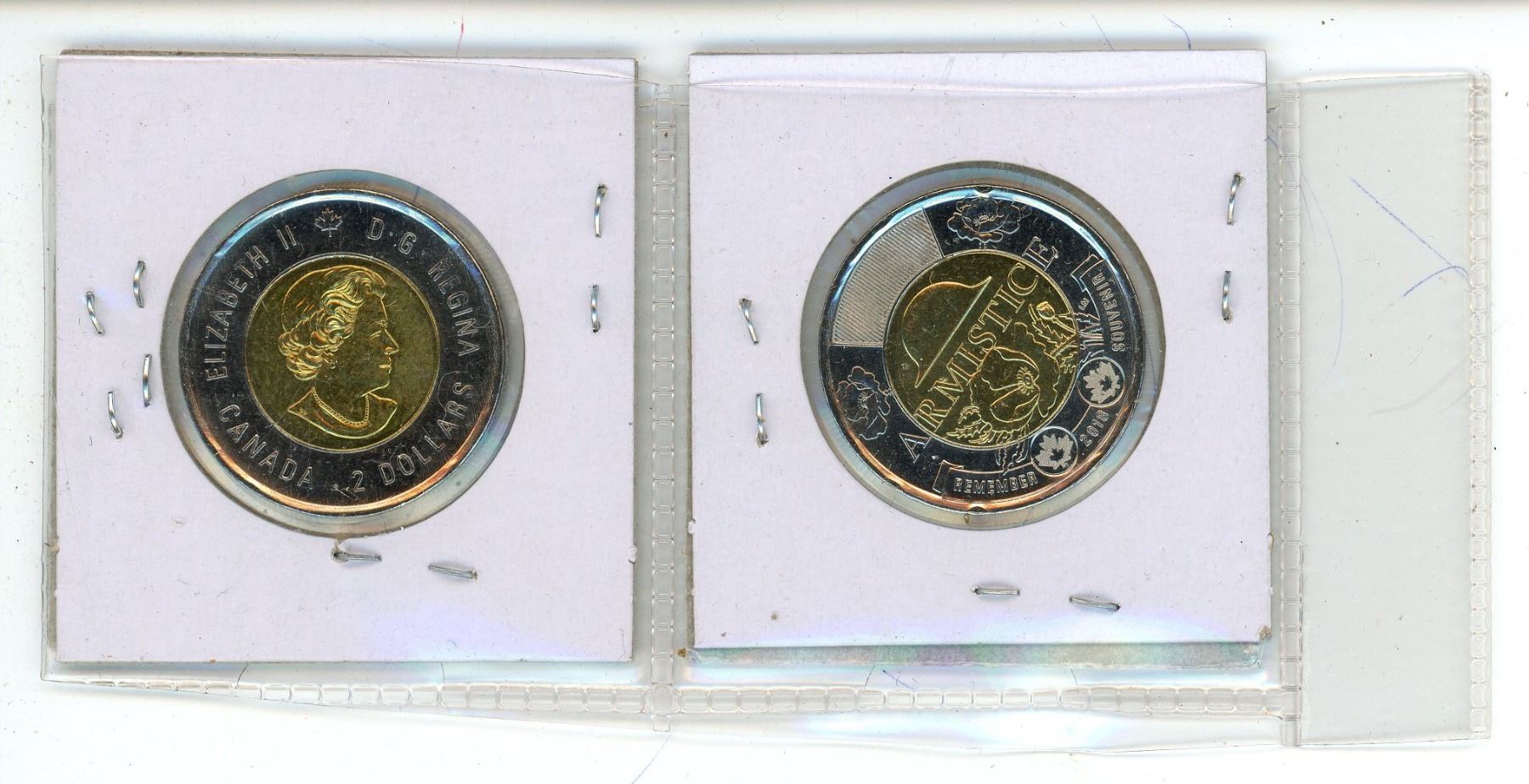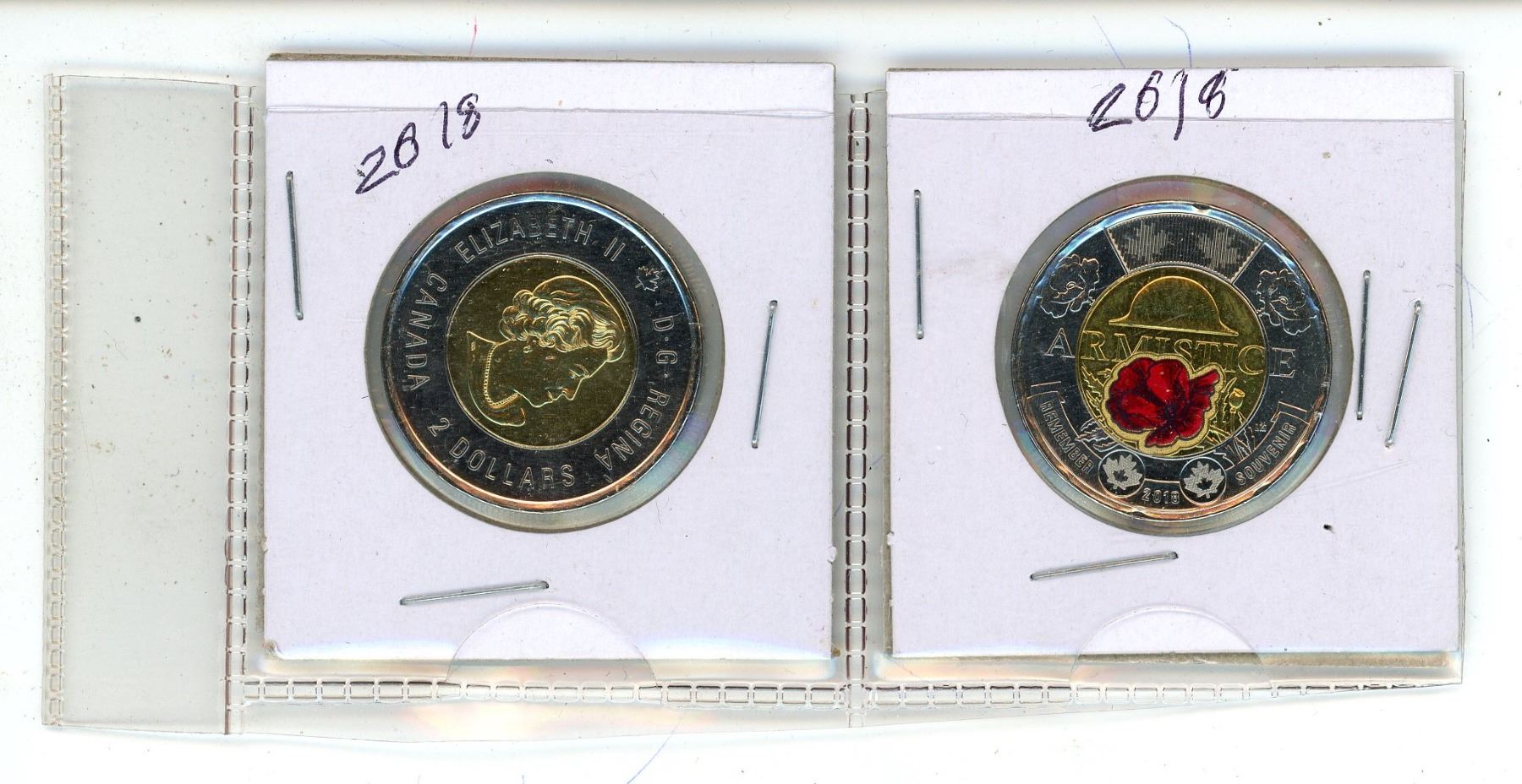 2x 2022 Canadian "Armistice" 2 dollar toonies - 1 colored
