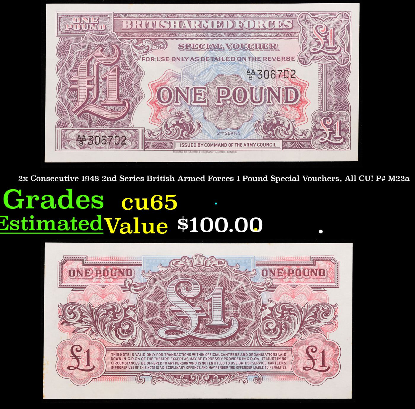 2x Consecutive 1948 2nd Series British Armed Forces 1 Pound Special Vouchers, All CU! P# M22a Grades Gem CU.