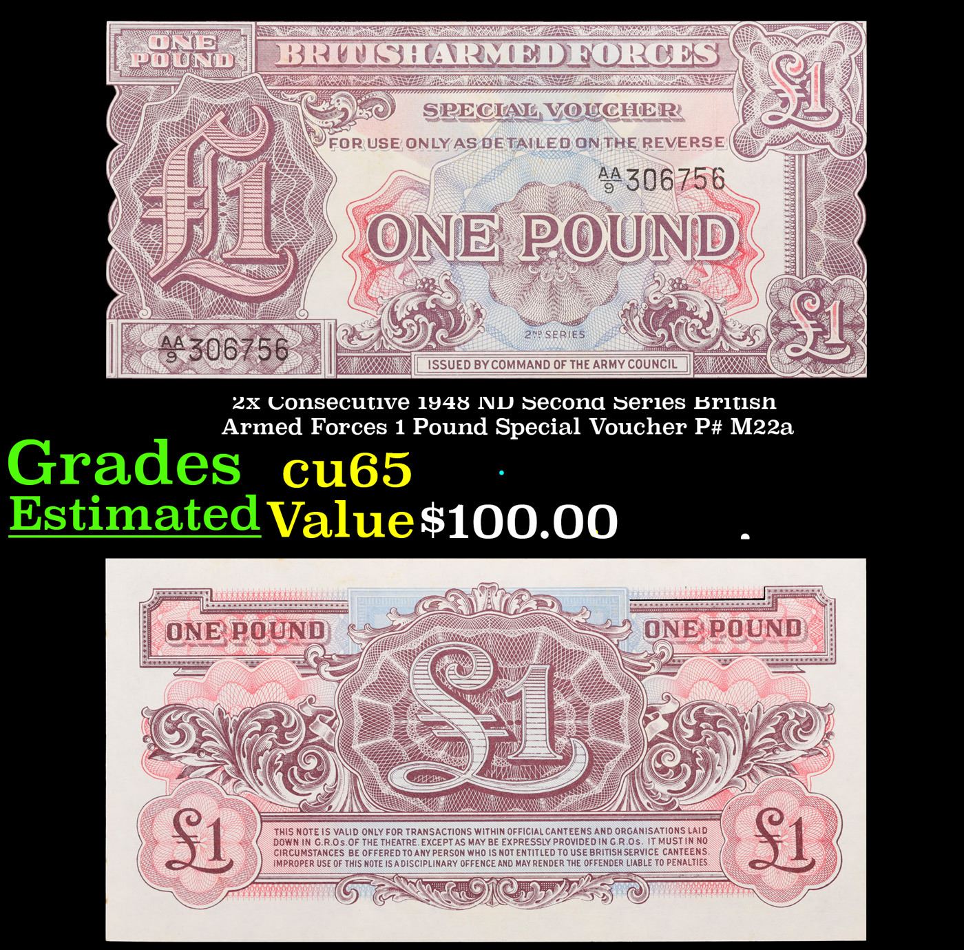2x Consecutive 1948 ND Second Series British Armed Forces 1 Pound Special Voucher P# M22a Grades Gem CU.