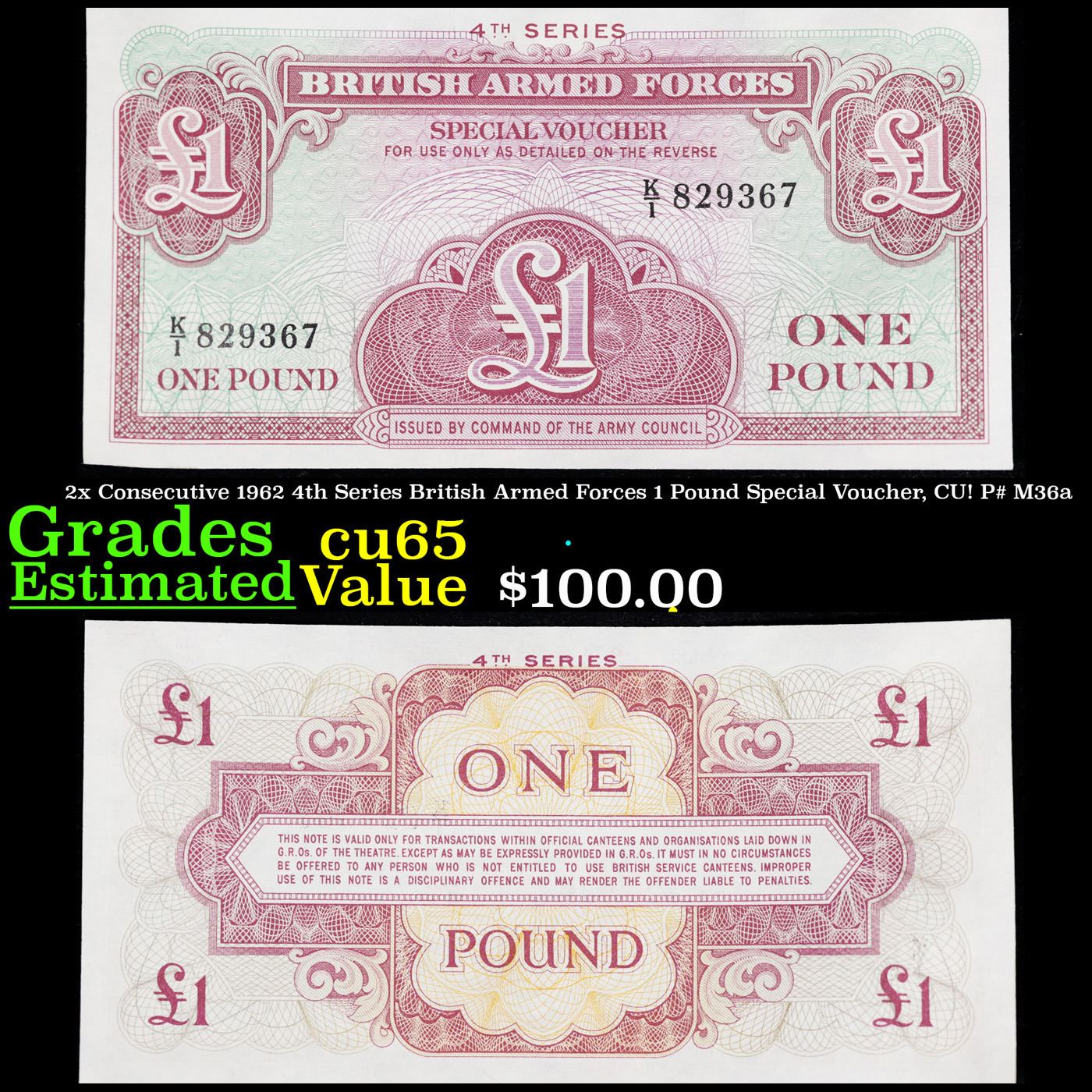2x Consecutive 1962 4th Series British Armed Forces 1 Pound Special Voucher, CU! P# M36a Grades Gem CU.